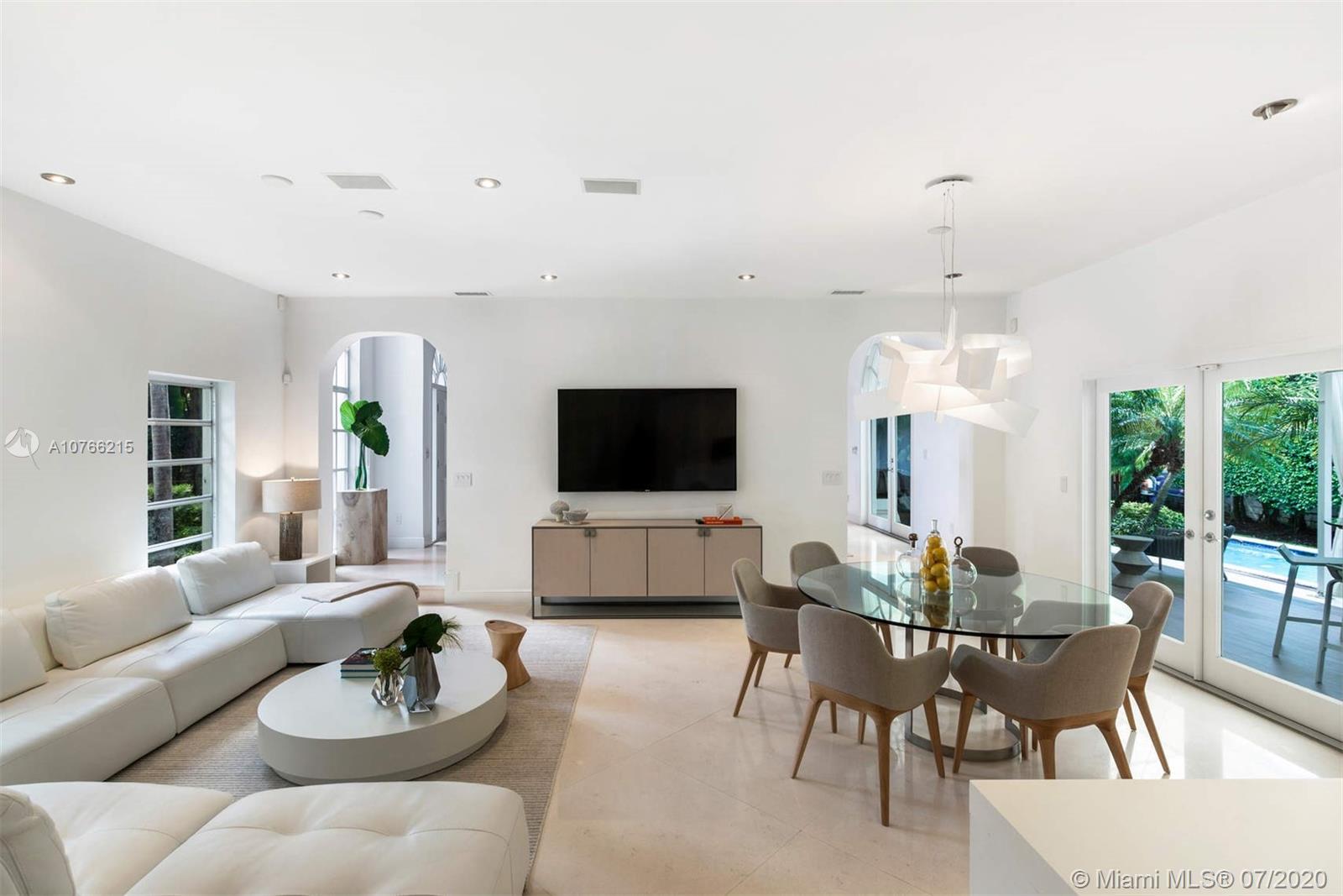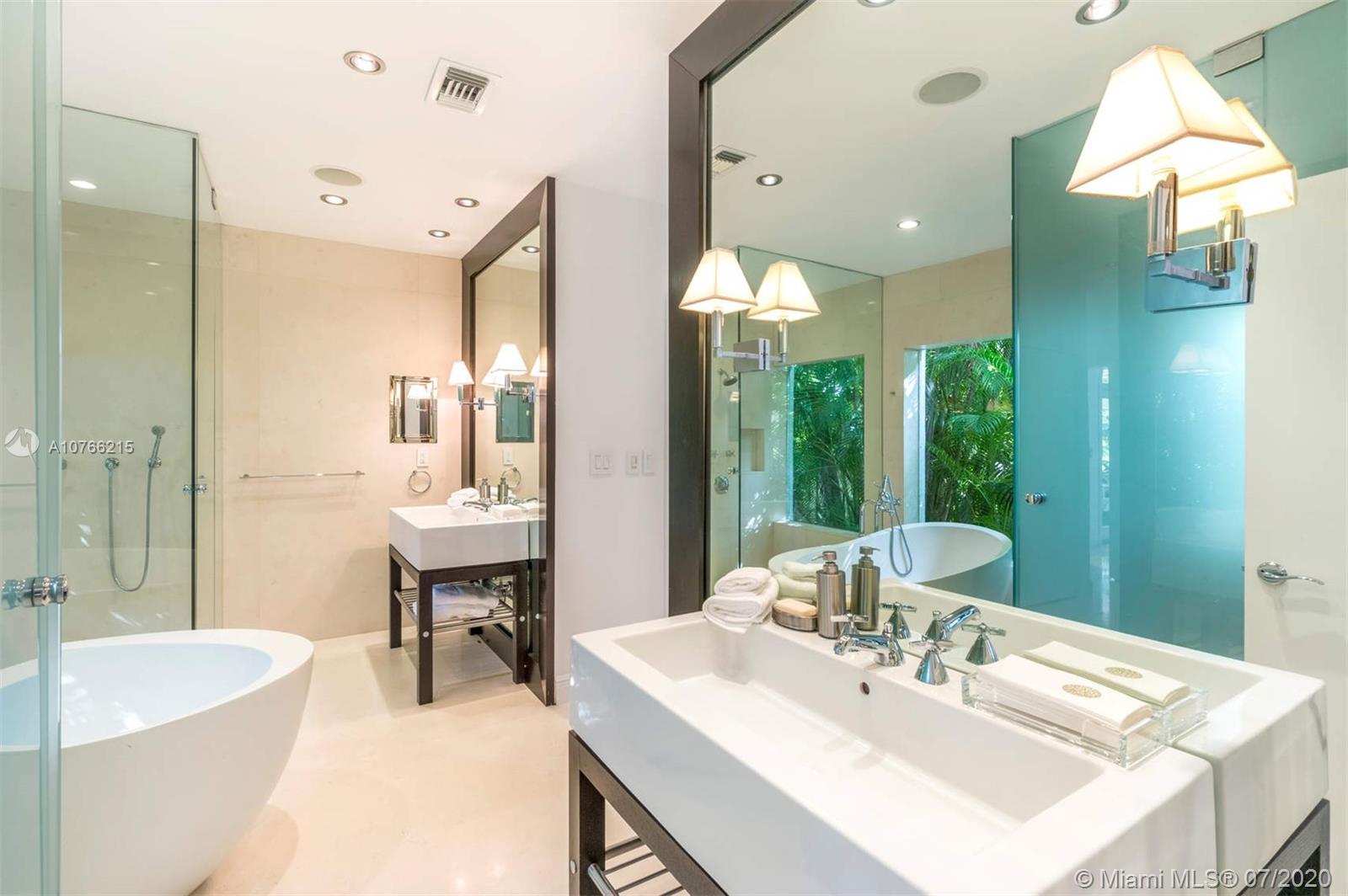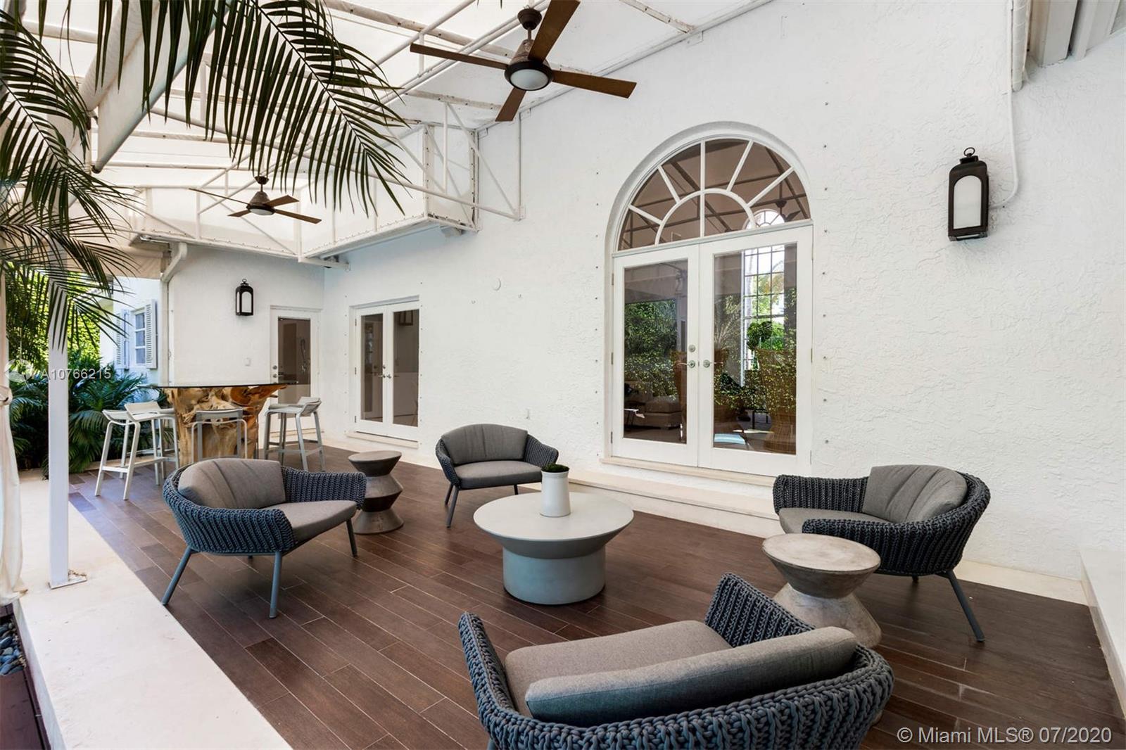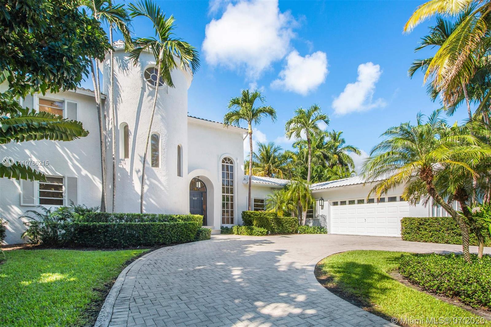 Nested in majestic royal palms, this architectural charmer is wrapped with mature hedges and tropical landscape. Enter to a 20FT ceiling atrium fit to expose impressive art collections. Great room includes a chef's kitchen by Boffi, Miele, Sub-Zero with gas range and designer hood system open to dining and living areas. Master suite sanctuary with private office on ground floor. Spa inspired Master Bathroom overlooking the lush gardens and resort style pool and patio areas. 2 guest bedrooms on the 2nd floor accessible by architectural stairway. Timeless design and modern comfort in a private island setting.