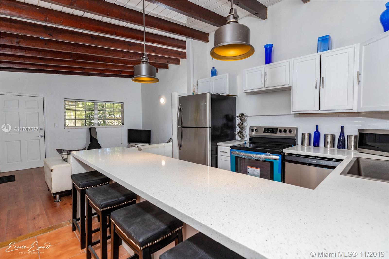 Newly renovated, beautiful 3 bedroom, 1 bath with office cove on quiet street in North Miami Beach. Brand new stainless steel appliances and energy efficient home. Lots of windows and light, Brand new AC, all new electrical panel, plus a new mini split unit for the back bedroom. Plumbing exists for a 2nd bathroom conversion in office cove. Beautiful exposed 12' wood ceilings, washer, dryer, great location, jogging trail, lime and mango trees. Close to I-95, shopping, parks and restaurants.