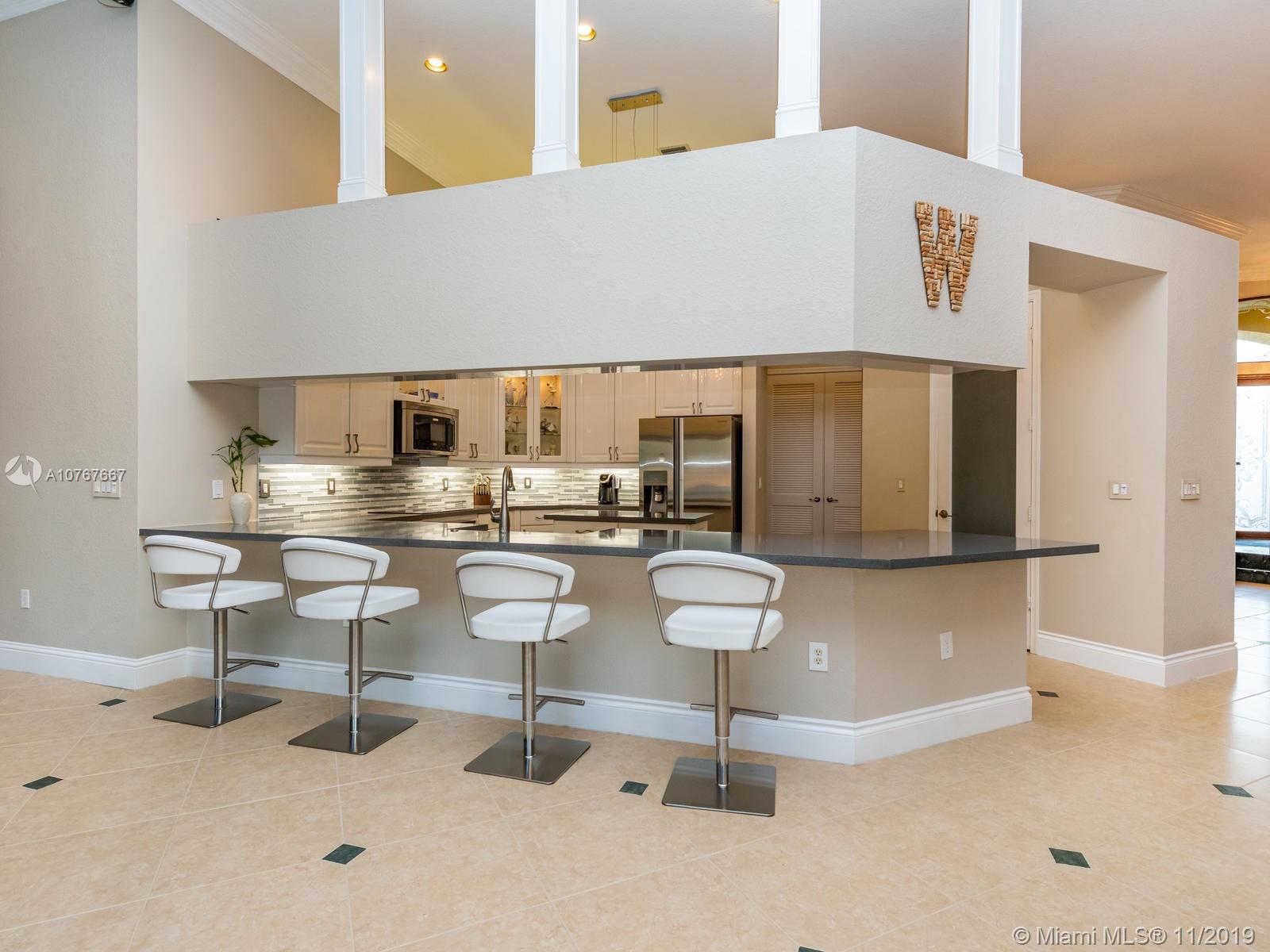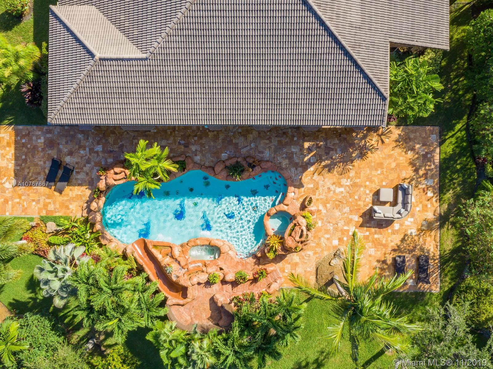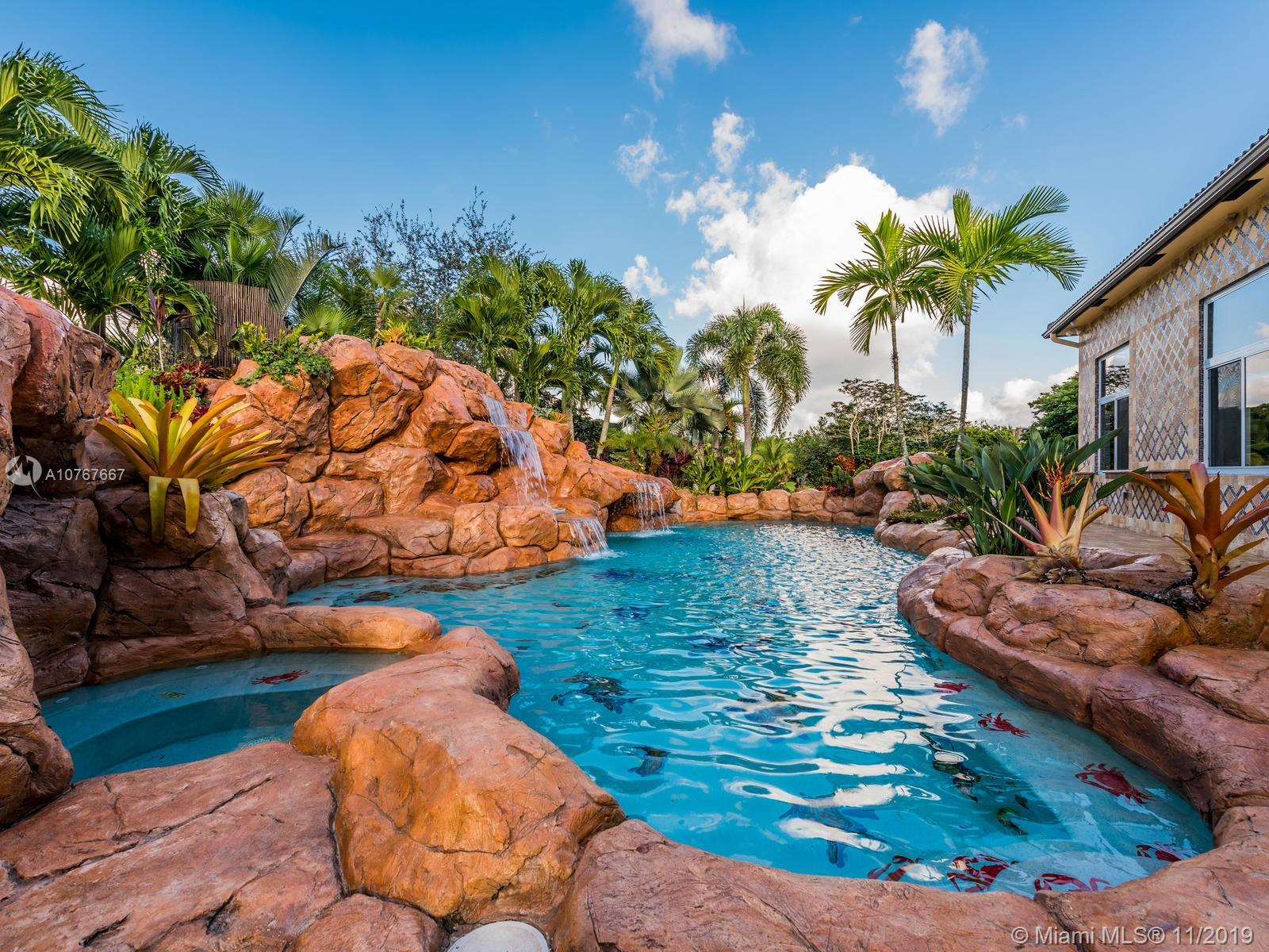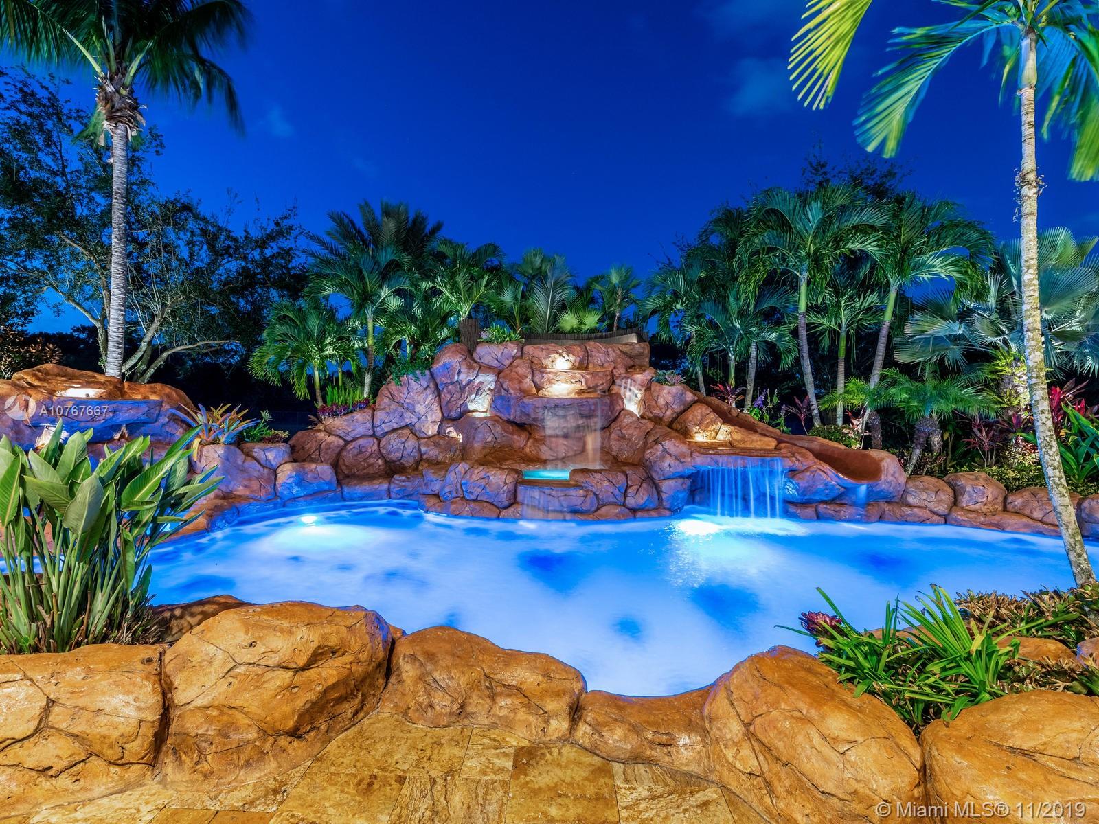 Hanover model cul-de-sac home situated on 1.78 acres of tropical privacy landscaping w/water-views on 3 sides features a custom pool w/grotto, waterfalls, 2 hot tubs, waterslide & lighting, all controlled by your phone. Gorgeous quartz counter top kitchen, center island & butlers pantry, step down full bar, mahogany office built-ins, cabana bath, new flooring in the master BR, custom walk-in closets & a completely upgraded gorgeous master ensuite w/dual shower heads & separate entrances. Elaborate summer gas kitchen entertainment area w/3 wine refrigerators, pizza oven, 38" BBQ grill, flat-top stove, 2 refrig's, 2 TV's, ice-maker & sink. Marble foyer, gorgeous chandeliers, crown molding, tray ceilings, full house generator, 1000 gallon propane tank. Alarm. All impact windows and doors.