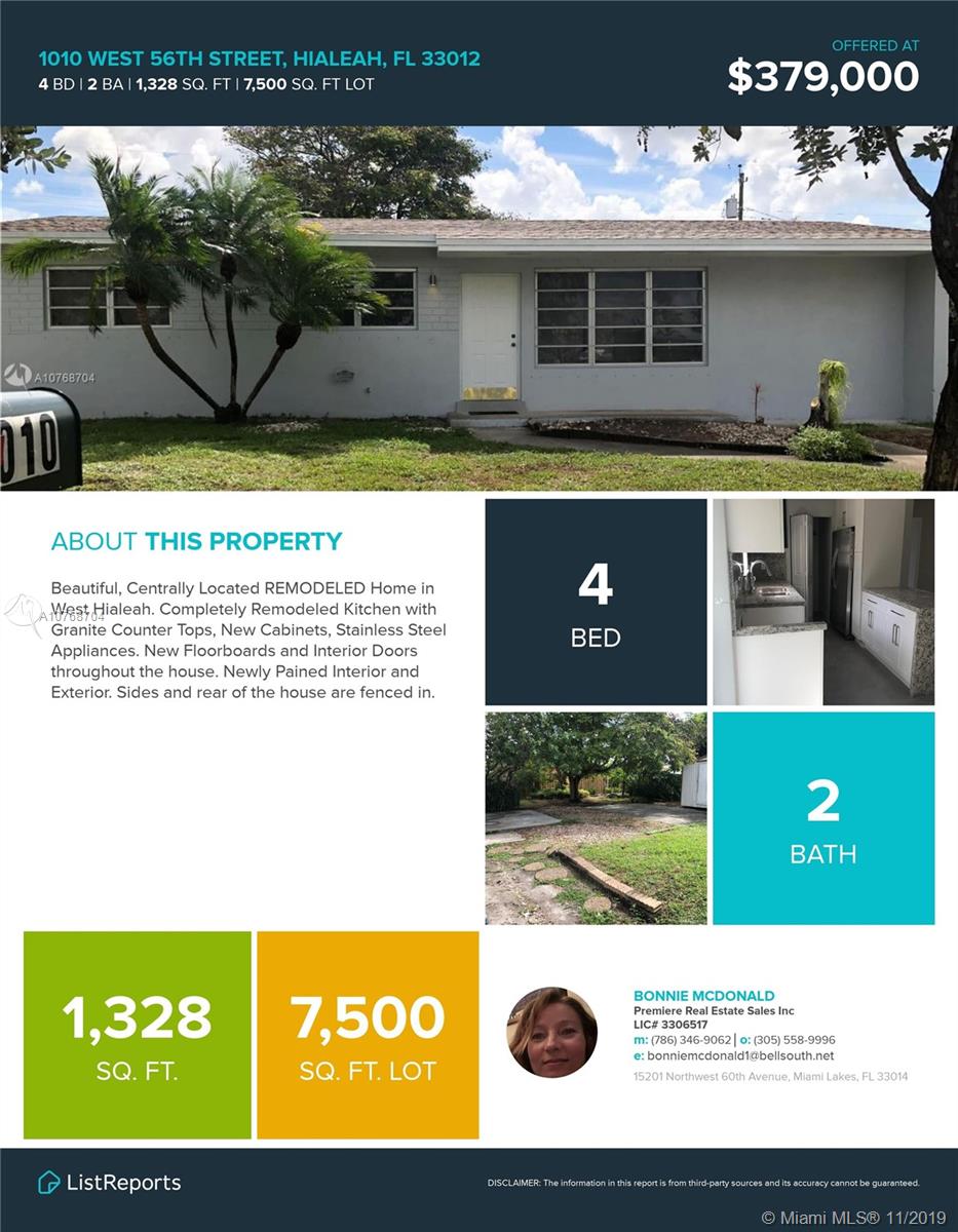 Beautiful, Centrally Located REMODELED Home in West Hialeah. Completely Remodeled Kitchen with Granite Counter Tops, New Cabinets, Stainless Steel Appliances. New Floorboards and Interior Doors throughout the house. Newly Pained Interior and Exterior. Sides and rear of the house are fenced in. Living Area is larger than tax roll.