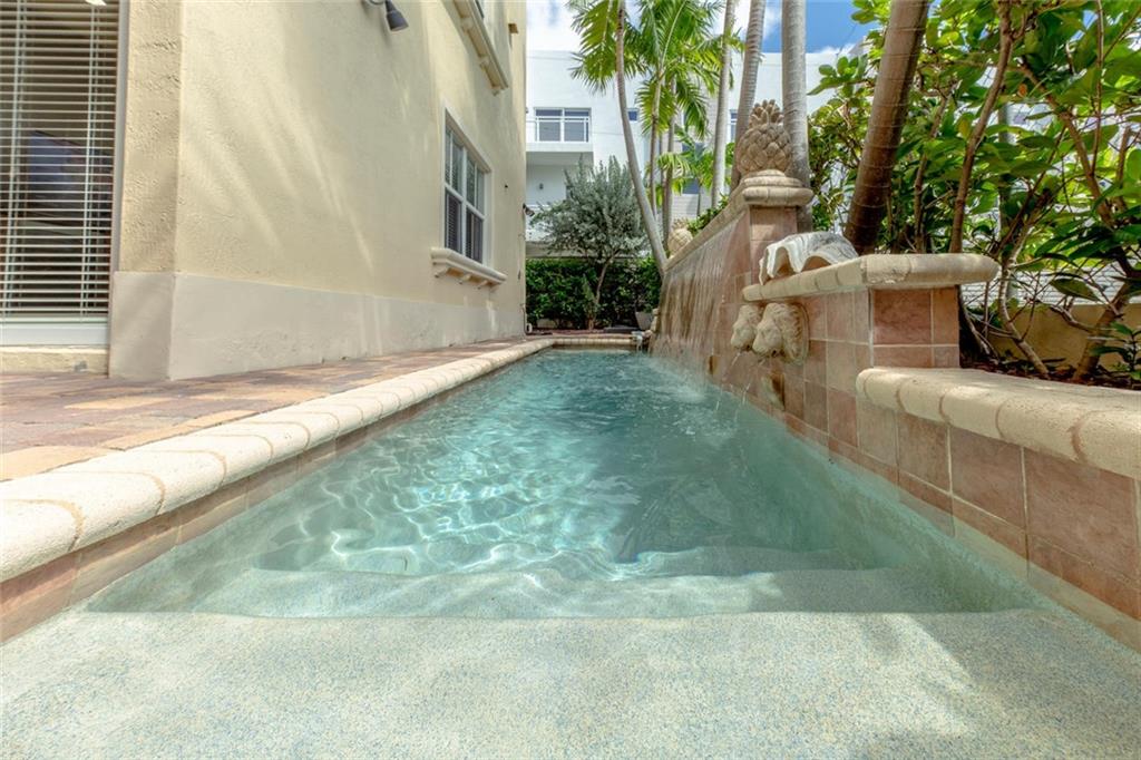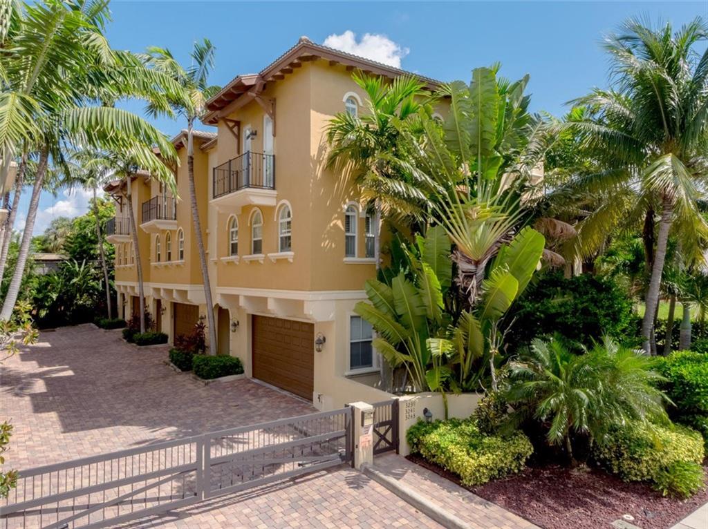 Rarely available gated 4/3.5, 2CG townhouse with elevator & a private pool w/ fountain. Sitting directly between the ICW and ocean, 6 homes in a private ocean-side community of Ocean Enclave. A few steps to the sand & everything at your fingertips to enjoy a South Florida lifestyle to the fullest. This shabby chic decorated home features an entry level private guest suite/den/pool cabana room/in-law suite with full bath, mini frig/wet bar and media area. Offering an elegant wood staircase or take your private elevator to make your way up to the 2nd floor huge open social area and gourmet kitchen. On the 3rd floor you will find a nicely sized 19x14 master bedroom w/ his and her closets, jacuzzi tub, shower and dual vanity. 2-bed / full bathtub/shower combo down the hall.