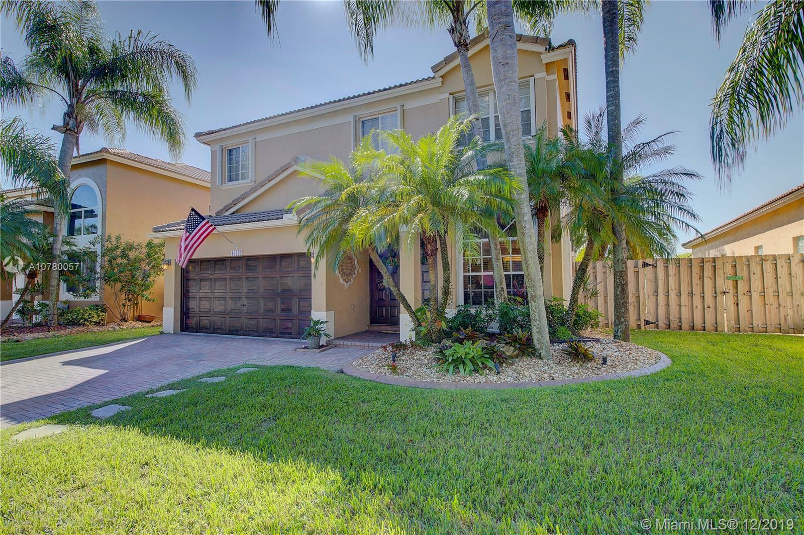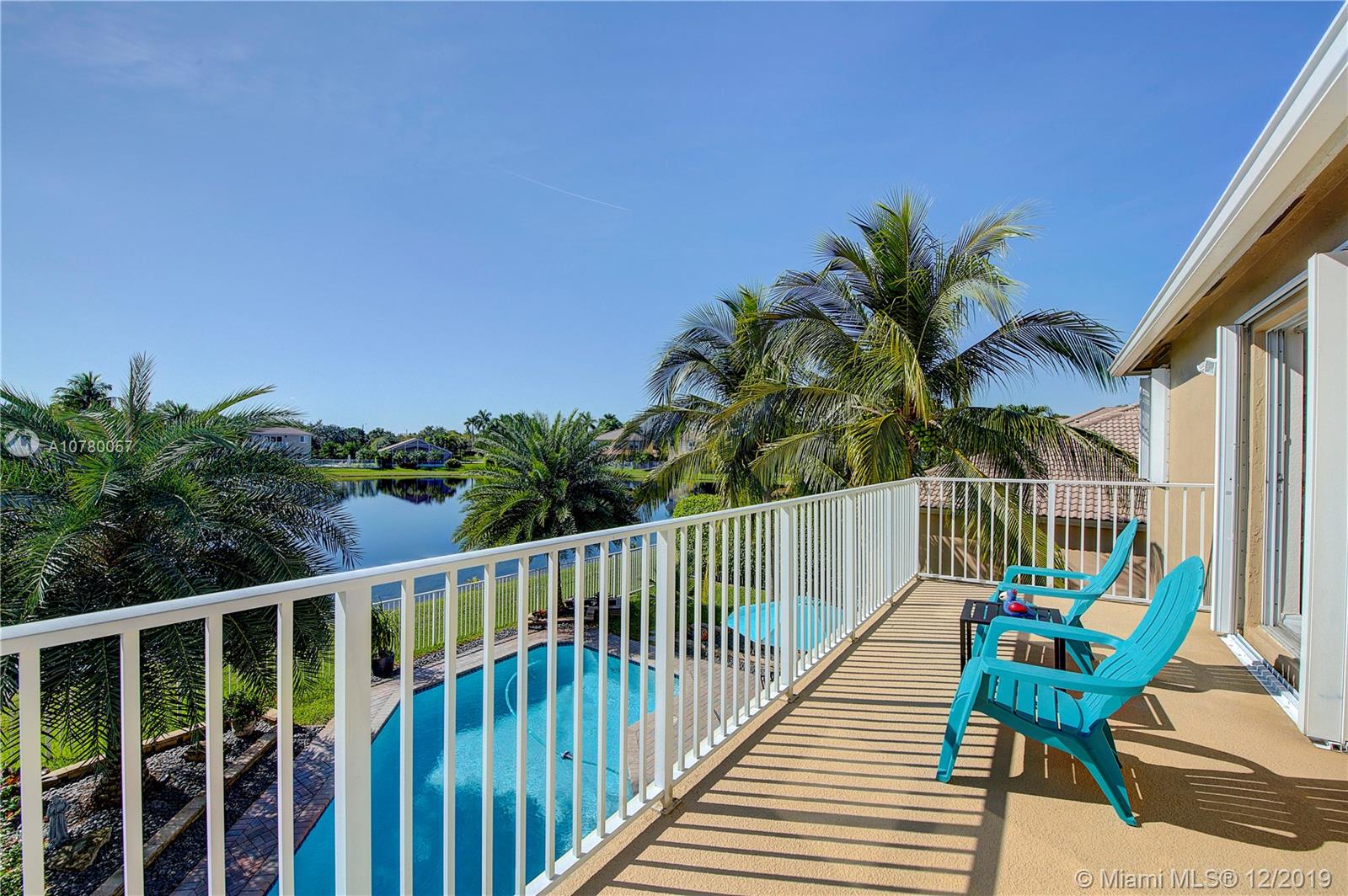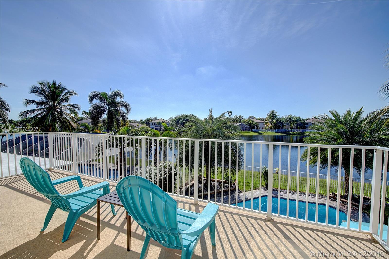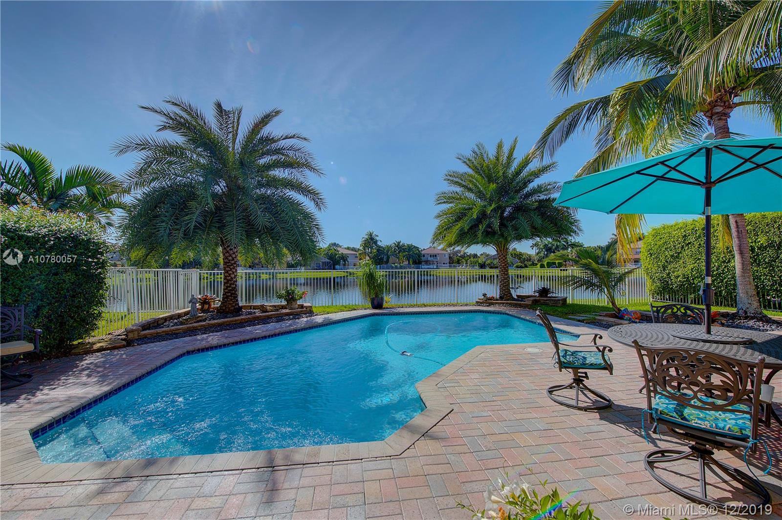 Grab your favorite beverage and enjoy the Sunrise and Sunsets from your master bedroom balcony overlooking wide lake views and your beautifully sparkling blue pool. Nestled in Ruby Cove at Emerald Estates, a gated Weston community, this 4 bedroom, 2 1/2 bath home is ready to move right in! Crown molding and upgraded baseboards throughout living area. Kitchen with granite and stainless appliances, open concept floor plan. Newer carpet, and tile flooring with interior neutral colors. Pool and Patio have a Sunsetter awning for the ultimate in comfort. Full Hurricane accordion shutters. Full service community includes lawn maintenance & cutting, fertilizing, tree/palm trimming, weed prevention, sprinklers, alarm system monitoring, cable TV and internet, as well as a community pool and gym.