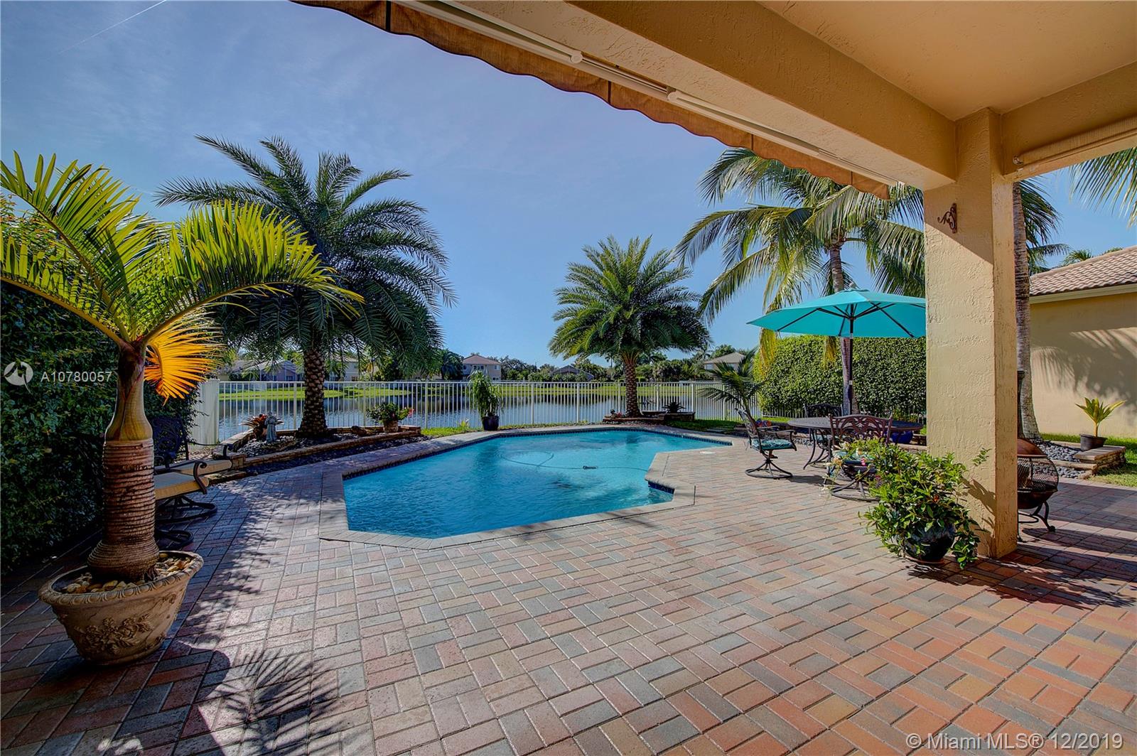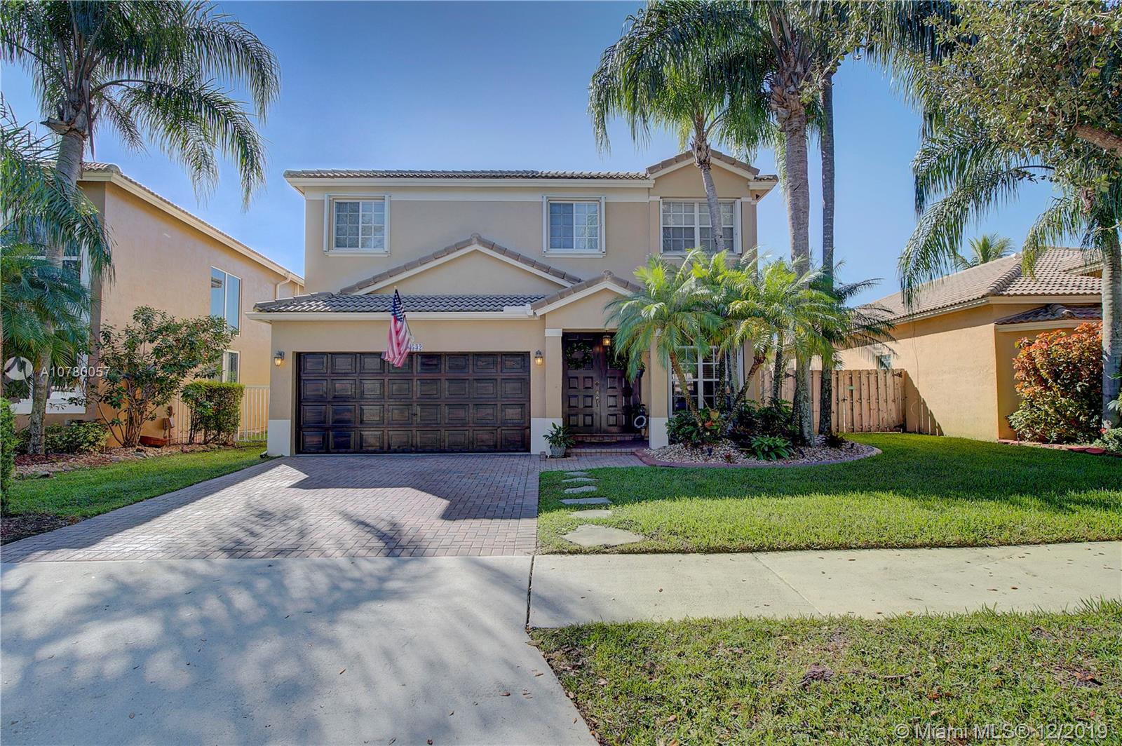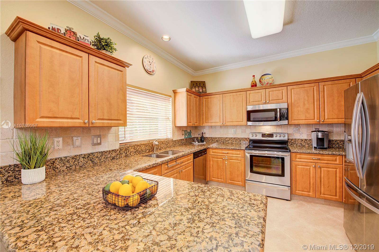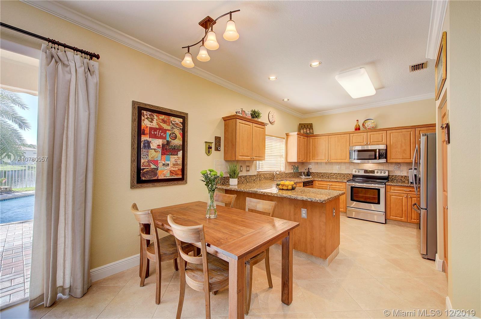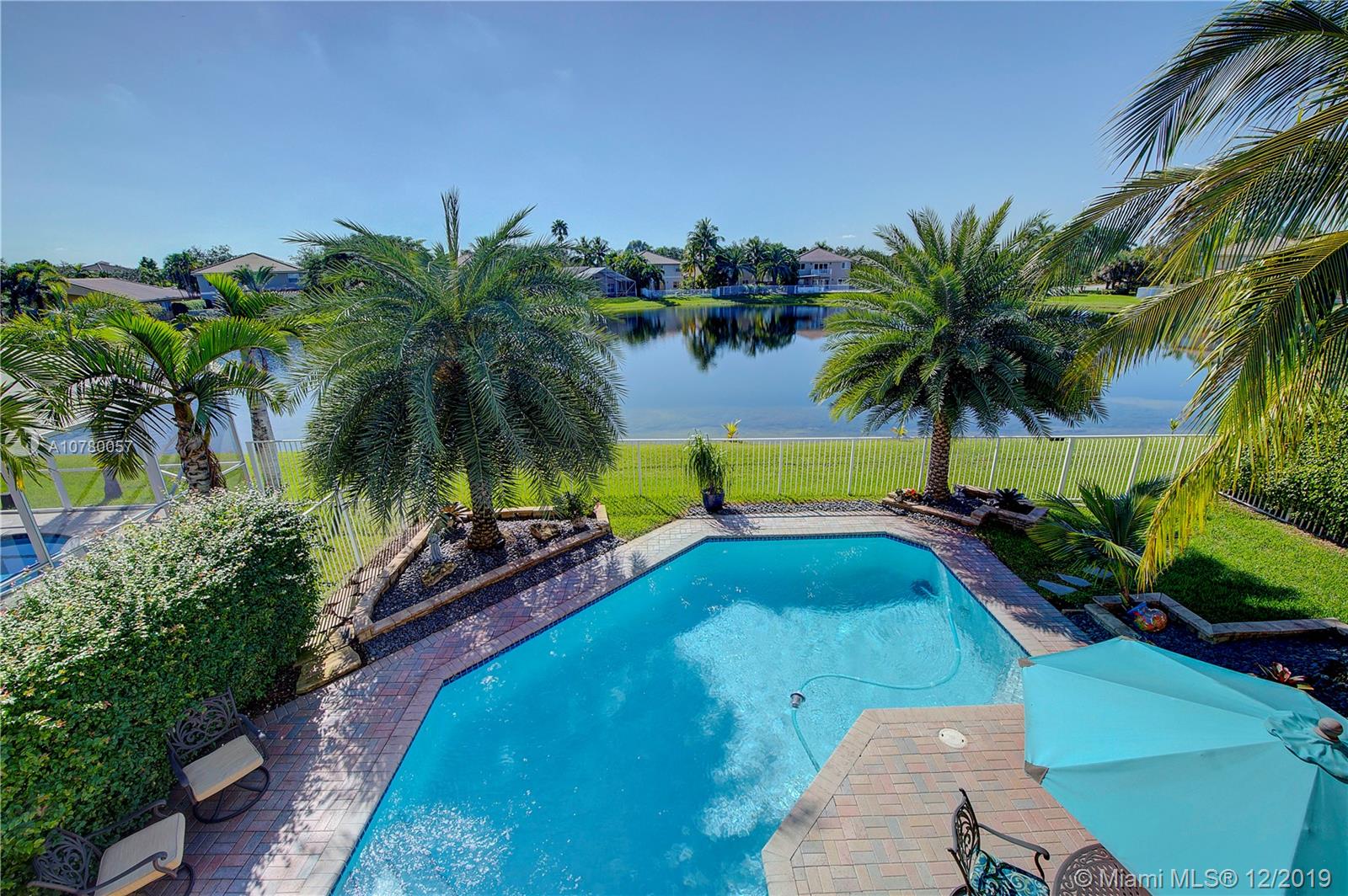 Grab your favorite beverage and enjoy the Sunrise and Sunsets from your master bedroom balcony overlooking wide lake views and your beautifully sparkling blue pool. Nestled in Ruby Cove at Emerald Estates, a gated Weston community, this 4 bedroom, 2 1/2 bath home is ready to move right in! Crown molding and upgraded baseboards throughout living area. Kitchen with granite and stainless appliances, open concept floor plan. Newer carpet, and tile flooring with interior neutral colors. Pool and Patio have a Sunsetter awning for the ultimate in comfort. Full Hurricane accordion shutters. Full service community includes lawn maintenance & cutting, fertilizing, tree/palm trimming, weed prevention, sprinklers, alarm system monitoring, cable TV and internet, as well as a community pool and gym.