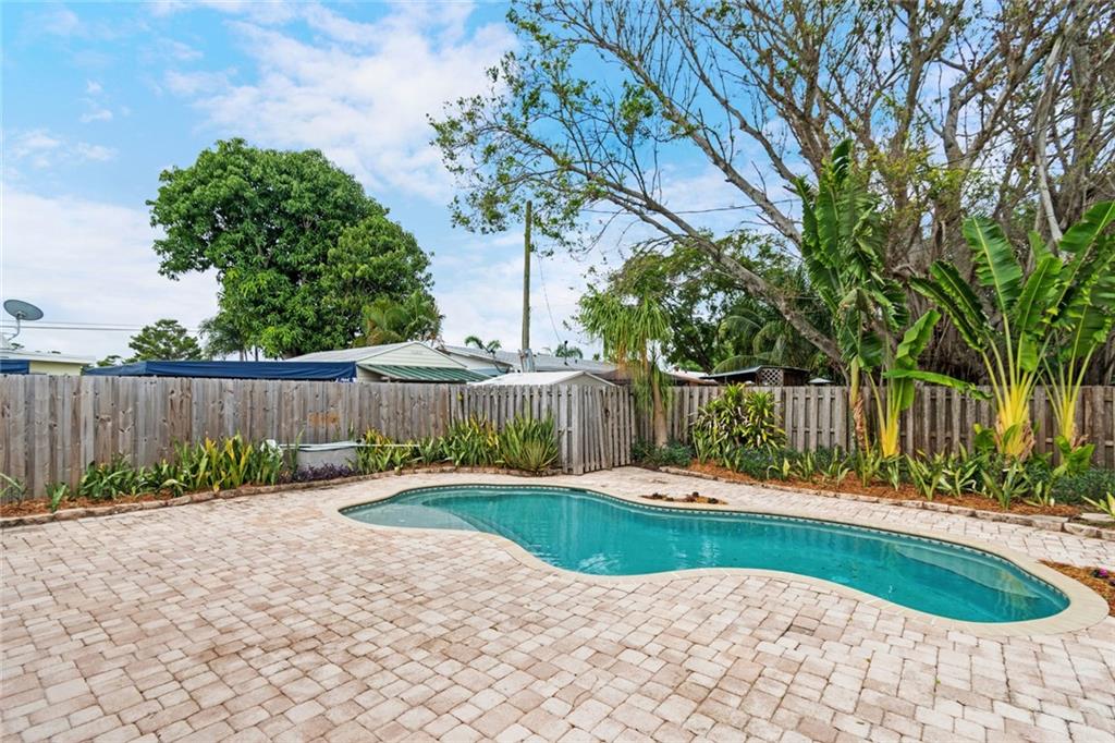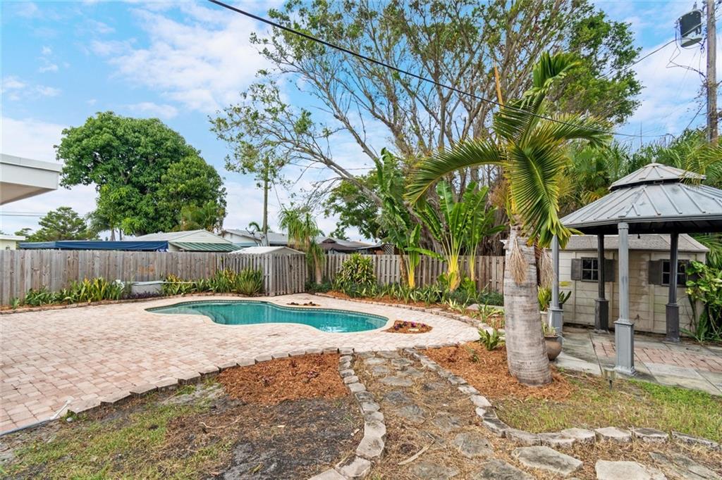 East of 95, Pompano Beach Highlands Mid Century Ranch with magnificent pool and huge Florida room. 3BR/1BA, well maintained property with lots of space. Lush tropical back yard, with heated pool, large paver patio, gazebo, and extra storage sheds. Freshly painted inside and out and ready to move in. Walking distance to local park and elementary school. Close to the Pompano mall and all the shopping and restaurants on US-1 and the beach. High elevation. No flood insurance required. This is a must-see!