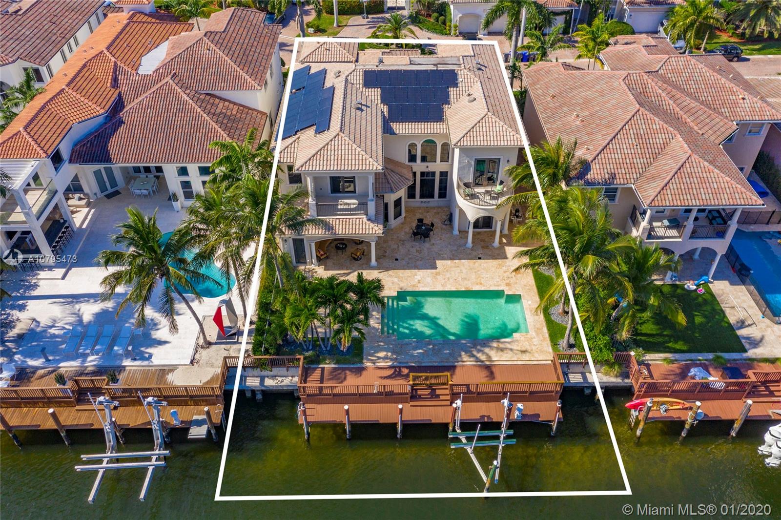 Harbor Island Intracoastal front residence with direct ocean access & no fixed bridges. This stunning home features 28 foot ceilings, Y Greene efficiency solar panels, 5 bedrooms, 5 full bathrooms & 2 half bathrooms. Master bedroom features large private terrace, his & hers closets, large bathroom. Updated 2 car garage with new flooring and storage cabinets. A custom home theatre. Updated kitchen with new Sub Zero refrigerator, new Wolf double oven, brand new dishwasher. High impact windows and doors. 2 new AC units, LED lighting, culligan water softener system, new 22KW generator for entire home, 40 foot private dock with hydronic boat lift, allowing for up to 50 ft boat. Harbor Island includes full gym, steam room, basketball courts, resident clubhouse, tennis courts, 24 hr sec & pool.