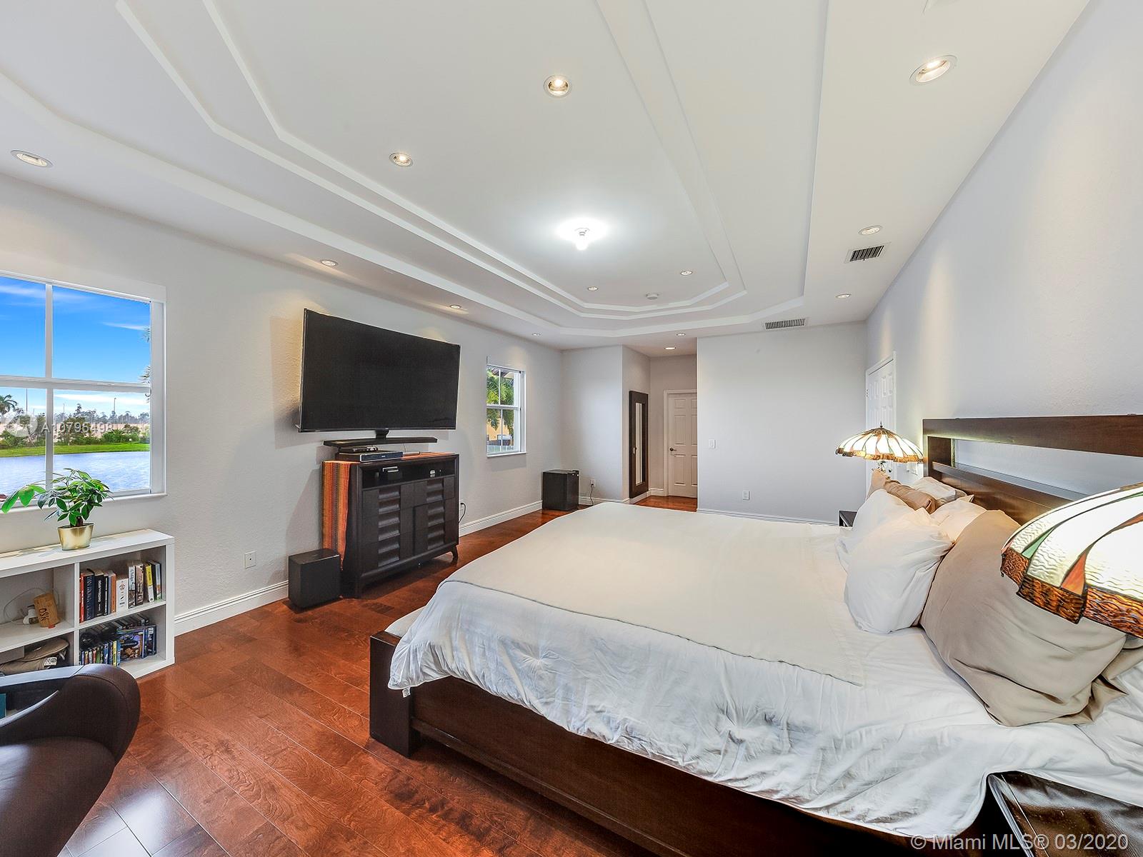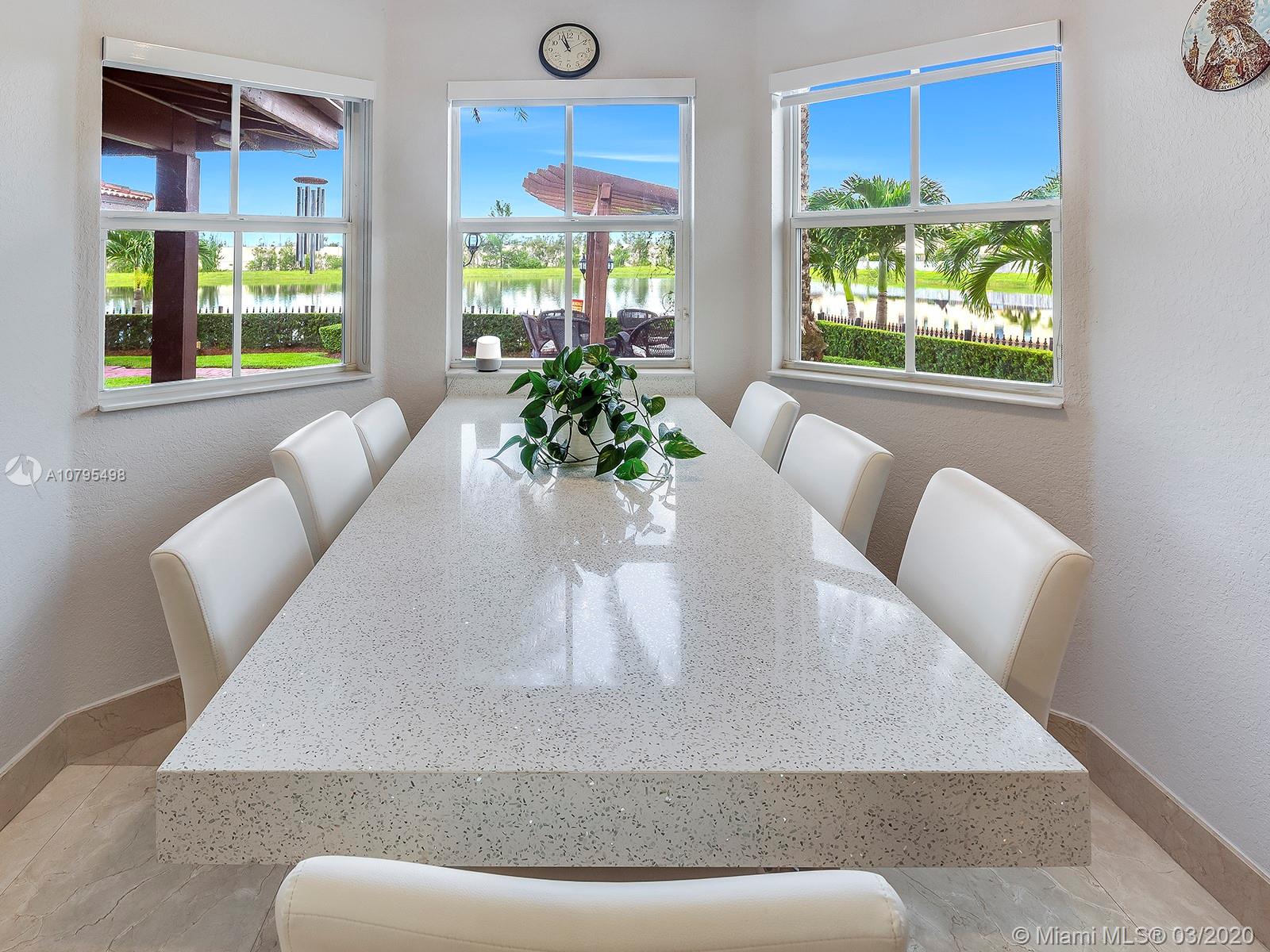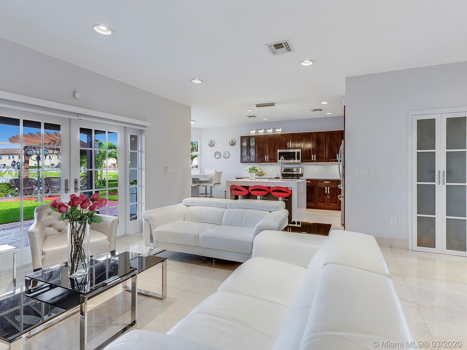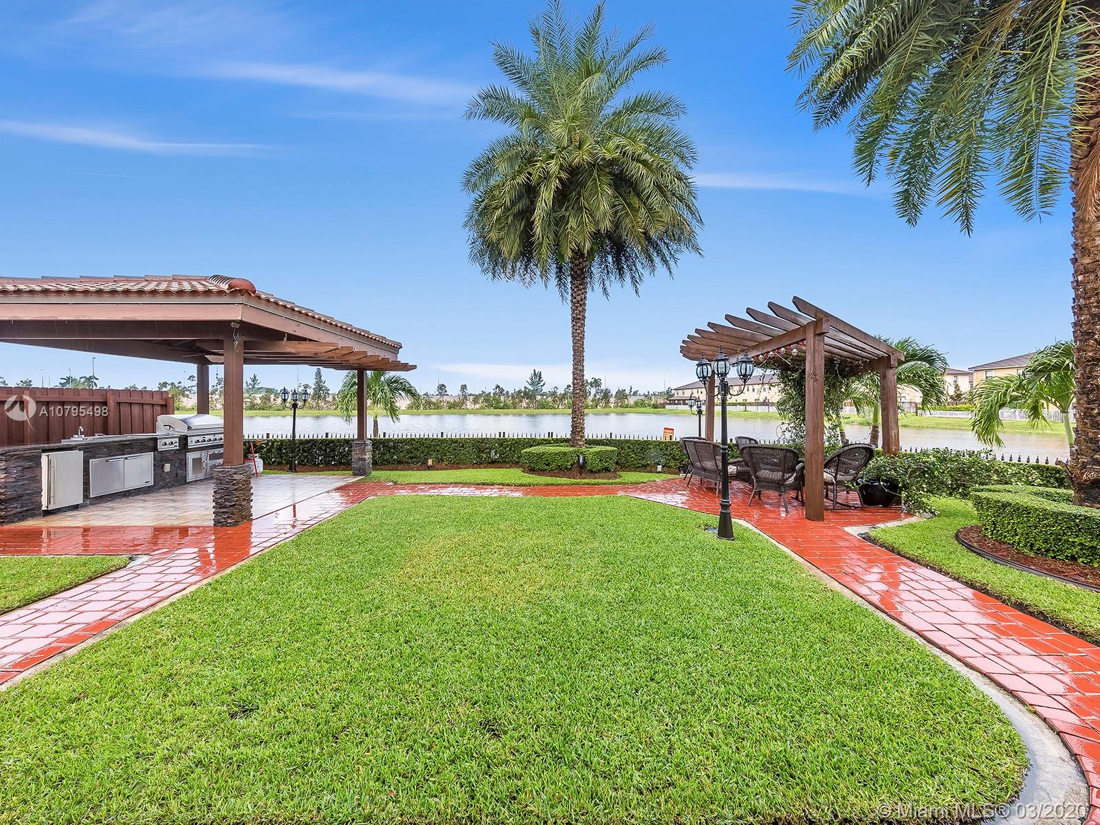 Exquisitely Landscaped corner Lakefront Luxury home at the exclusive Islands at Doral. This waterfront 4BD/3BA home features spectacular soaring ceilings with marble flooring throughout living areas and cherry wood floors in all bedrooms. Top of the line stainless steel appliances, quartz countertop and stunning built in quartz dinner table bring unparalleled elegance to this open kitchen layout. Master bedroom features tray ceilings and luxurious custom-built closet. A spacious two car garage and laundry room with custom additional storage. Enjoy the serenity of the lake with custom summer kitchen, gazebo and covered patio! 3D Tour: https://bit.ly/8646NW115Matt