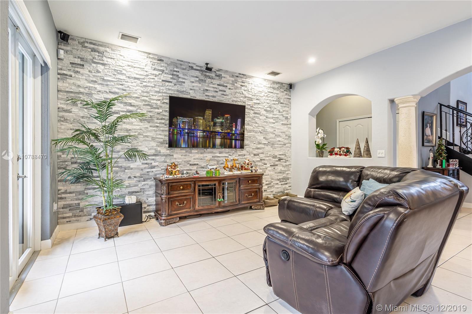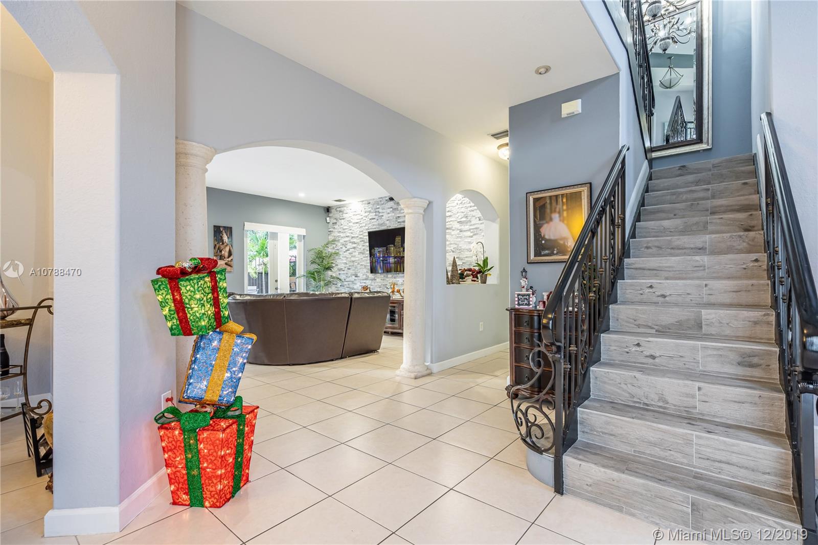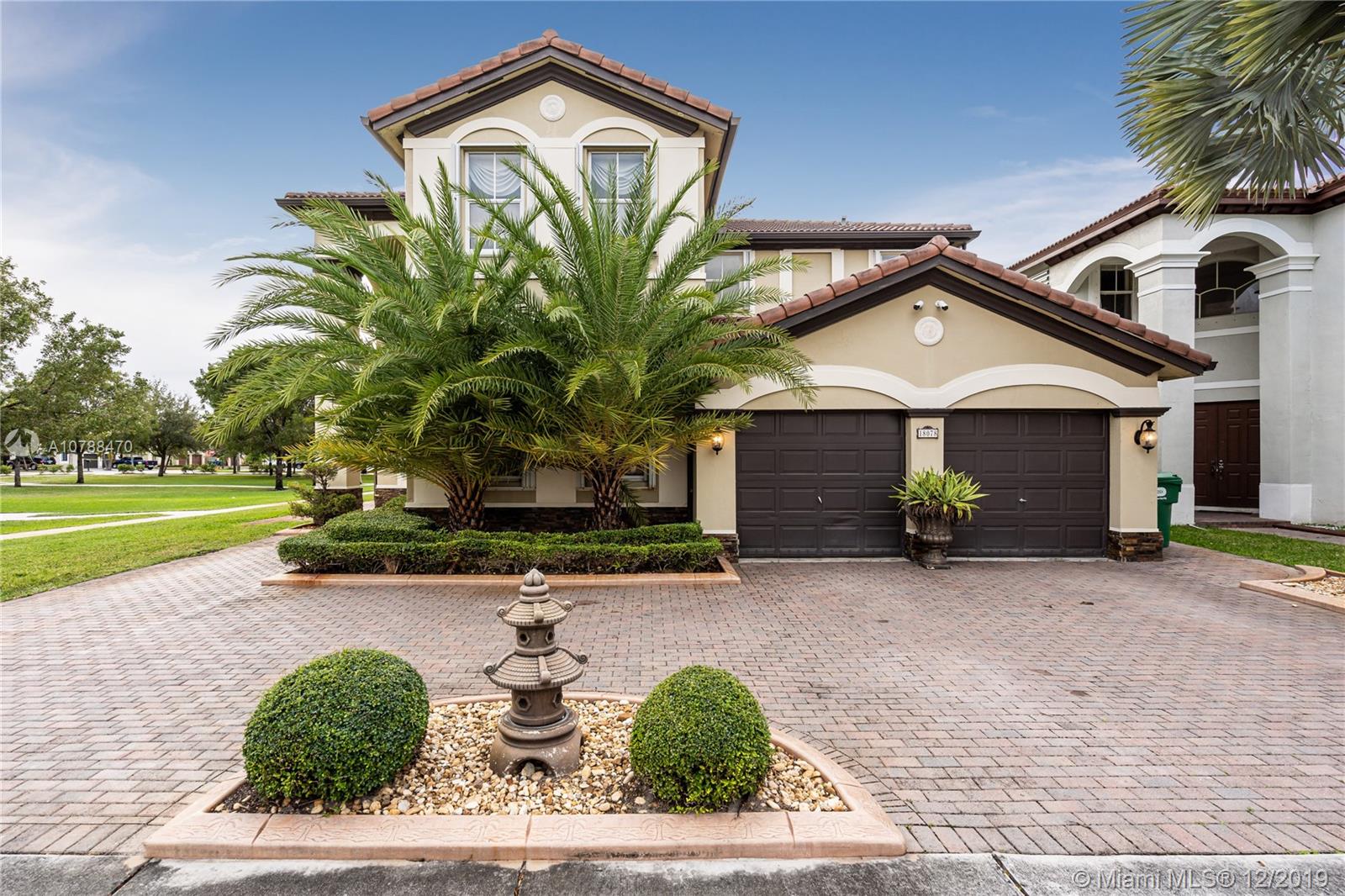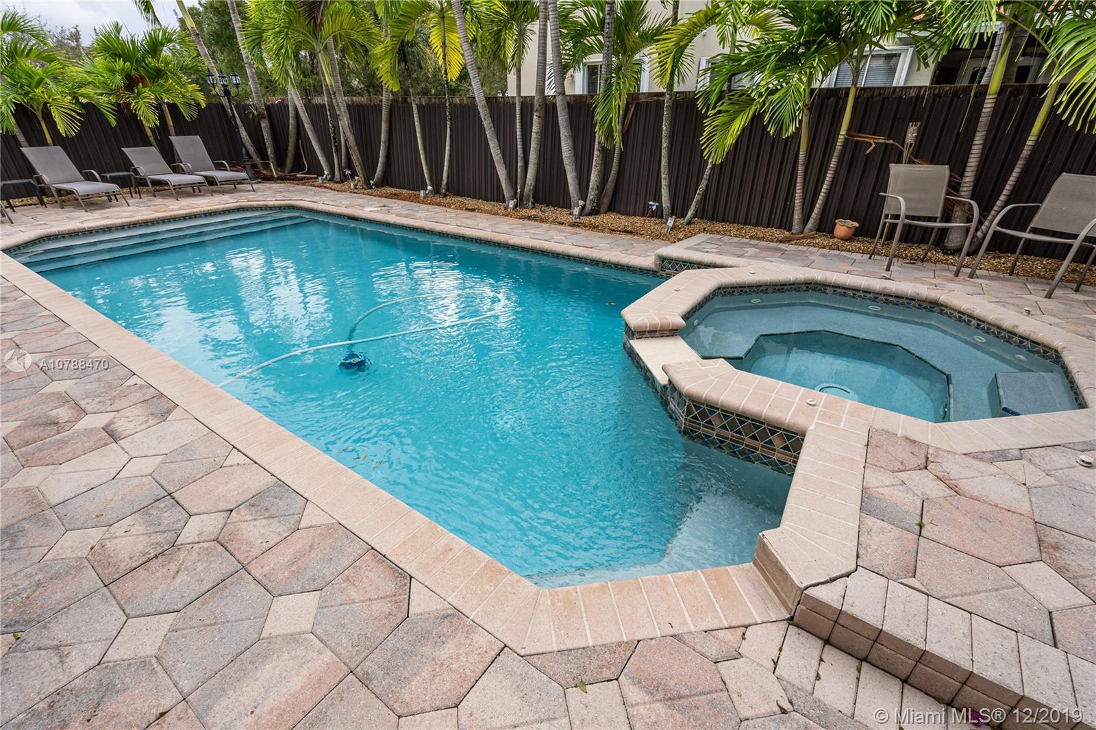 This amazing corner home is perfect for entertaining & large family gatherings. Near Turnpike & I-75. Totally remodeled bathrooms with double rain fall shower heads and seating area in master shower; featuring double sinks, vanity area and gorgeous tile and counter tops throughout. Large kitchen with granite counter tops, real wood cabinets & stainless-steel appliances offering an open concept to living/TV room with gorgeous, custom-made stone accent wall. All paved backyard paradise with outdoor grill & sink; palm trees lining aluminum fencing. Upstairs balcony terrace from master overlooking pool. Remodeled wrought-iron railings on stairs. Two brand new air condition units. Irrigation system in front with beautifully kept landscaping. Two inside car garages & driveway for 5+ cars. No HOA