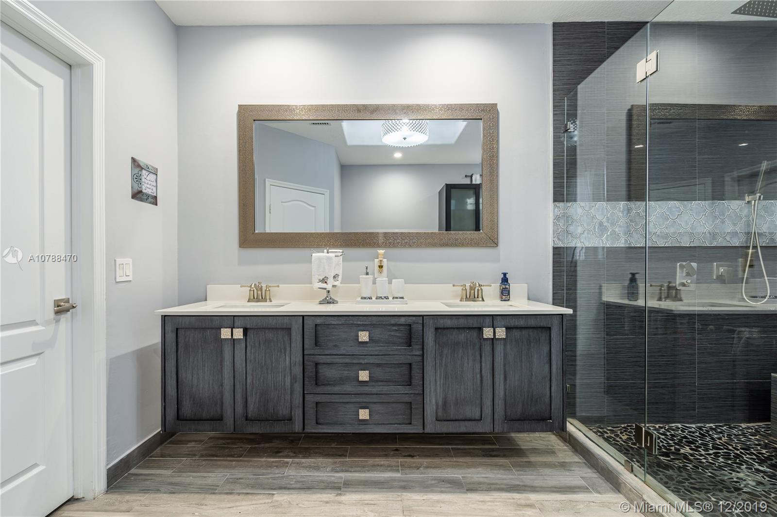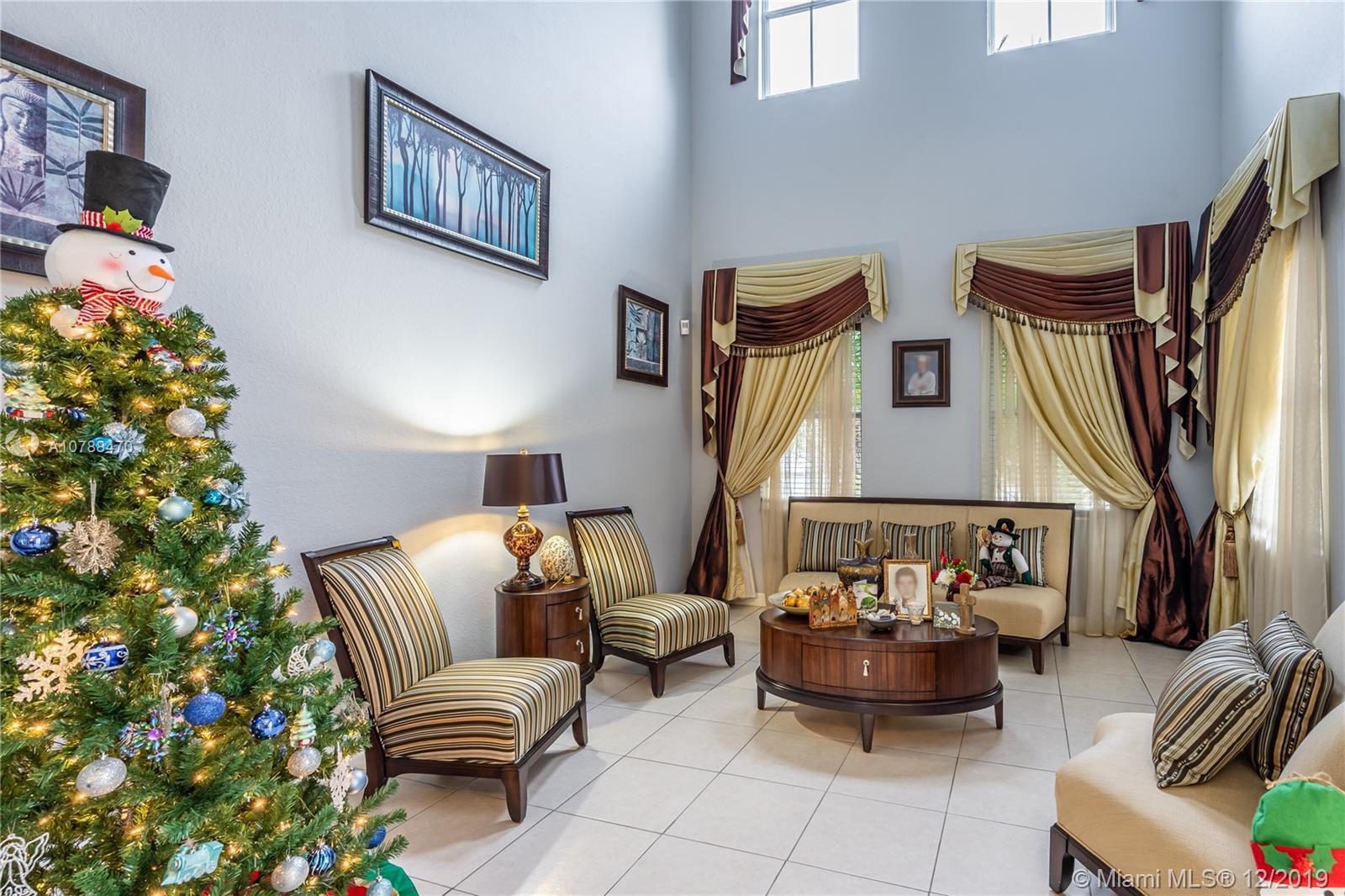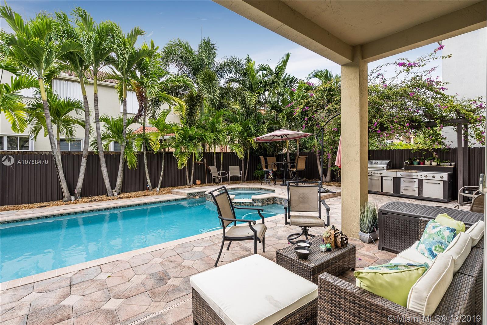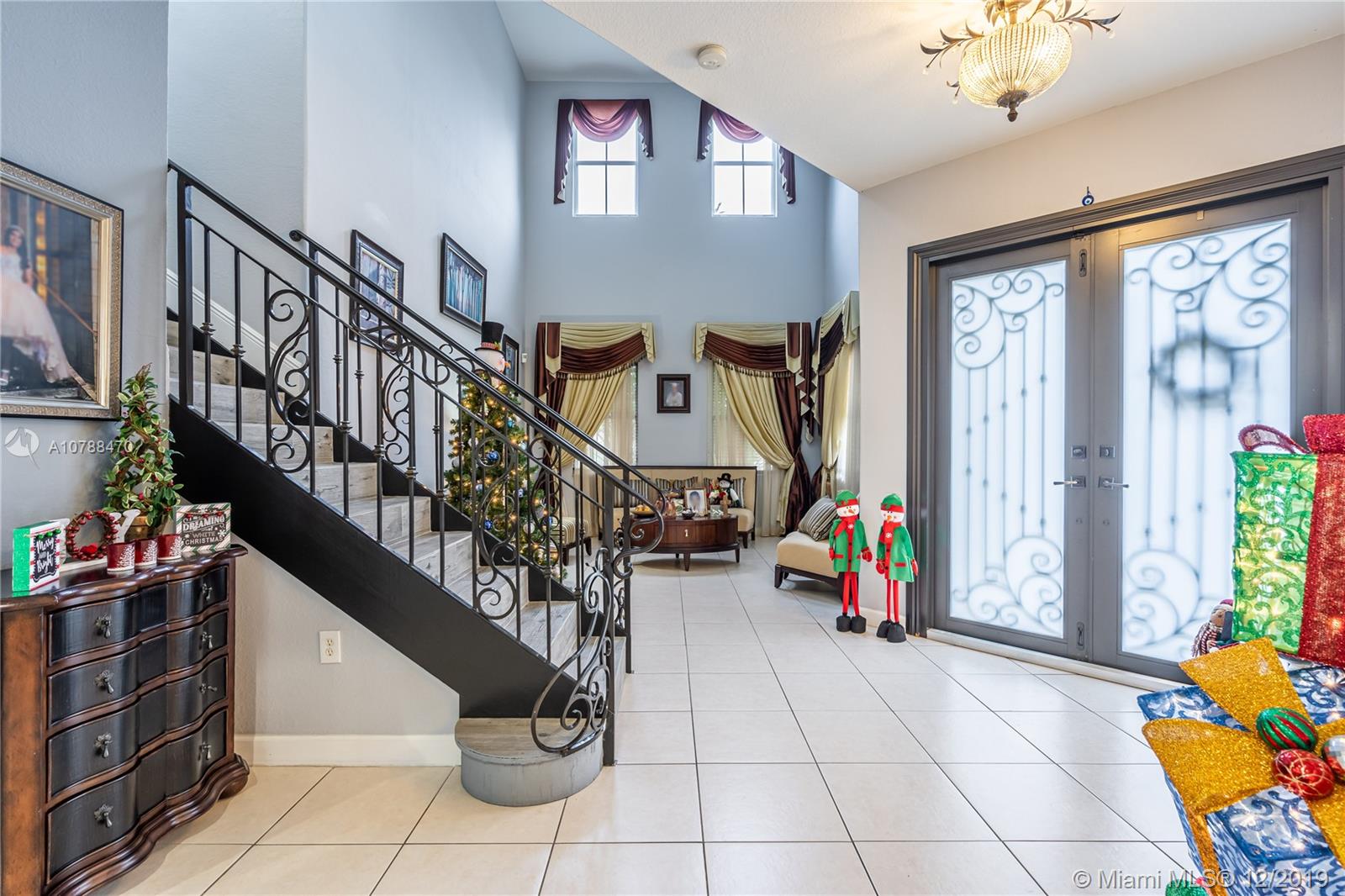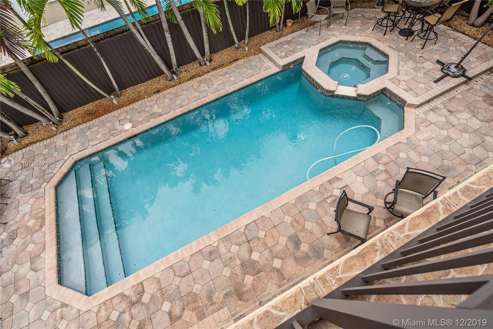 This amazing corner home is perfect for entertaining & large family gatherings. Near Turnpike & I-75. Totally remodeled bathrooms with double rain fall shower heads and seating area in master shower; featuring double sinks, vanity area and gorgeous tile and counter tops throughout. Large kitchen with granite counter tops, real wood cabinets & stainless-steel appliances offering an open concept to living/TV room with gorgeous, custom-made stone accent wall. All paved backyard paradise with outdoor grill & sink; palm trees lining aluminum fencing. Upstairs balcony terrace from master overlooking pool. Remodeled wrought-iron railings on stairs. Two brand new air condition units. Irrigation system in front with beautifully kept landscaping. Two inside car garages & driveway for 5+ cars. No HOA