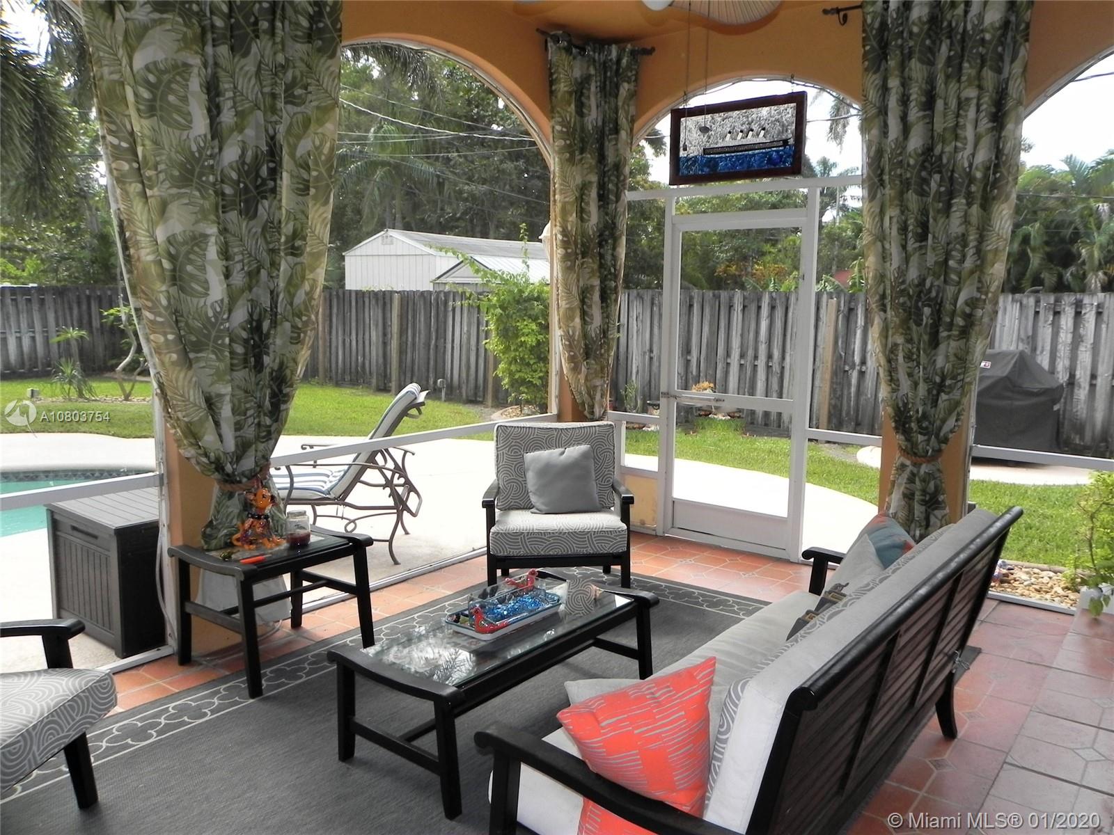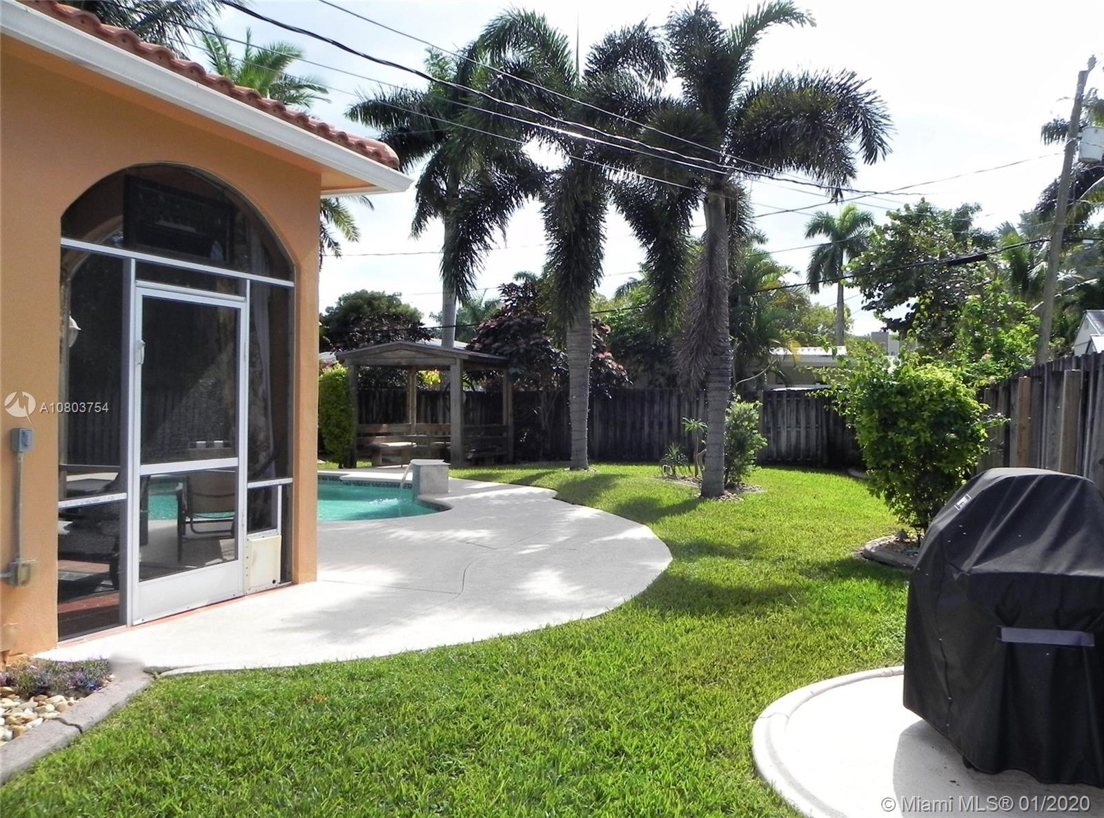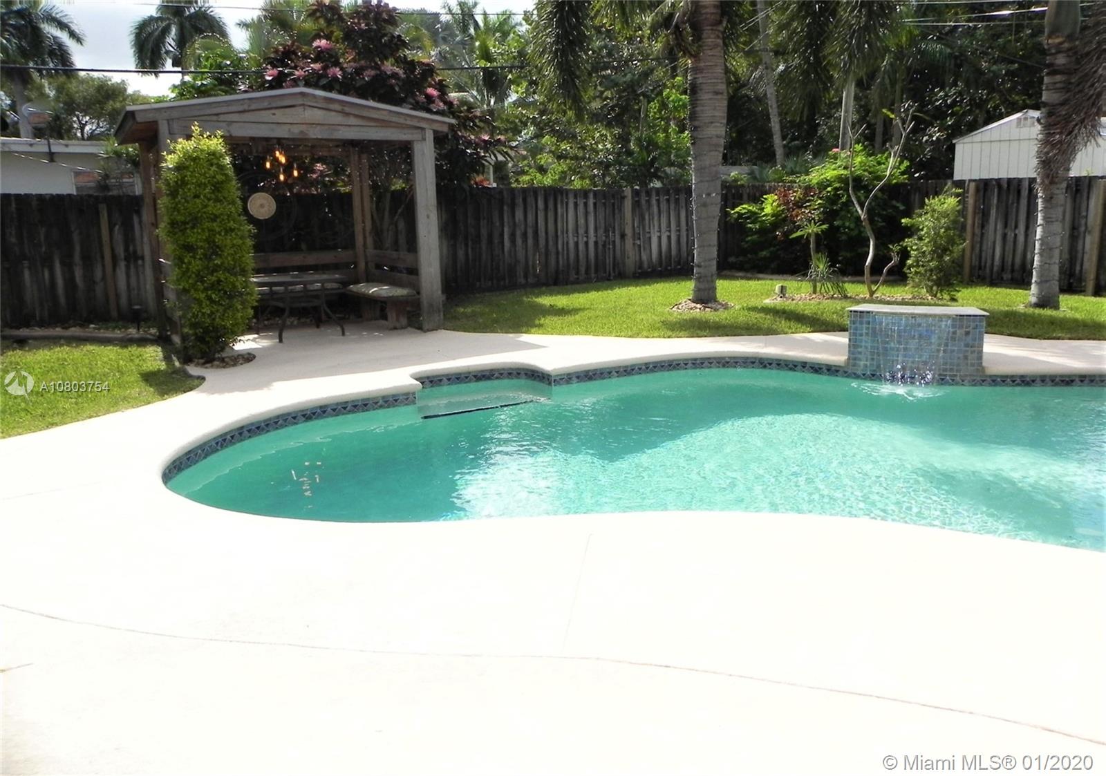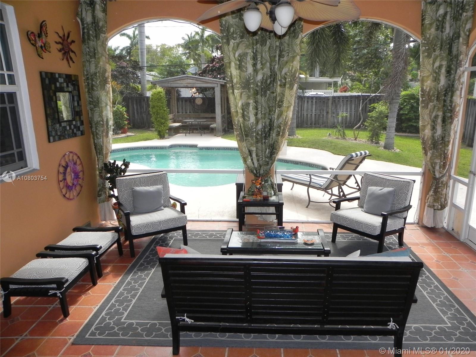 Beautiful Hollywood Lakes 3 bed, 2 bathroom home with awesome indoor and outdoor living spaces. Gorgeous screened and covered patio looking out to your huge backyard with large custom pool, established tropical landscaping, and private gazebo. Perfect for cooling off, relaxing, or entertaining friends and family. Large open kitchen with granite counters, stainless steel appliances, gas oven/range, tile backsplash, and custom cabinets. Kitchen opens to indoor bar overlooking pool and back patio. Beautiful indoor plantation shutters on all windows and sliding door. Private master suite. Impact windows and doors. Large stamped concrete circle driveway with one car garage and laundry/utility room. Minutes to beaches, downtown, golf, and more. Dade/Florida pine wood floors. Gas water heater.