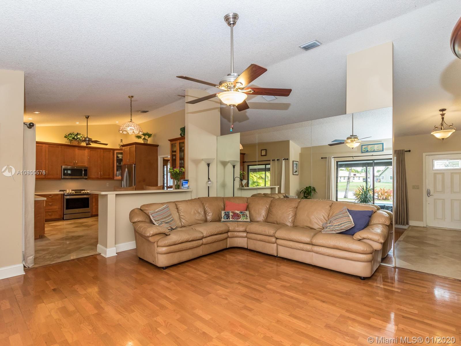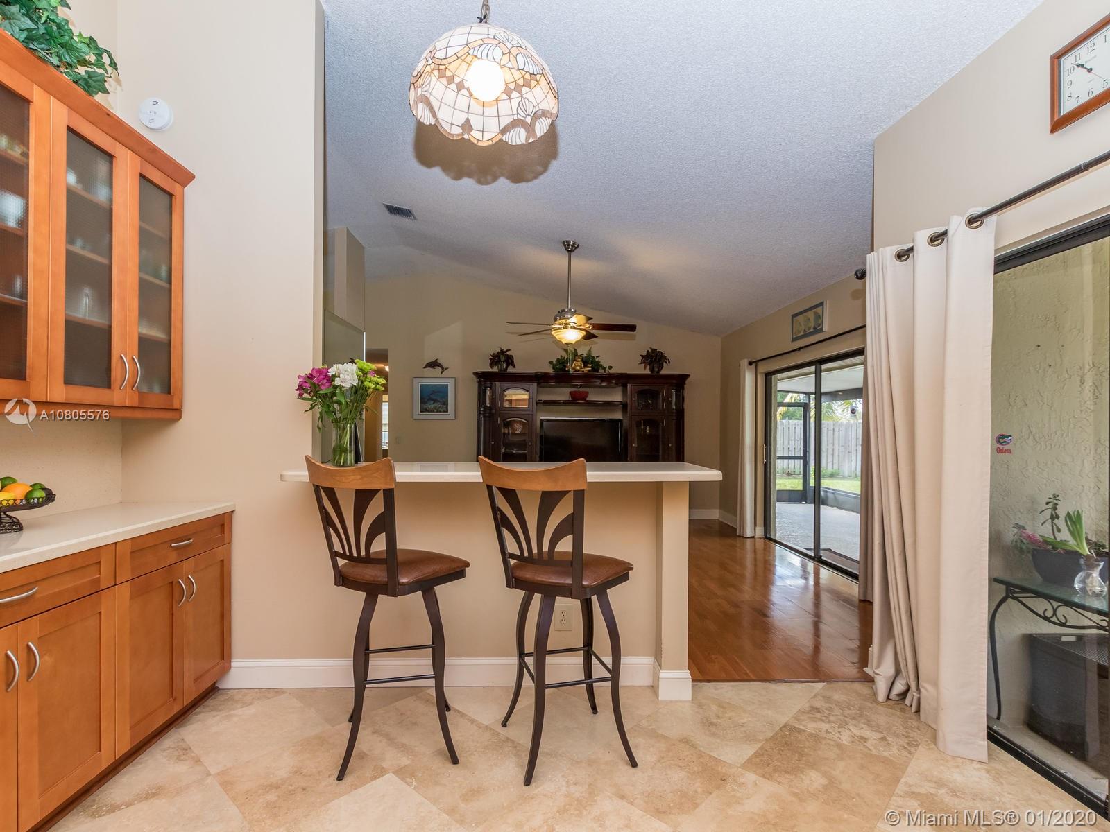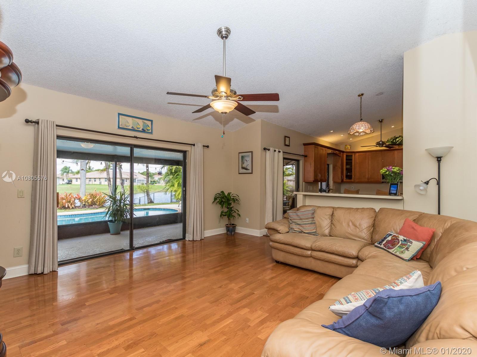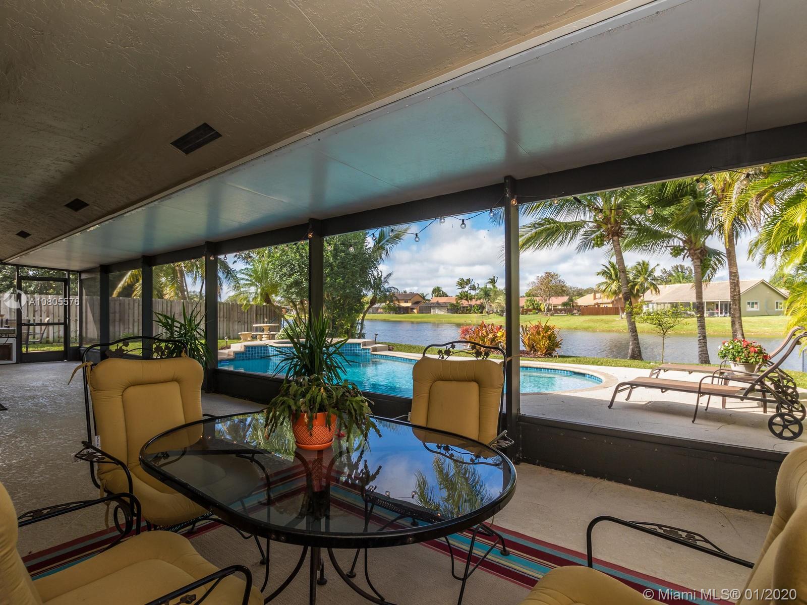 Enjoy beautiful sunsets on a wide lake in your private heated pool! Impeccable 4/2 in sought after Hawkes Bluff community of Davie w/an excellent floor plan. Separate formal living, formal dining and family room areas. Tastefully renovated with neutral colors, featuring wood & travertine floors throughout. Open kitchen offering custom cabinets, stainless steel appliances, quartz counters & a snack bar. Generous master suite w/spa like bathroom, walk-in closet & French doors overlooking the lake. Extra-large rooms w/deep closets. Excellent schools. Backyard offering an expansive covered screened in patio overlooking the lake and pool, perfect for entertaining! Hurricane shutter & impact windows for all openings. Must see..Wont last!