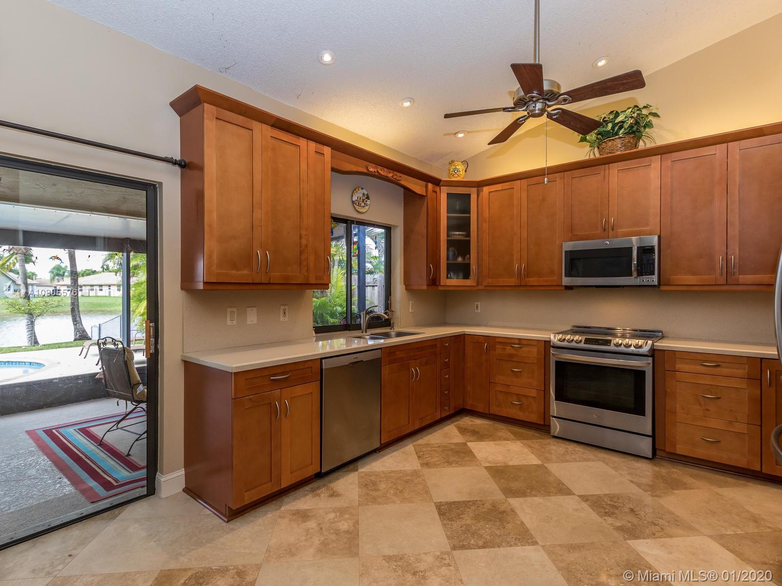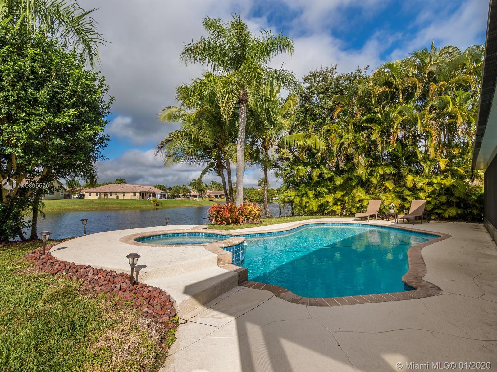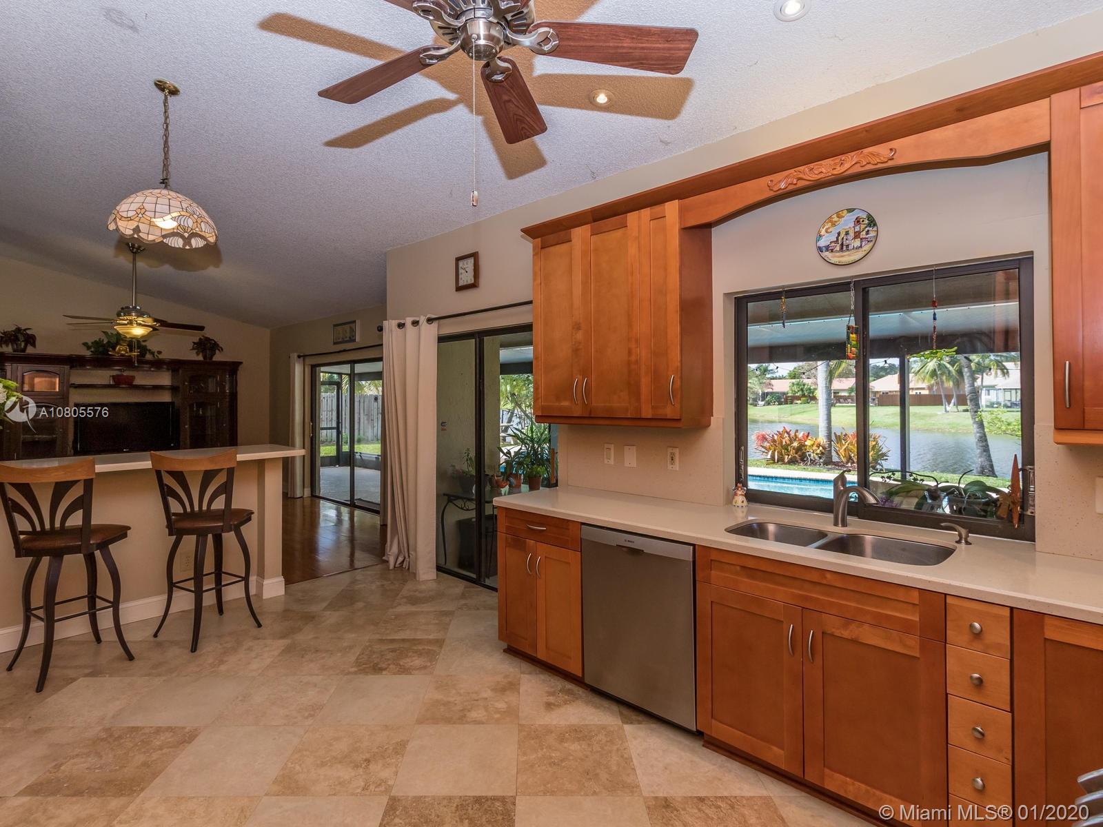 Enjoy beautiful sunsets on a wide lake in your private heated pool! Impeccable 4/2 in sought after Hawkes Bluff community of Davie w/an excellent floor plan. Separate formal living, formal dining and family room areas. Tastefully renovated with neutral colors, featuring wood & travertine floors throughout. Open kitchen offering custom cabinets, stainless steel appliances, quartz counters & a snack bar. Generous master suite w/spa like bathroom, walk-in closet & French doors overlooking the lake. Extra-large rooms w/deep closets. Excellent schools. Backyard offering an expansive covered screened in patio overlooking the lake and pool, perfect for entertaining! Hurricane shutter & impact windows for all openings. Must see..Wont last!