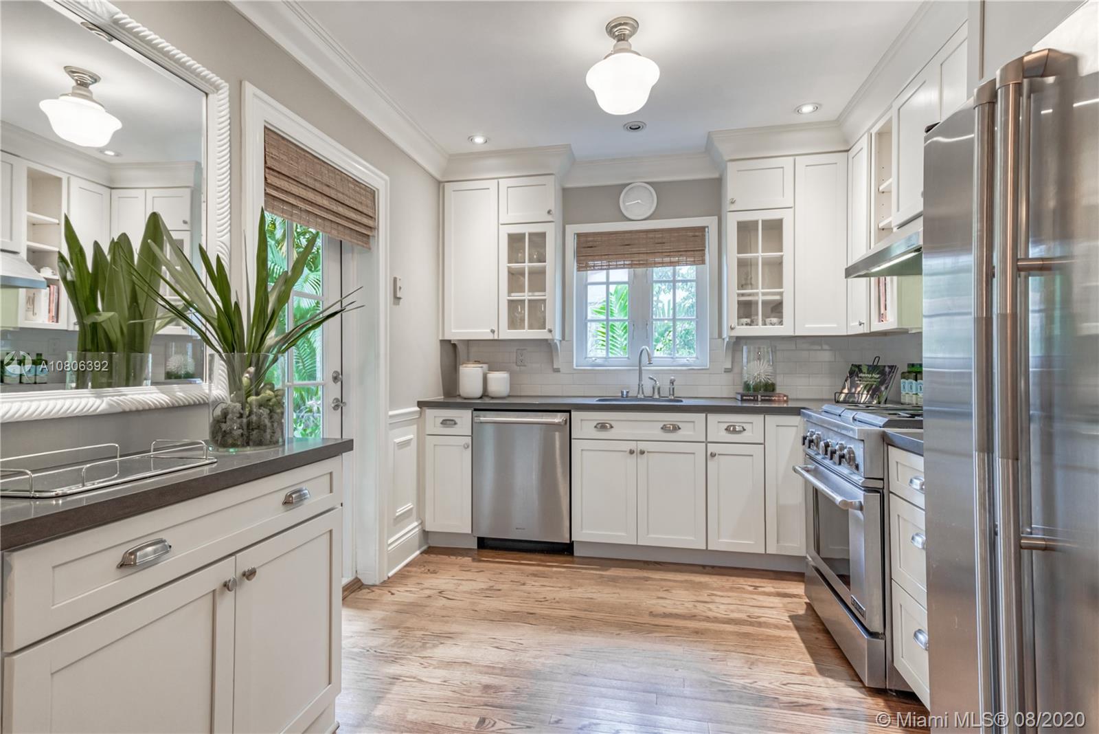 This lovely home will inspire and delight from its beautiful tropical large lot to the charm of the hardwood floors, fireplace, extensive moldings and custom finishes throughout. New roof, impact glass, gorgeous updated kitchen and bath. This home has style, and curb appeal galore. Oversized 7350’ lot has an absolutely breathtaking private backyard with a charming covered porch. Plenty of room for a pool or future expansion. This is a one of a kind, immaculate, turnkey, stunning special home.