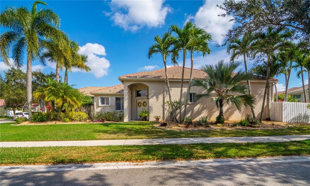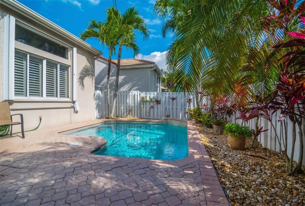 BACK ON THE MARKET DUE TO BUYER FAMILY EMERGENCY: Nestled in the heart of Weston's prestigious community of The Islands, this gorgeous 3/2.5 corner home features volume ceilings, Plantation shutters, a formal dining room, an open floor plan, & updated ADT. The remodeled, eat-in kitchen includes 42" Kraftmade cabinets w/pull-outs, newer SS appliances, granite counters & backsplash & recessed lighting. The updated baths include a Master w/custom stone decor, jacuzzi tub, seamless shower & double vanity. Flooring is of high quality wood laminate in the bedrooms, & marble tile in the baths. Newer hot water heater, A/C, upgraded paver drive/sidewalk, Accordion shutters; new pool salt water system! Entertaining family & friends comes easy in the complete privacy of this fenced, backyard oasis!