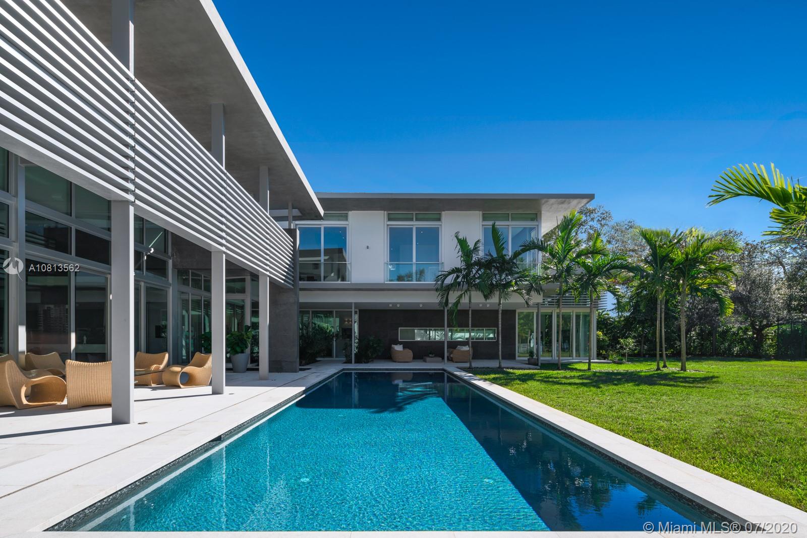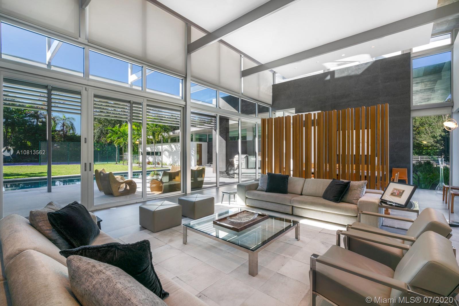 Modern and Mid-Century marvel of custom architecture and engineering, flawlessly executed. Designed by KZ Architecture, discover new wonders at every view: soaring ceilings, natural elements, glass framed views combine for a design that is anything but “white box.” Imagine yourself living in a work of art, enjoying your first floor master wing with, spa bath, private gated corner acre, reflection and heated pool and N/S tennis court. Home features poured in place cement roof with ceilings floating on beams, sculptural floating wood and glass staircase, LED lighting, and custom cabinetry. Great family/guest floor plan with upstairs loft and 3 suites. Staff room. Gym and office conv to bedroomms. More attached.