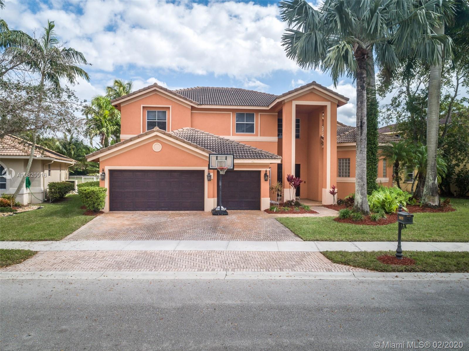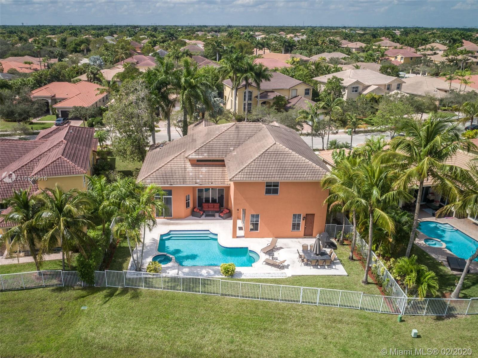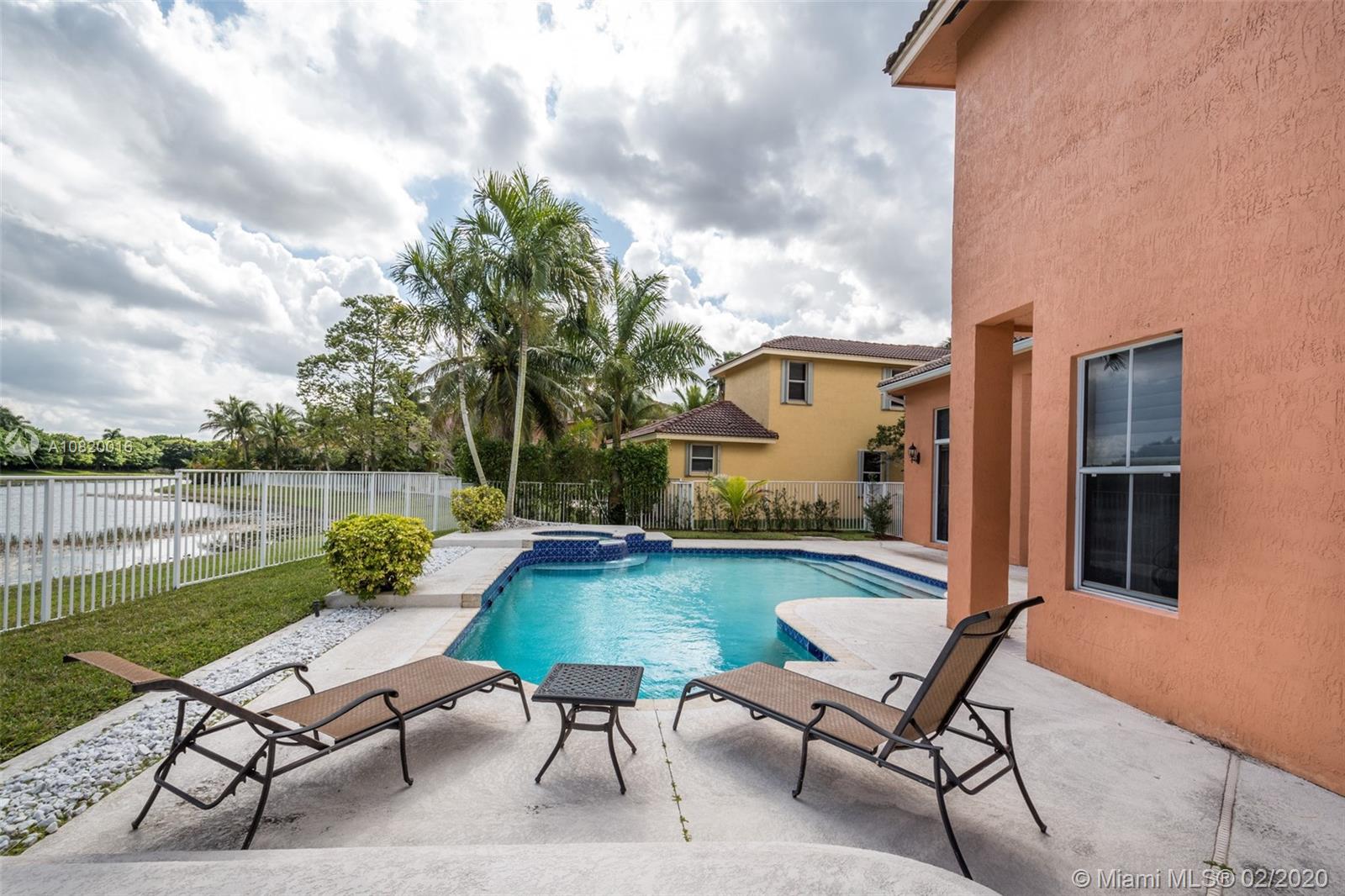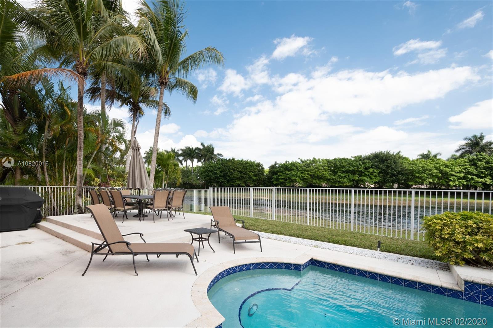 Need space. Popular Denton model sits on tranquil 11,670 sqft waterfront lot with oversized heated pool, fully fenced in the gated community of Savanna at Weston. Two story living room with windows on water. Office and Master bedroom on first level with grand master bath suite, roman tub and dual shower and sinks. New white contemporary kitchen with center island, granite countertops, Stainless steel appliances including double oven, wine refrigerator. Dual staircase leads to the second level with four additional spacious bedrooms plus a playroom. Wood laminate flooring in secondary bedrooms, renovations in all baths. Full accordion protection. Cabana bath and more.