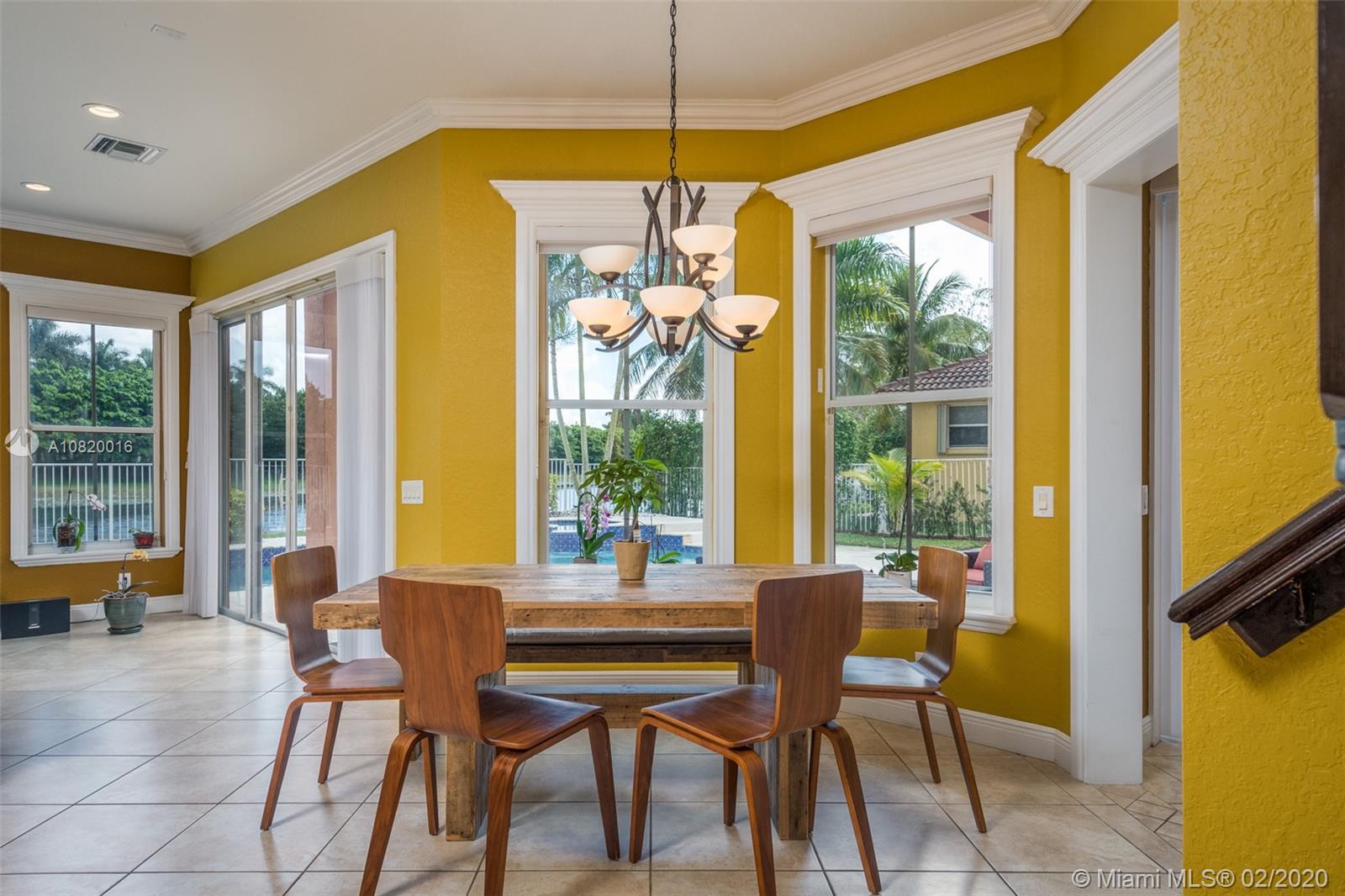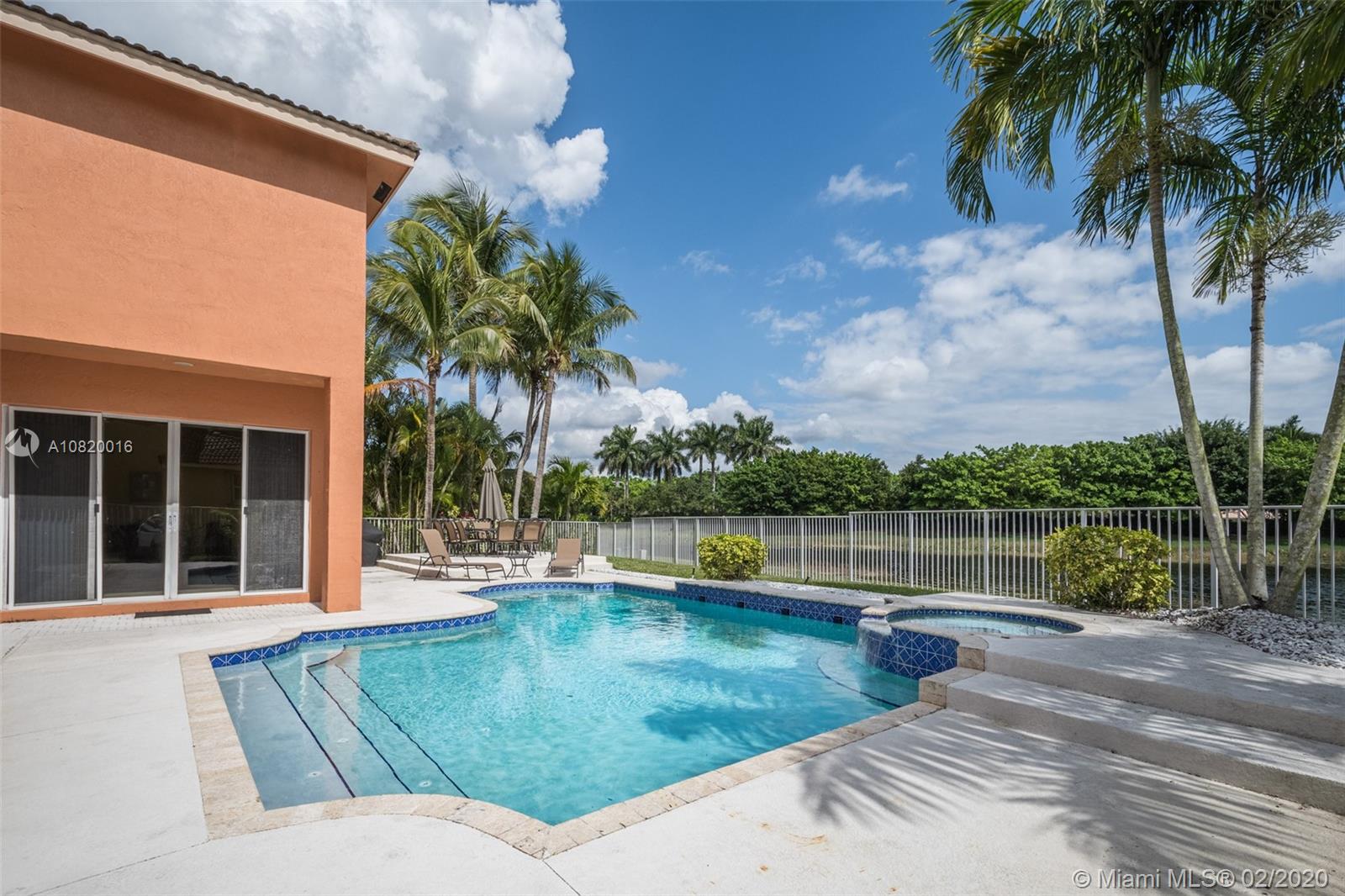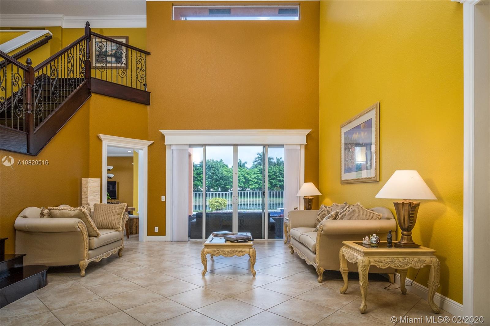 Need space. Popular Denton model sits on tranquil 11,670 sqft waterfront lot with oversized heated pool, fully fenced in the gated community of Savanna at Weston. Two story living room with windows on water. Office and Master bedroom on first level with grand master bath suite, roman tub and dual shower and sinks. New white contemporary kitchen with center island, granite countertops, Stainless steel appliances including double oven, wine refrigerator. Dual staircase leads to the second level with four additional spacious bedrooms plus a playroom. Wood laminate flooring in secondary bedrooms, renovations in all baths. Full accordion protection. Cabana bath and more.