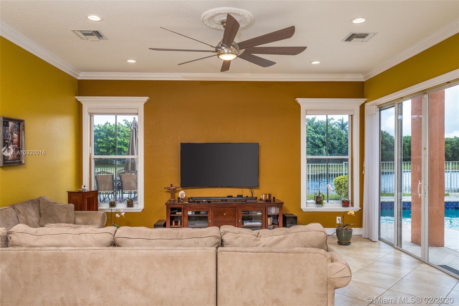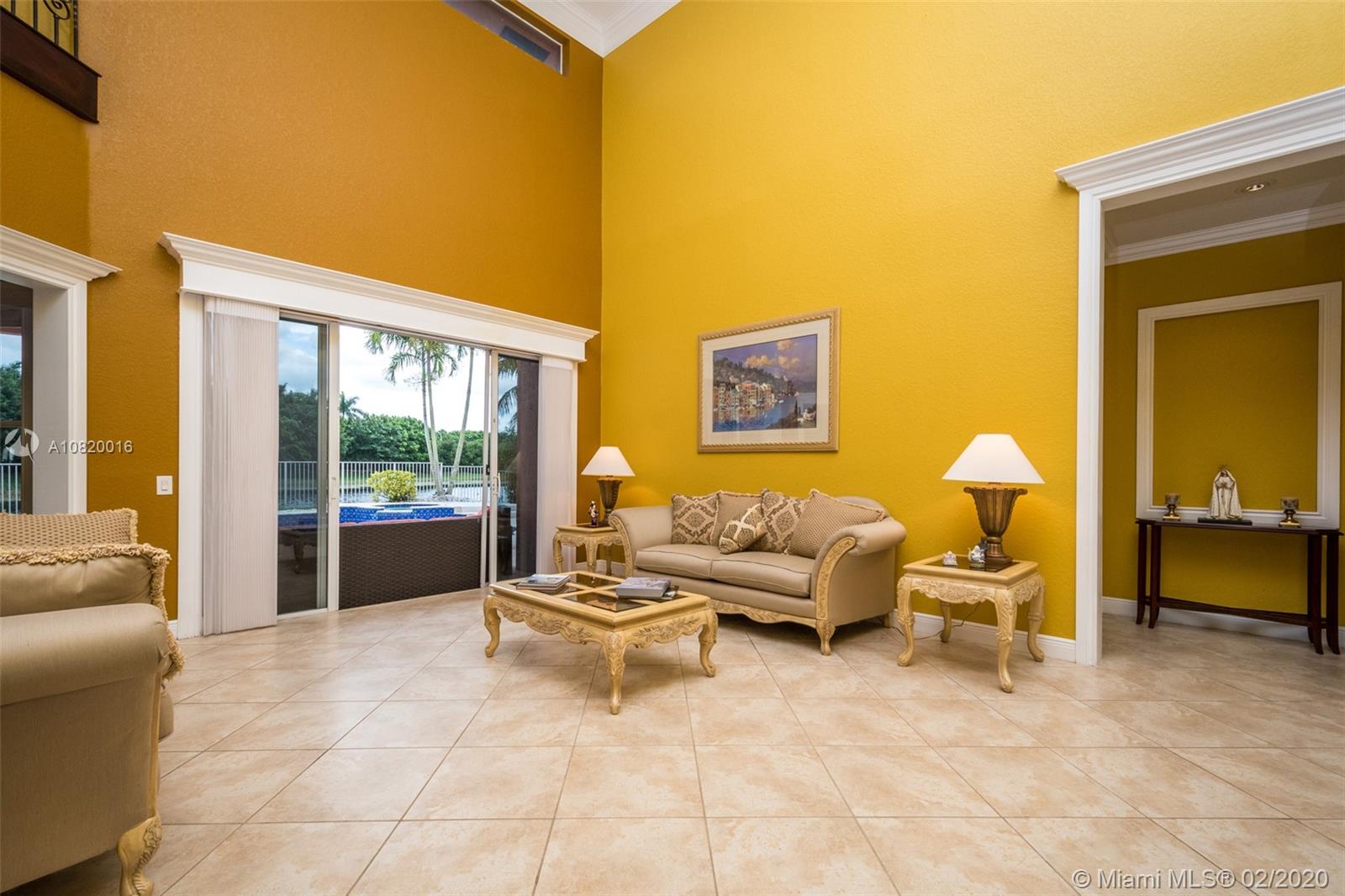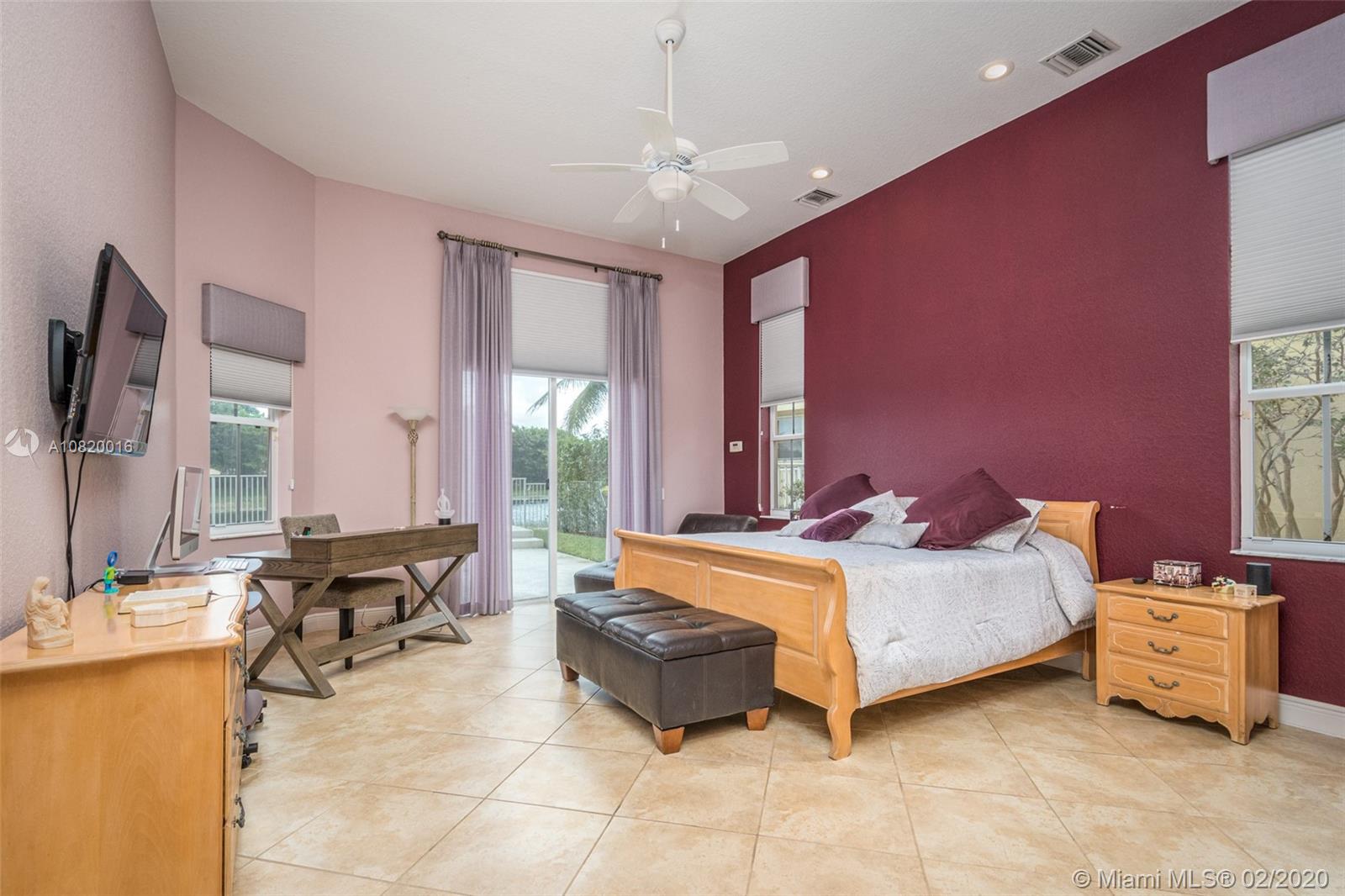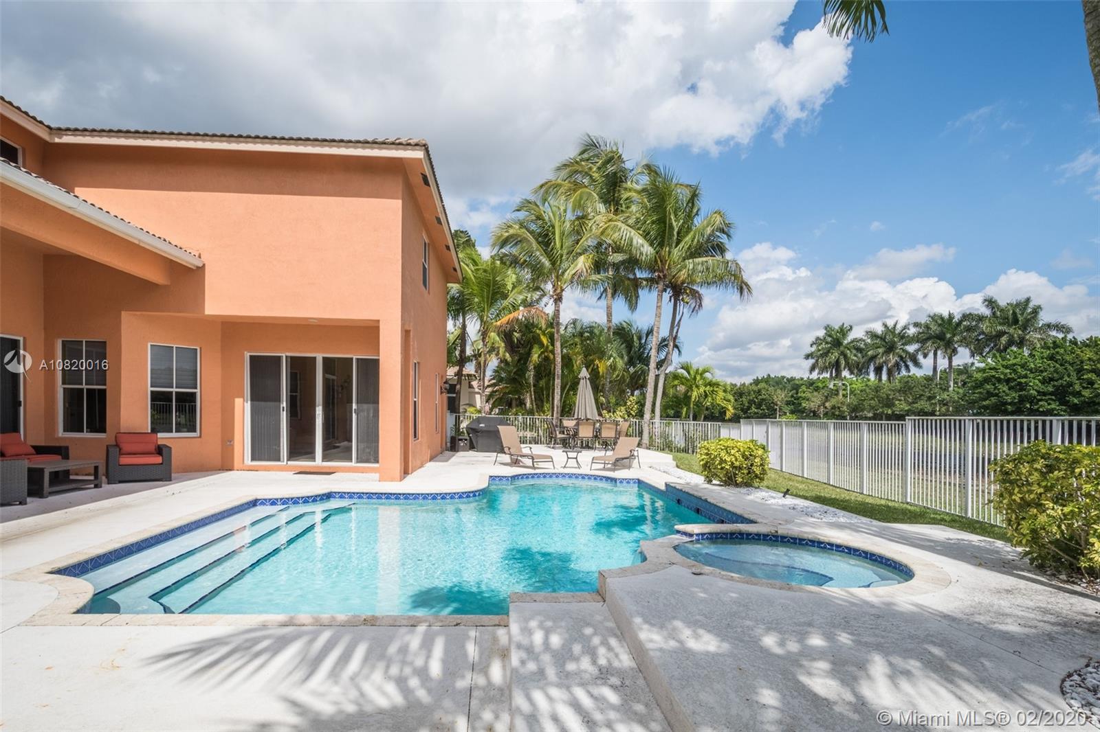 Need space. Popular Denton model sits on tranquil 11,670 sqft waterfront lot with oversized heated pool, fully fenced in the gated community of Savanna at Weston. Two story living room with windows on water. Office and Master bedroom on first level with grand master bath suite, roman tub and dual shower and sinks. New white contemporary kitchen with center island, granite countertops, Stainless steel appliances including double oven, wine refrigerator. Dual staircase leads to the second level with four additional spacious bedrooms plus a playroom. Wood laminate flooring in secondary bedrooms, renovations in all baths. Full accordion protection. Cabana bath and more.