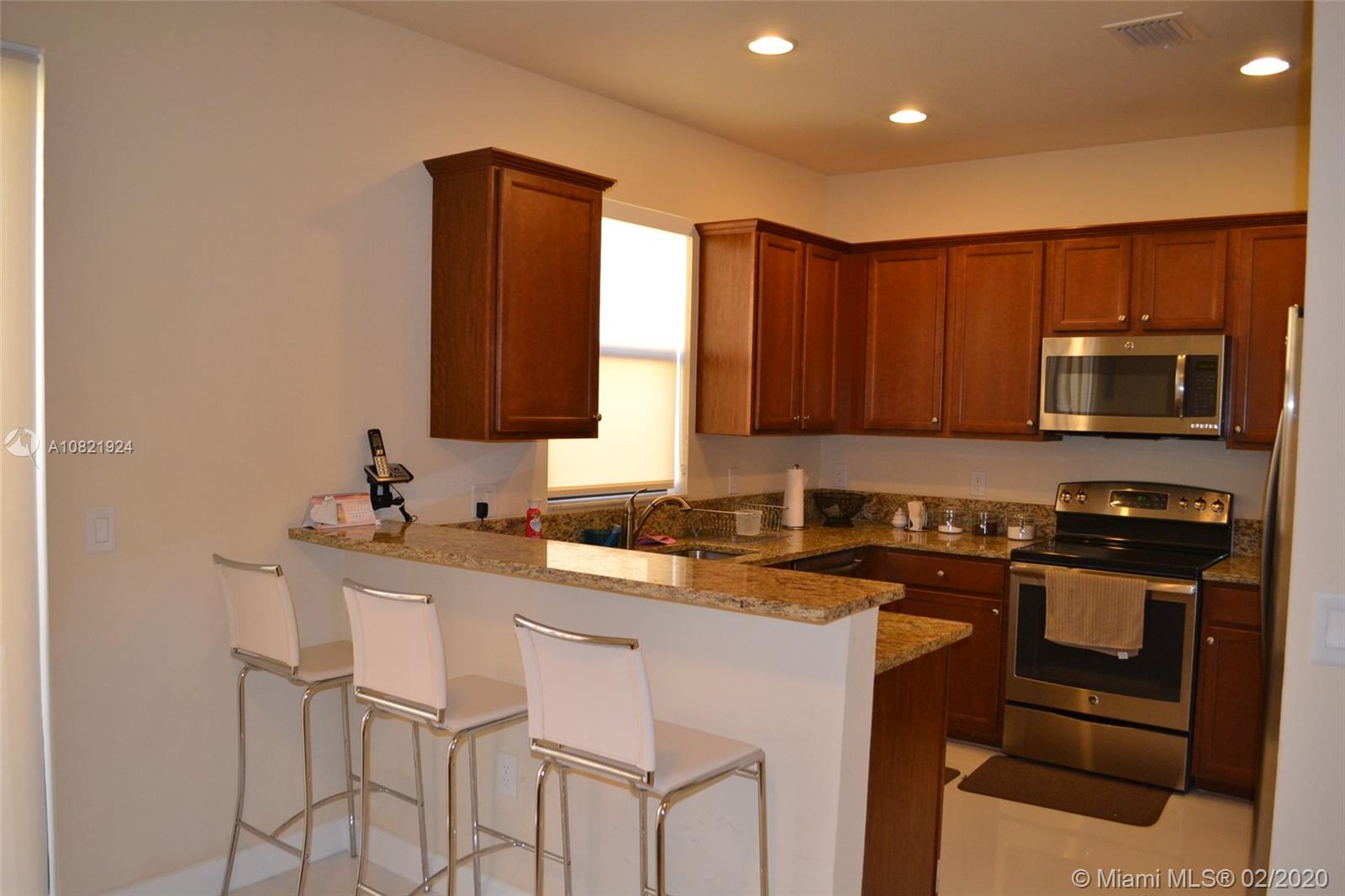 Live in the heart of Doral in this beautiful 3 bedroom, 2.5 baths townhouse. This home features glass tile floors throughout with an open living & dining room layout. The granite countertop kitchen with a breakfast area bar opens to the family room. The spacious kitchen also includes stainless steel appliances and wood-finished cabinets. Nice enclosed patio with pavers in the back is ideal for entertaining. Upstairs the large master bedroom features a walk-in closet and ensuite master bathroom. Great location with access to fine dining, malls, and shopping centers. Also easy access to Florida's Turnpike, Palmetto and Dolphin Expressway.