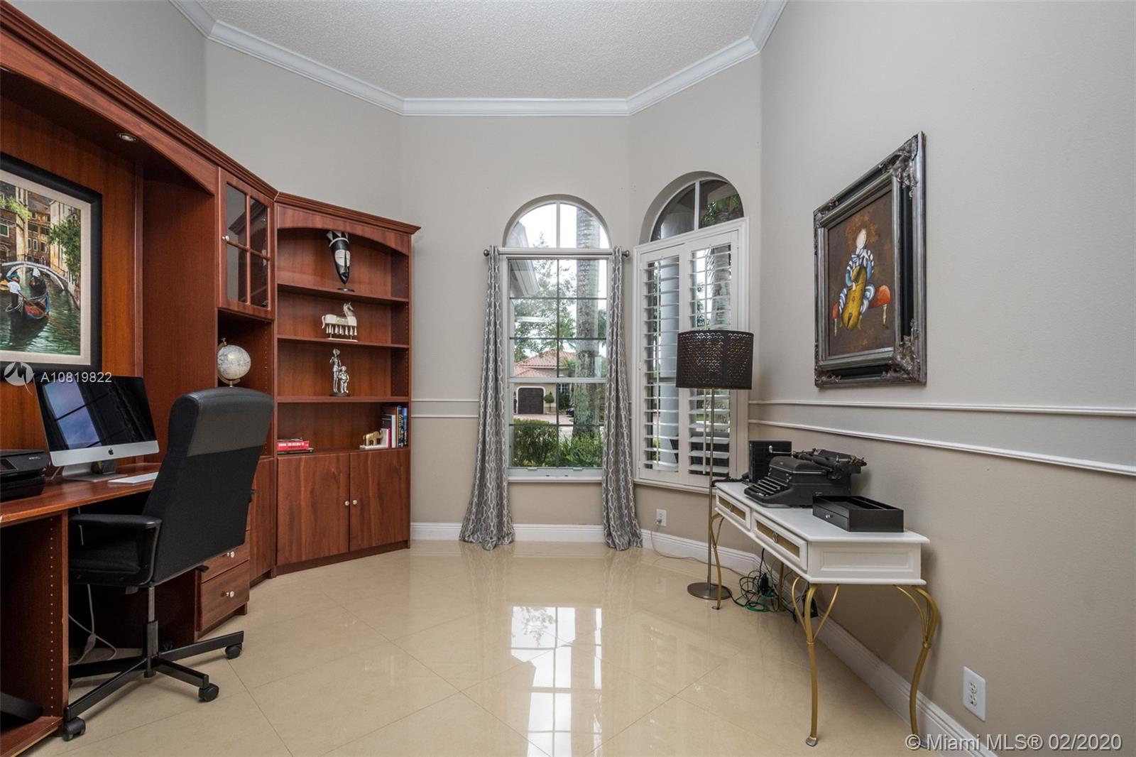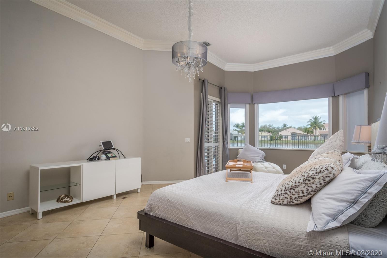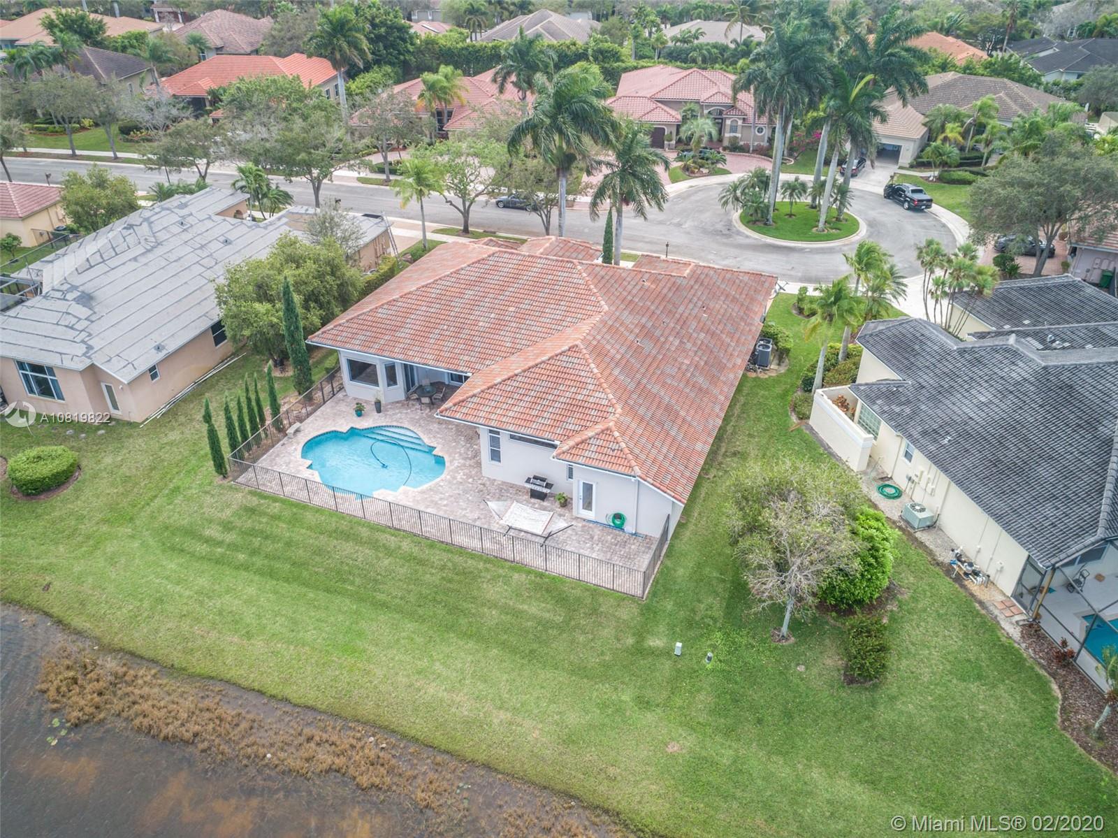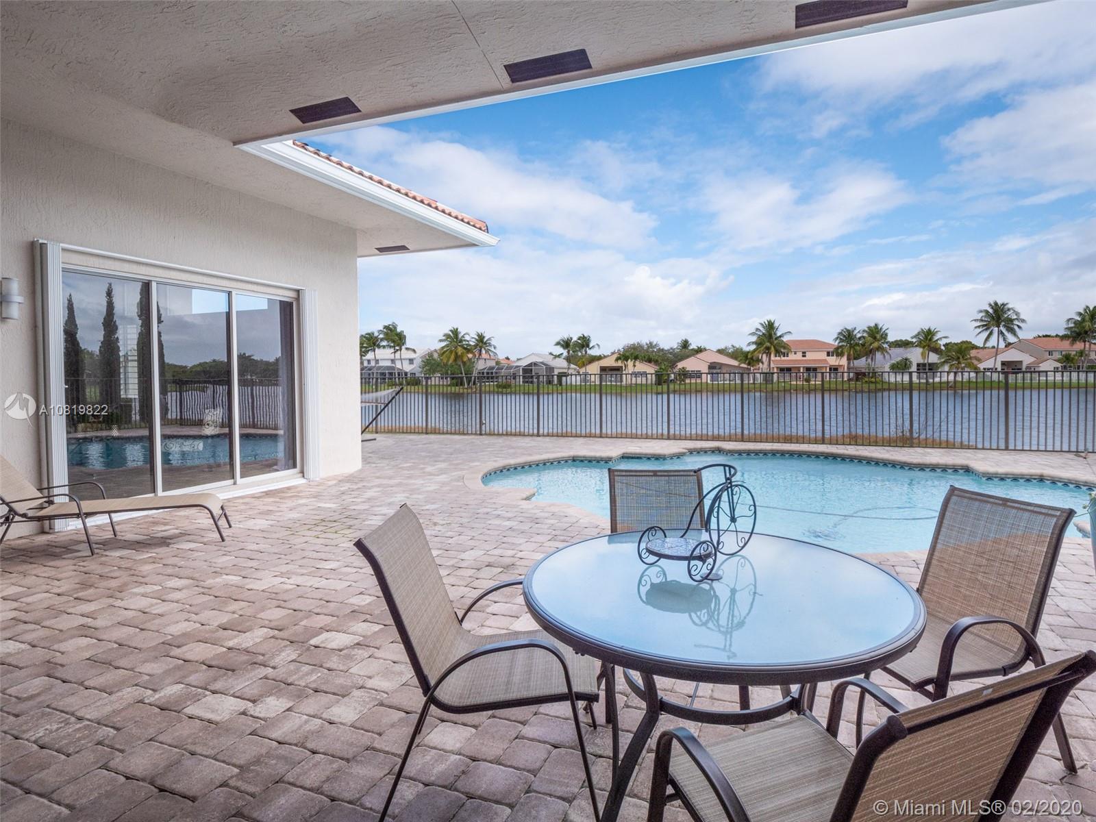 Check out our new 3D tour. Tucked on a quiet cul de sac street this custom built home features chicago brick driveway and walkway. This four bedroom plus office one story shows light and bright. Enjoy long lake views from expansive paver patio, remodeled pool with large overhang fully fenced yard. Neutral porcelain tile in living areas with soaring ceilings. Freshly painted interior. Enjoy contemporary white kitchen, granite countertops, center island and Stainless Steel appliances. Grand master bedroom with windows on water and pool. Master bath with roman tub, dual sinks and shower. Extensive crown molding. plantation shutters. Cabana bath and so much more.