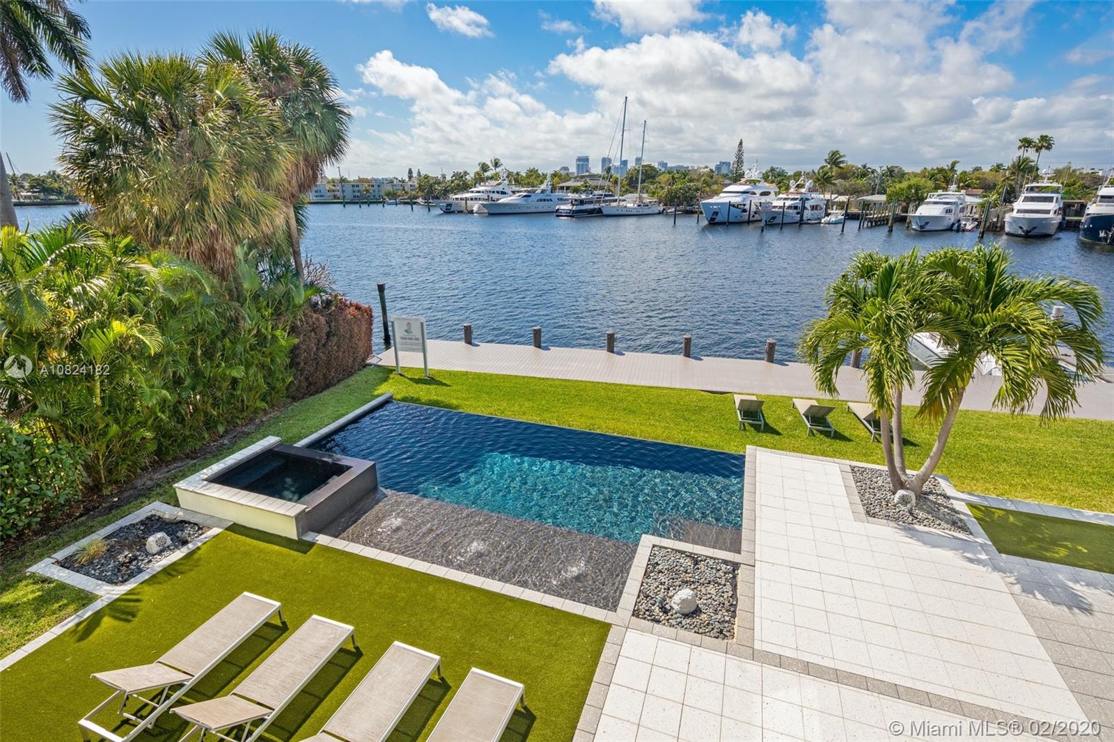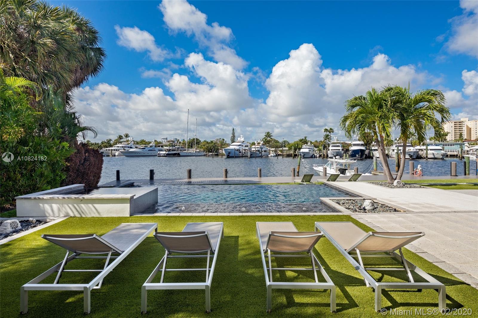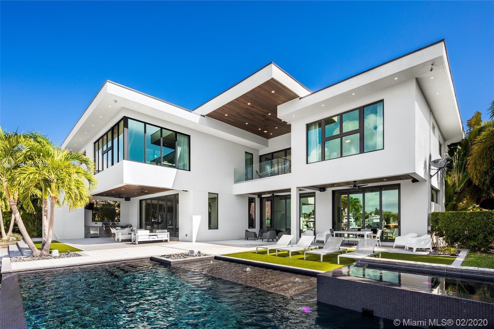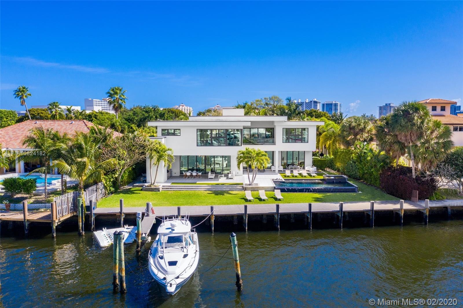 Modern Yachtmans Architectural Waterfront Paradise featuring jaw dropping sunset views and views of the downtown skyline, 23 foot ceilings, over 100 feet of deep wide water views and located in the prestigious Sunrise Intracoastal gated community. The open floor plan amplifies the view upon entry. The seamless indoor to outdoor living space makes perfect for entertaining. Porcelain and wood throughout, open gourmet kitchen with breakfast area. Wet bar, fireplace, high ceilings. Upstairs den features spacious terrace. Master suite overlooks the river. Outdoor built in summer kitchen overlooking sparkling pool + jacuzzi. Over 500 feet of open water views. No wake zone, direct ocean access. Walking distance to shopping mall, restaurants and the beach!