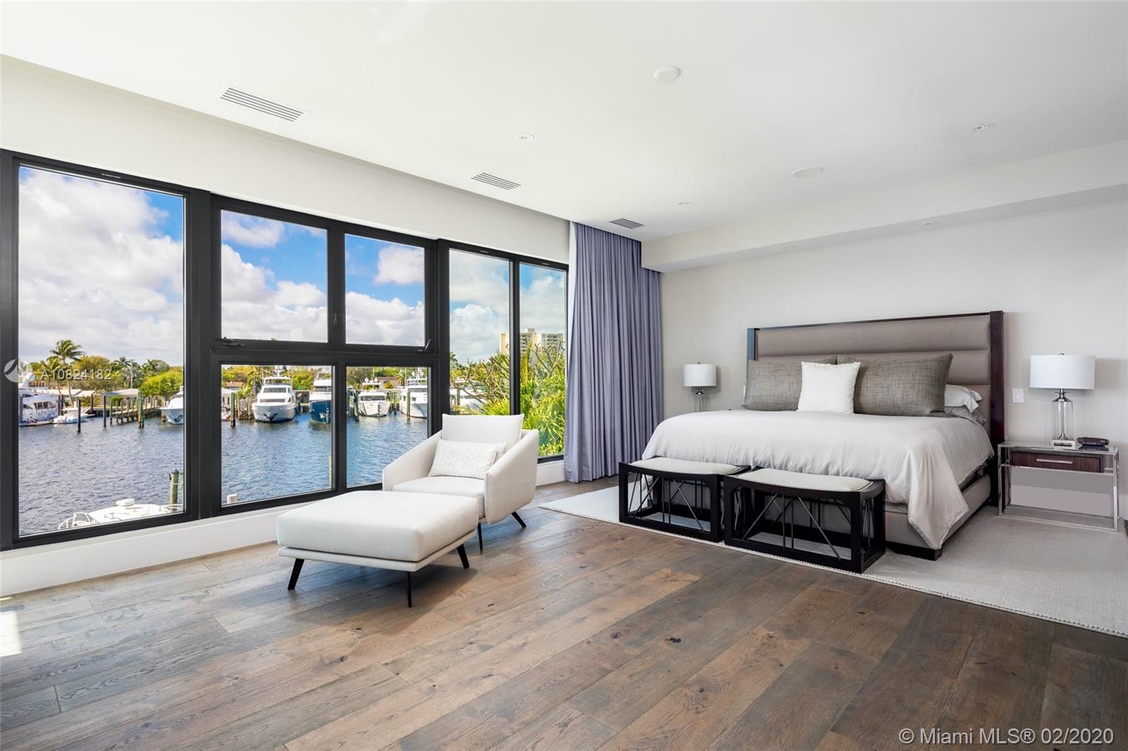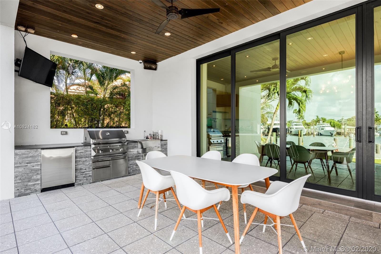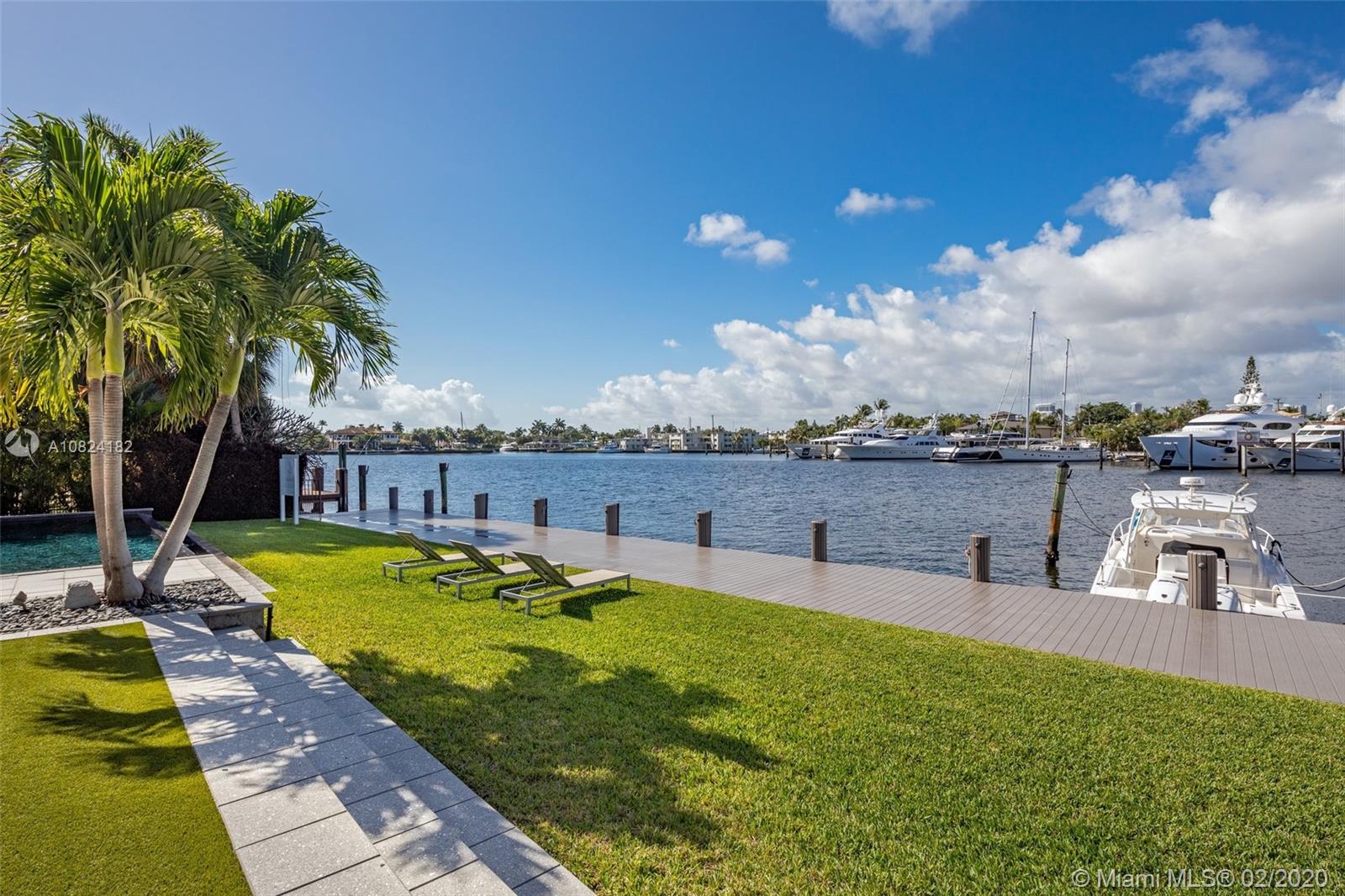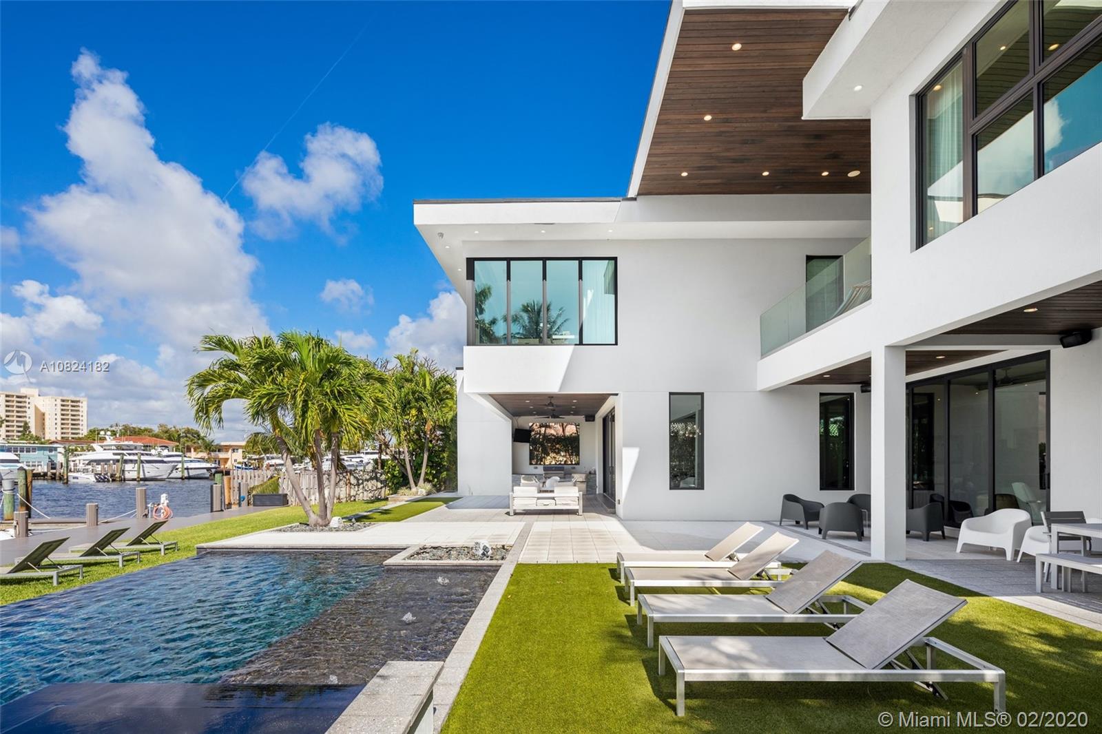 Modern Yachtmans Architectural Waterfront Paradise featuring jaw dropping sunset views and views of the downtown skyline, 23 foot ceilings, over 100 feet of deep wide water views and located in the prestigious Sunrise Intracoastal gated community. The open floor plan amplifies the view upon entry. The seamless indoor to outdoor living space makes perfect for entertaining. Porcelain and wood throughout, open gourmet kitchen with breakfast area. Wet bar, fireplace, high ceilings. Upstairs den features spacious terrace. Master suite overlooks the river. Outdoor built in summer kitchen overlooking sparkling pool + jacuzzi. Over 500 feet of open water views. No wake zone, direct ocean access. Walking distance to shopping mall, restaurants and the beach!
