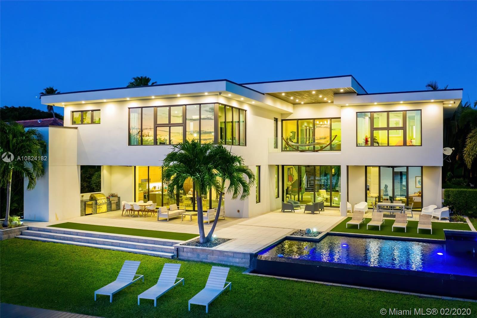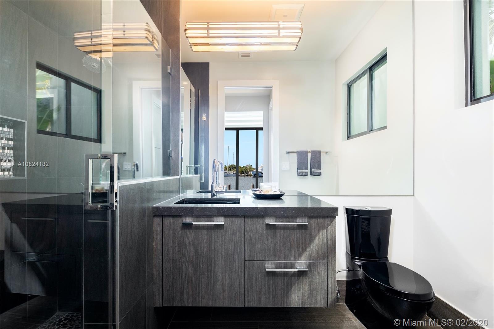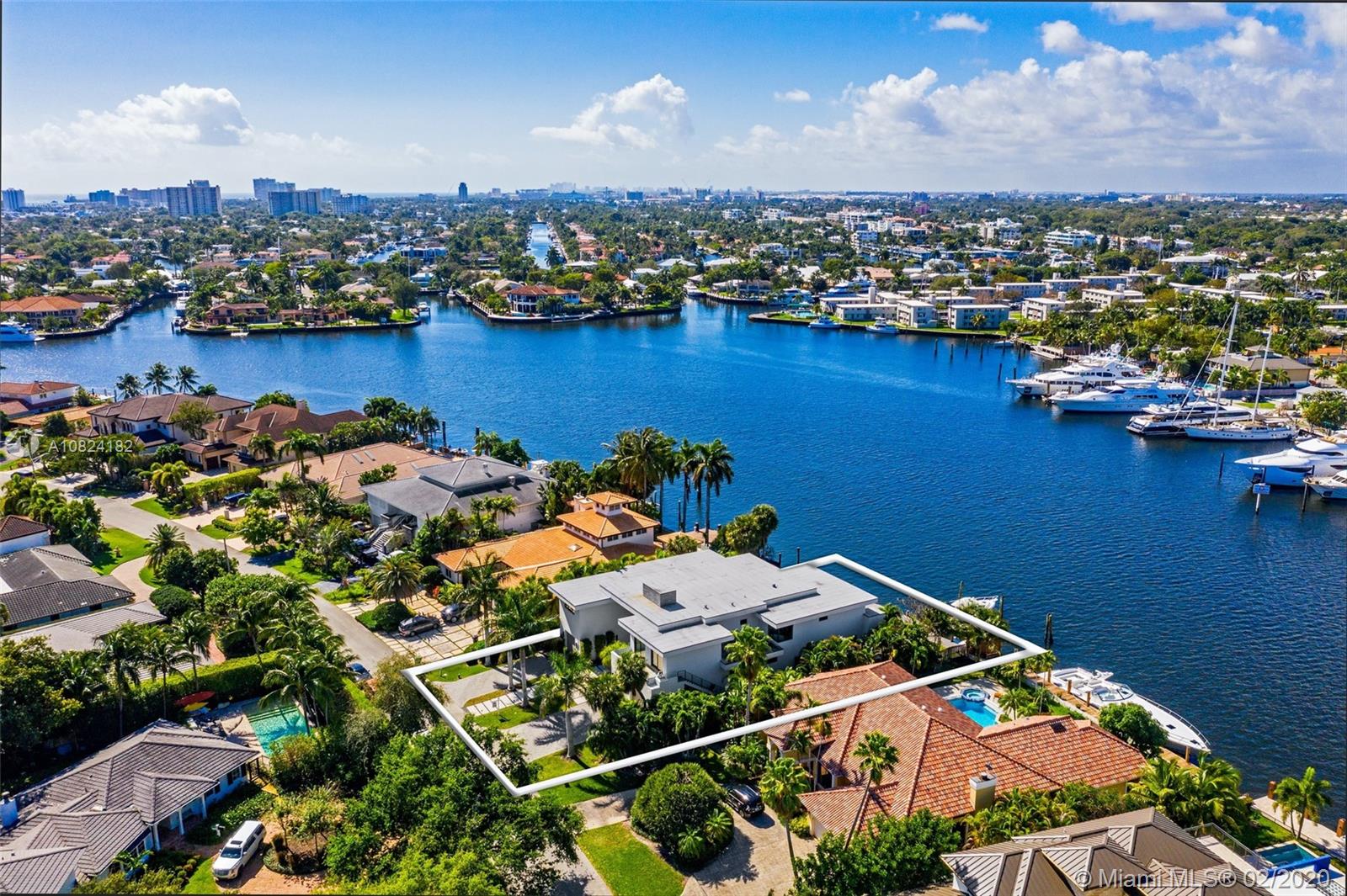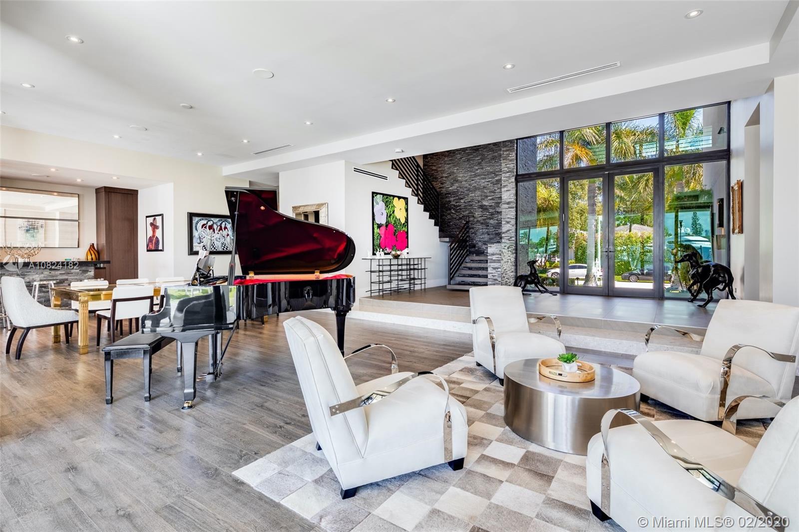 Modern Yachtmans Architectural Waterfront Paradise featuring jaw dropping sunset views and views of the downtown skyline, 23 foot ceilings, over 100 feet of deep wide water views and located in the prestigious Sunrise Intracoastal gated community. The open floor plan amplifies the view upon entry. The seamless indoor to outdoor living space makes perfect for entertaining. Porcelain and wood throughout, open gourmet kitchen with breakfast area. Wet bar, fireplace, high ceilings. Upstairs den features spacious terrace. Master suite overlooks the river. Outdoor built in summer kitchen overlooking sparkling pool + jacuzzi. Over 500 feet of open water views. No wake zone, direct ocean access. Walking distance to shopping mall, restaurants and the beach!