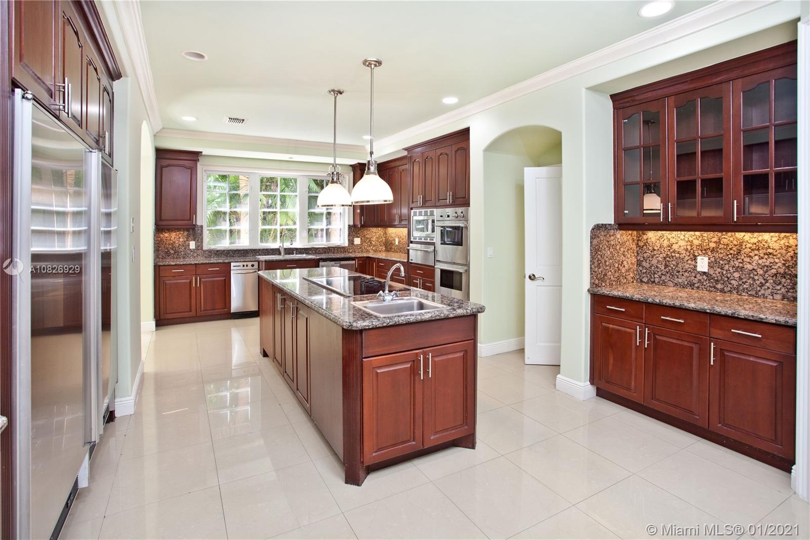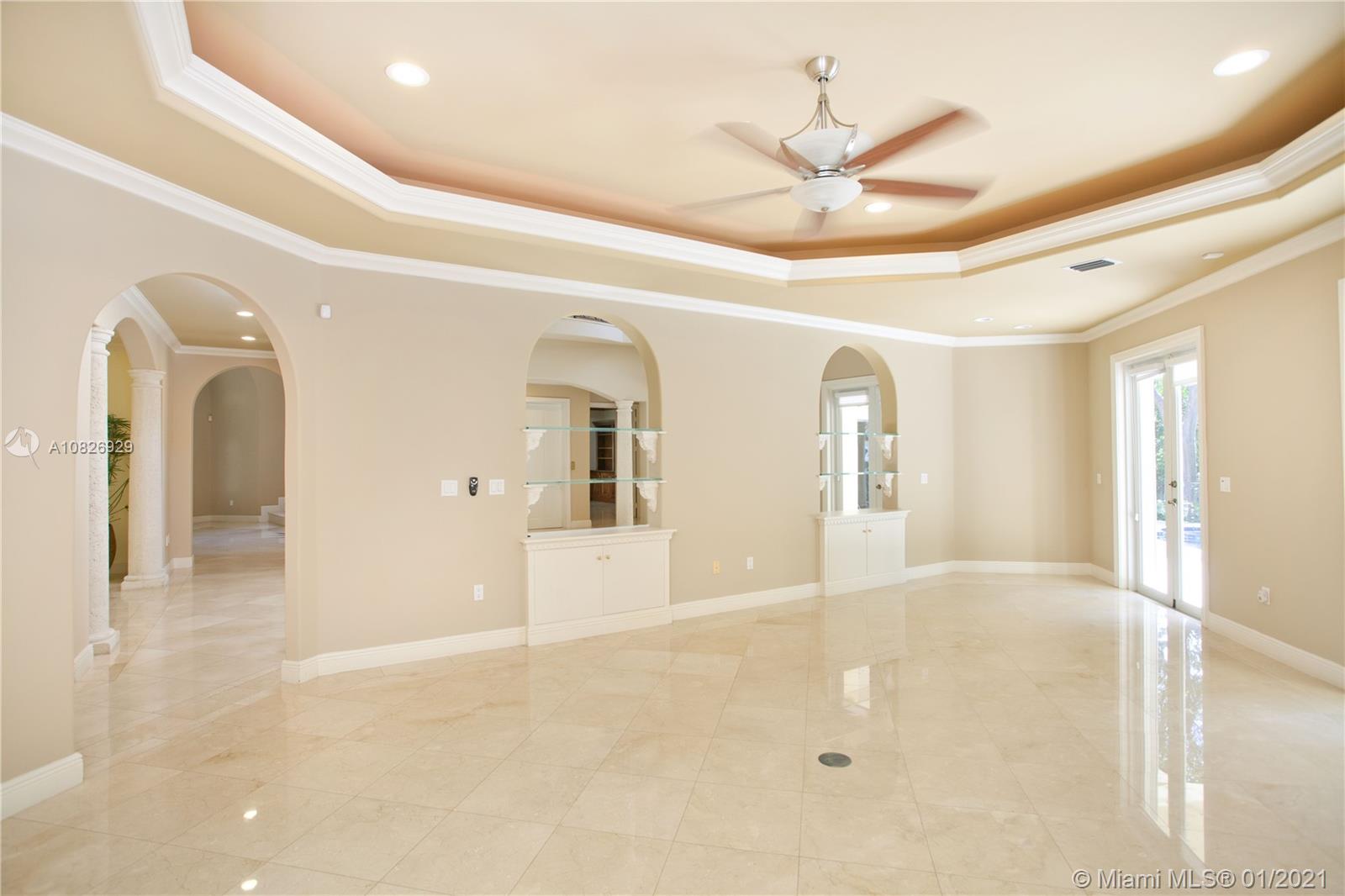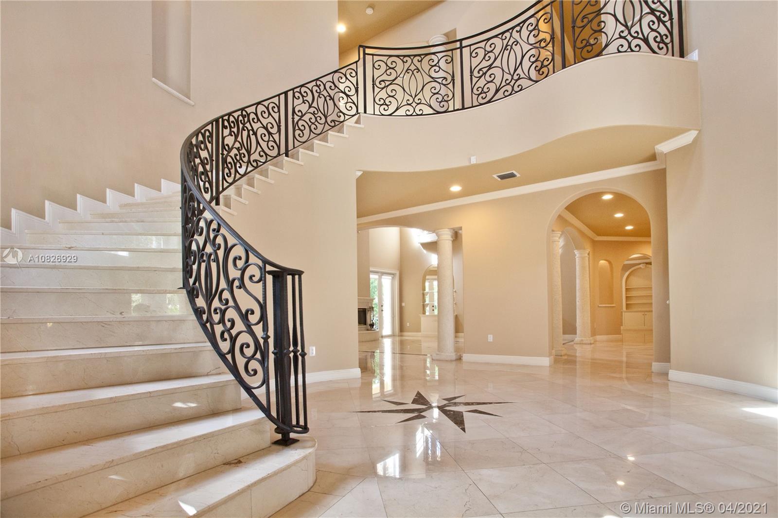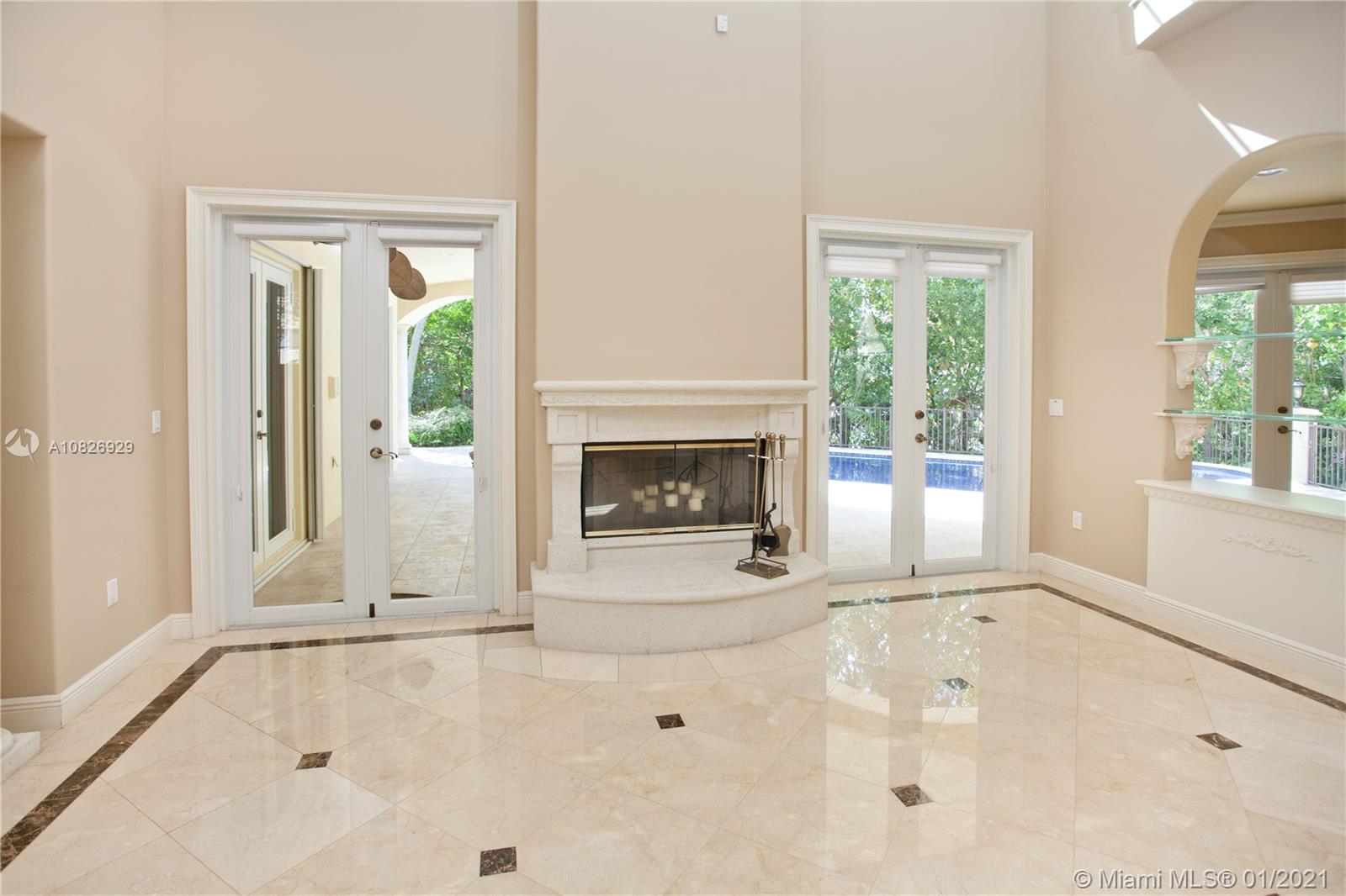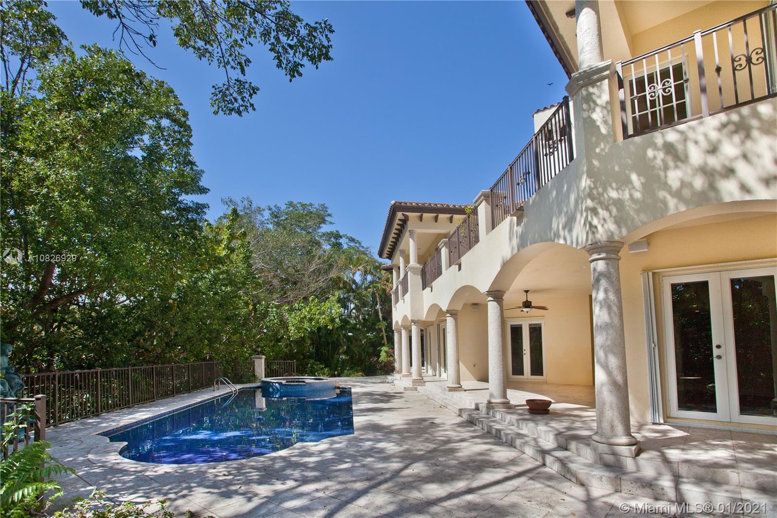 NEW PRICE! No bridges to Bay in Islands of Cocoplum. Gated for privacy on 20,862 sq ft lot on cul-de sac. Porte cochere & double door opening to foyer, high dome ceiling & winding staircase, elevator, formal living rm w/fireplace & formal dining rm. Family rm & large kitchen w/breakfast area. Across the living rm, there are a powder rm, studio/office, large guest suite, cabana bath. On 2nd floor, the private spacious main suite features 2 walk-in closets, 2 vanities, his & her water closets & large terrace. Bedrm wing features 3 en-suites & a den/office. The patio has a large covered terrace, pool & dock. Marble & hardwood floors. 3-car garage, Laundry rm, staff qrtrs. Impact windows and accordion shutters. AS-IS dock, needs work.