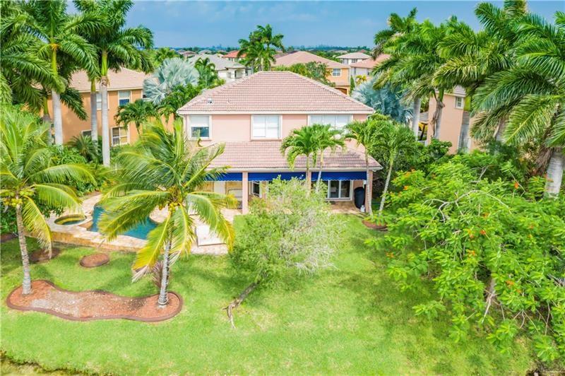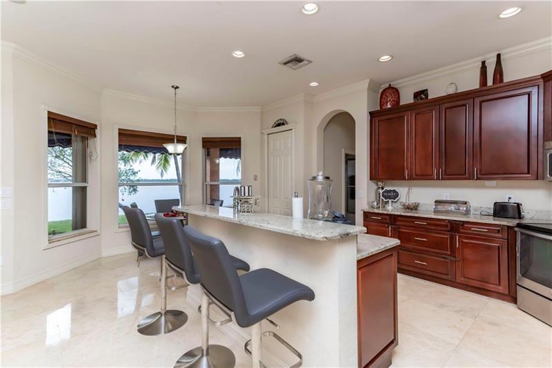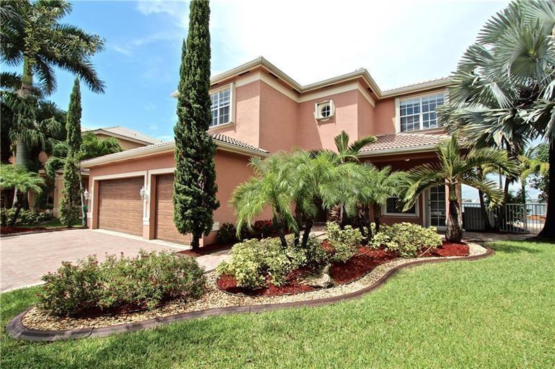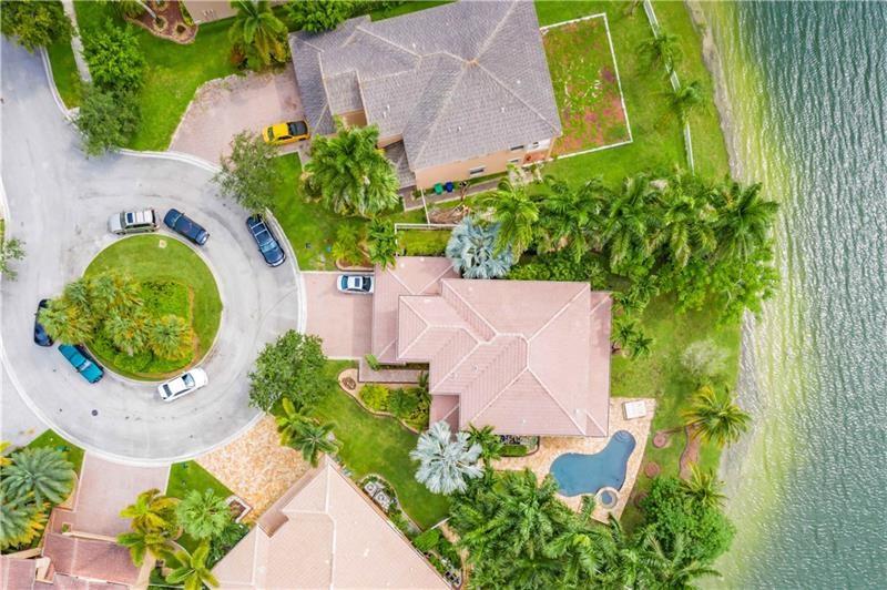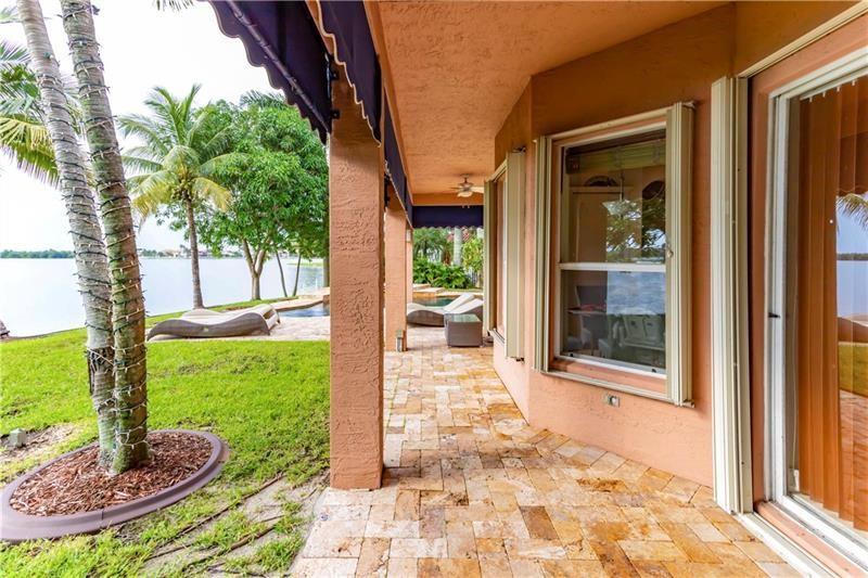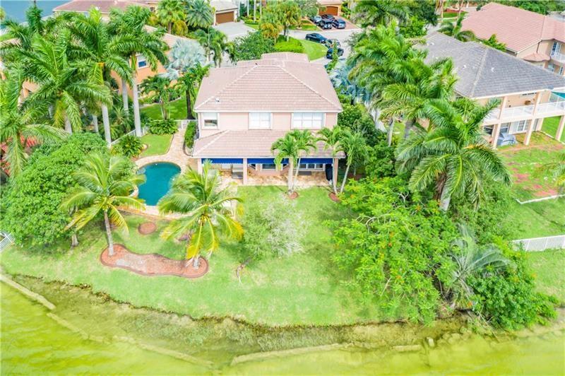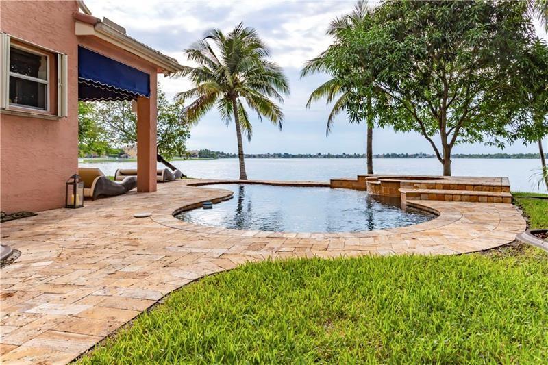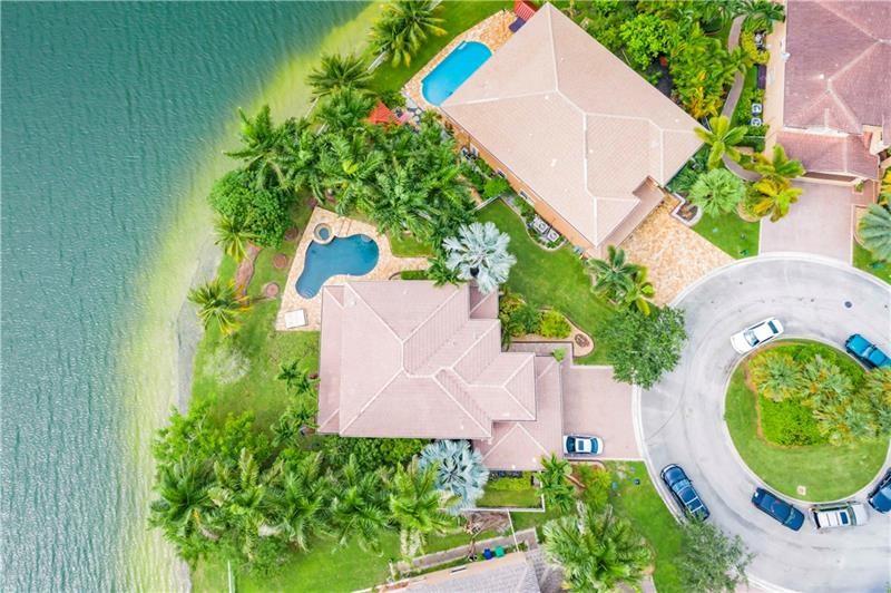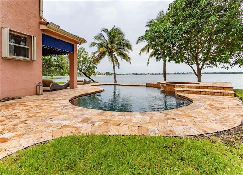 Welcome to the most spectacular wide lake views in Sunset Lakes! Waterfront 6 bedroom 4.5 bath home with a 3 car garage at the end of a cul-de-sac on an oversized lot that extends out over the lake. Features include an updated kitchen with river white granite counter tops, stainless steel appliances and cherry wood cabinets, a first floor guest bedroom with cabana bath, a separate entranced office, an enormous master bedroom with a large sitting area and his/her bathrooms connected by the shower, an upstairs laundry room, polished travertine tile throughout the entire first floor and all bedrooms, 2 a/c systems and a free-form heated pool with raised spa overlooking the panoramic views and amazing sunsets.