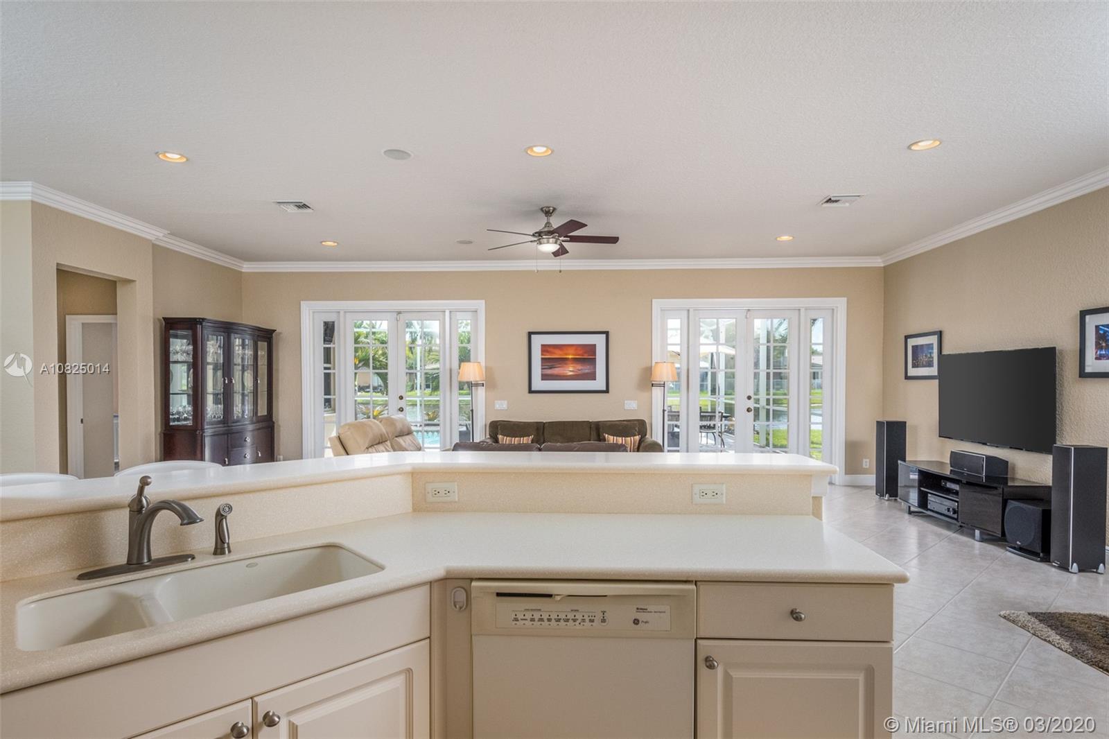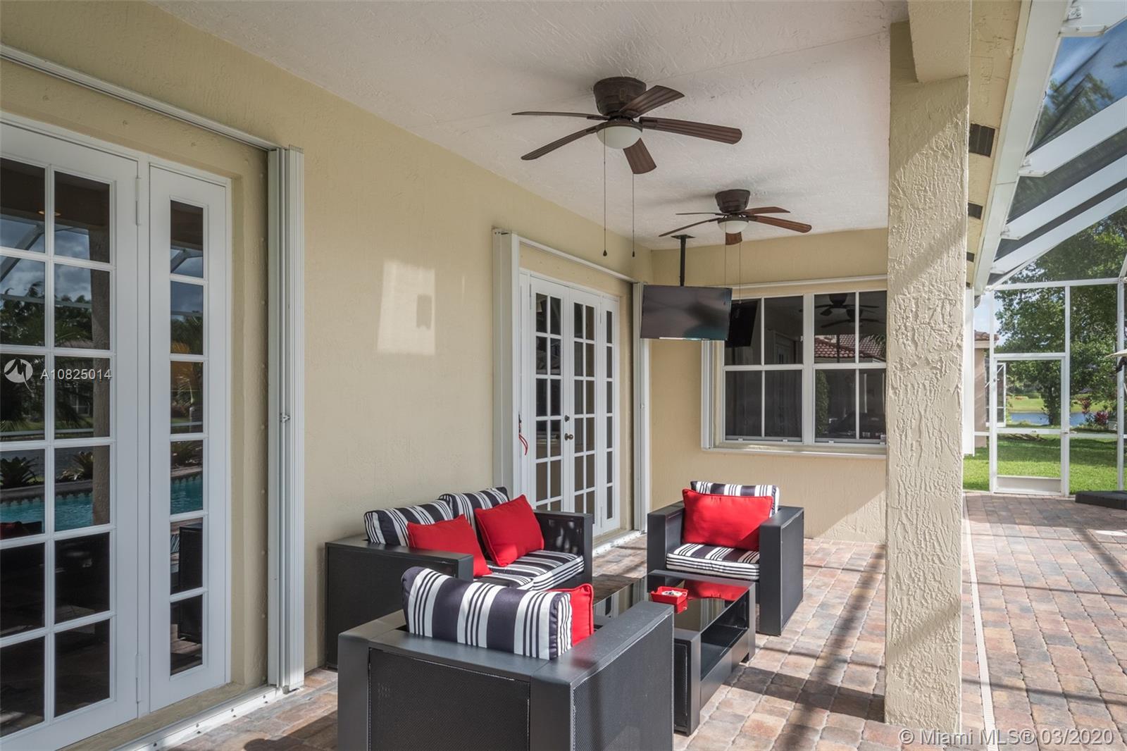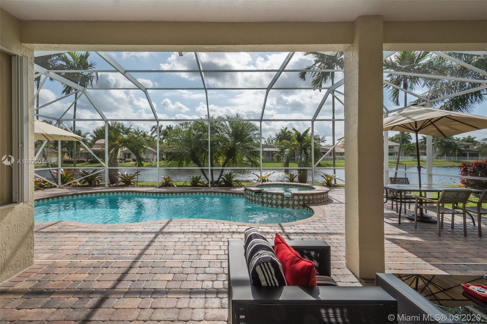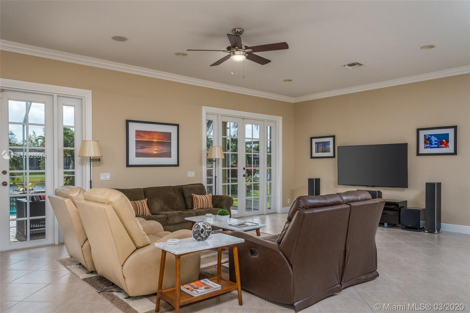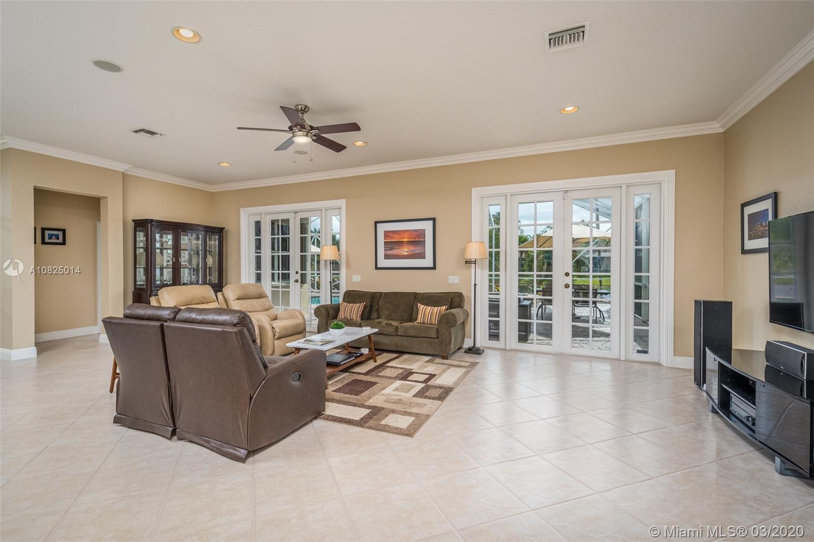 Serene backyard oasis, with pool, hot tub and water views that feels like another living room with the included outdoor tv and furniture. Large french doors that fully open to views of pool and water and create an indoor/outdoor feel in the open floor plan. Professionally tinted windows and doors increase daytime cooling efficiency and privacy. New high efficiency, 2 stage AC and Pool heater (2016). Bright white crown moldings and raised baseboards against neutral wall coloring create a resort like feel. Accordion shutters on windows and doors allow for low stress hurricane prep.