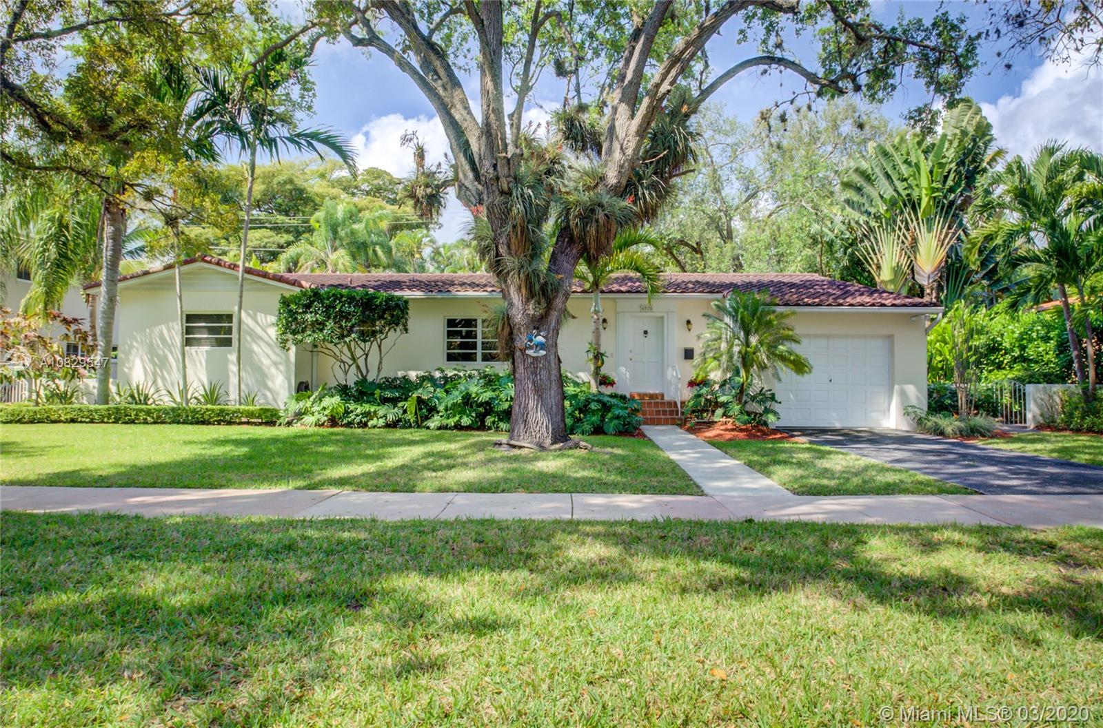 Nestled in the highly coveted neighborhood of South Coral Gables, sits a charming 3-bedroom, 2-bathroom home ready for you to make your own. Lovingly cared for, this warm and inviting home features generously sized bedrooms with plenty of storage and wood floors throughout most of the home. A bright and sunny family/dining room invite the outside garden in through double sets of French doors. The lush foliage in the backyard lend the perfect backdrop to your morning coffee, yoga routine and dining alfresco, with plenty of space to add a pool. Mature mahogany and oak trees welcome you home each day as you turn in on Mindello making this home's location perfect for updating to your taste or rebuilding the home of your dreams!