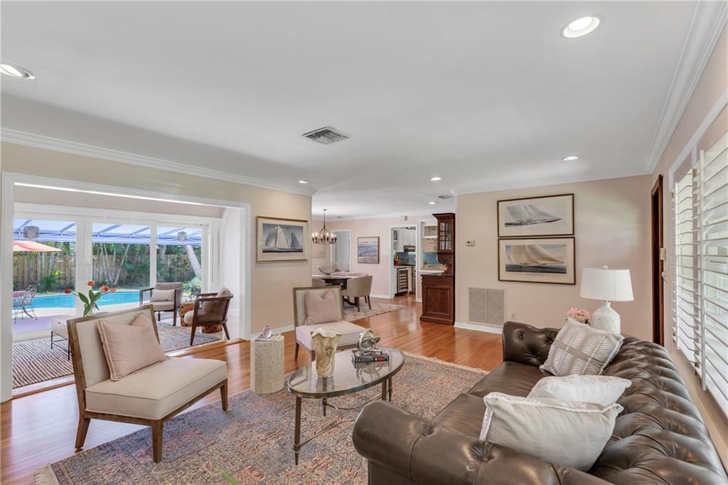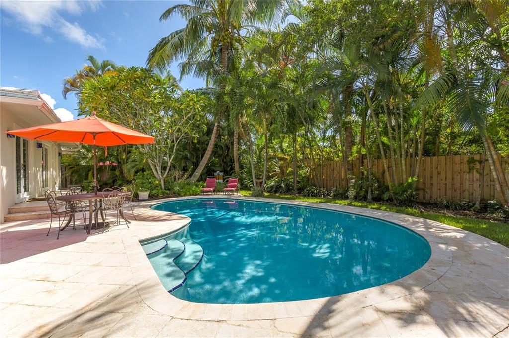 Charming Rio Vista 4 bedroom, 3 bath home on a rare, double lot (12,500 sq. ft.). Beautiful backyard with covered lanai, patio and free form pool. Lush, tropical landscaping surrounds the yard for privacy and ideal entertaining. Spacious interior includes formal living room with wood burning fireplace, formal dining, large family room with sliding glass doors that open to the patio and pool, and an office or den with sliding glass doors to the lanai. Remodeled kitchen has eat-in dining space, stainless steel appliances with wine cooler and gas cooking. Move-in ready with impact windows and doors and a newer roof (2017).