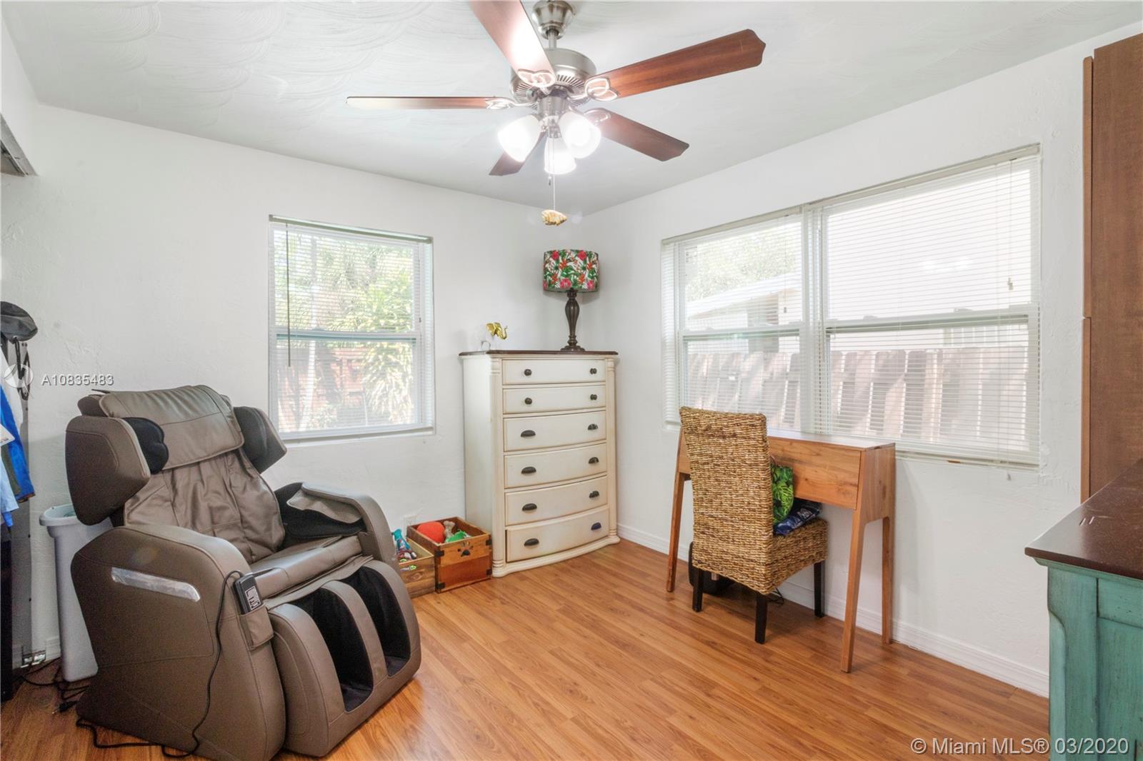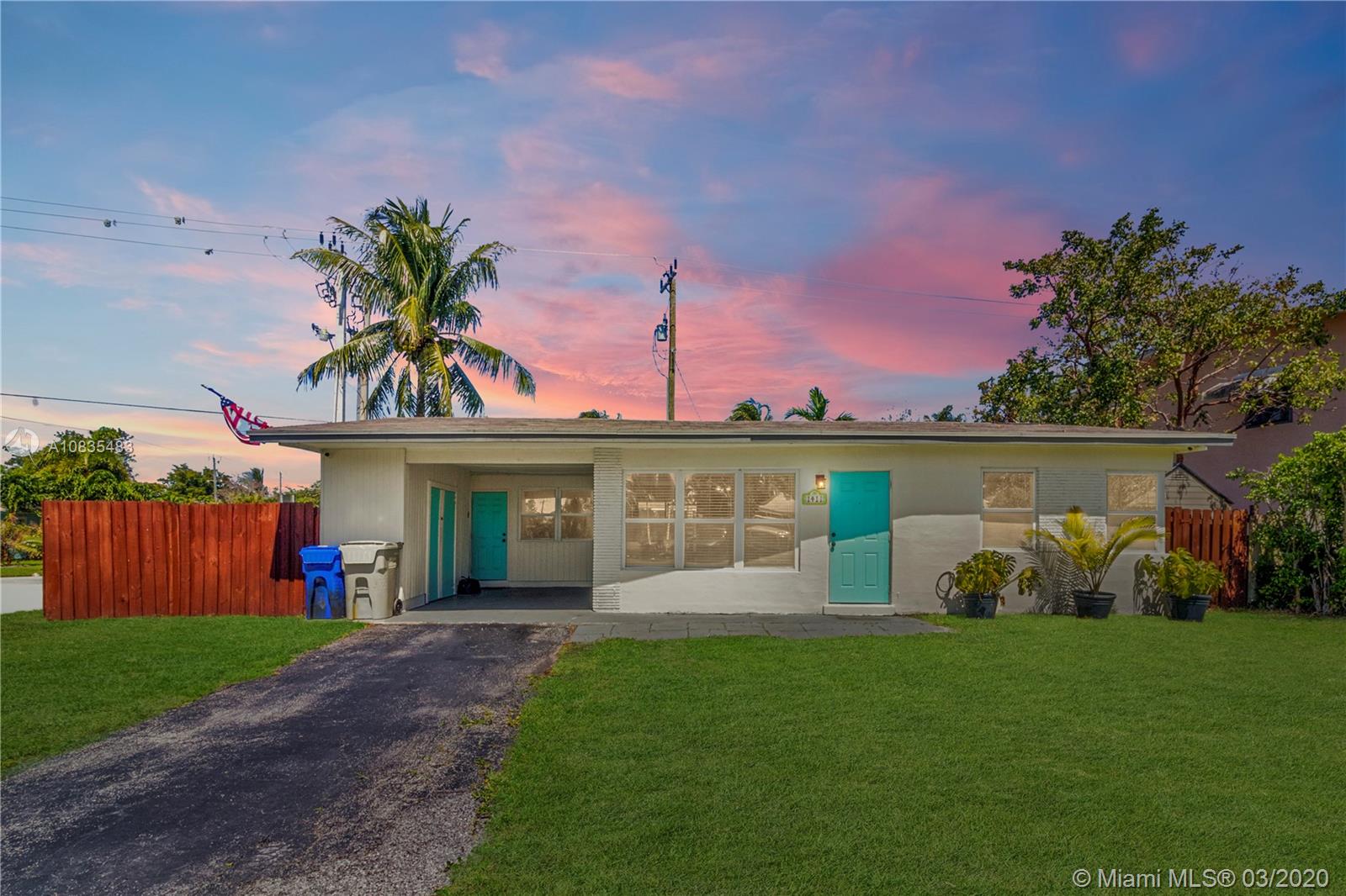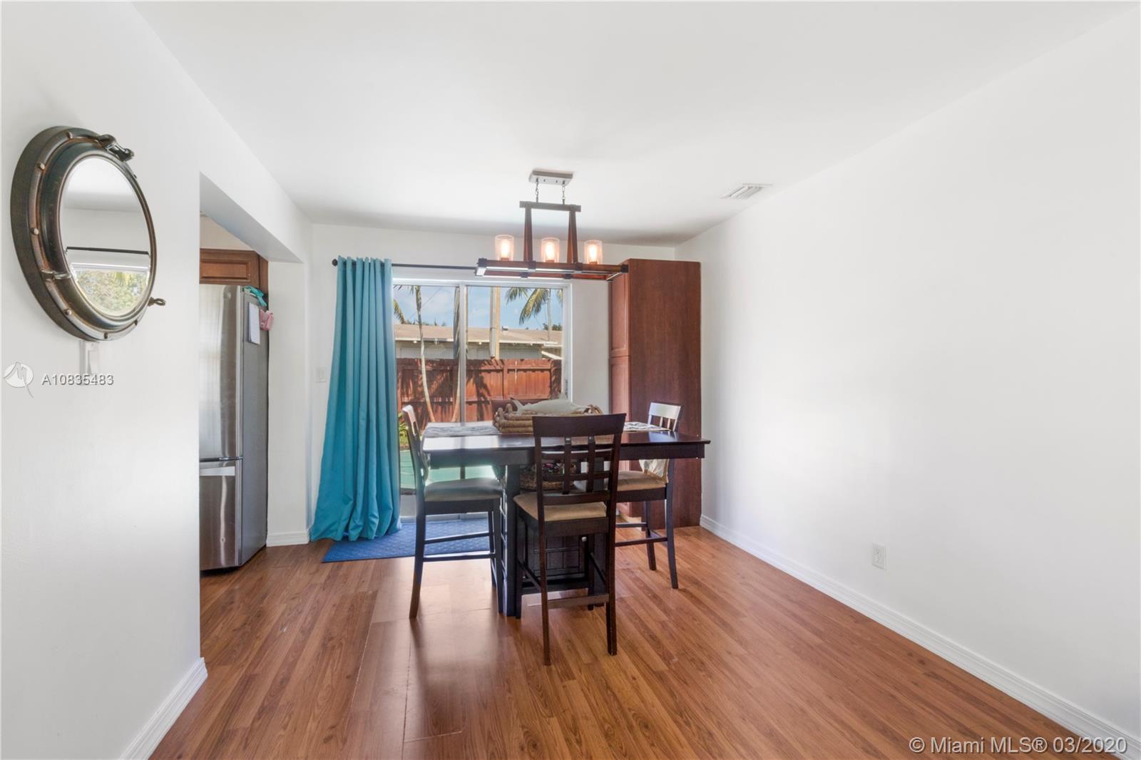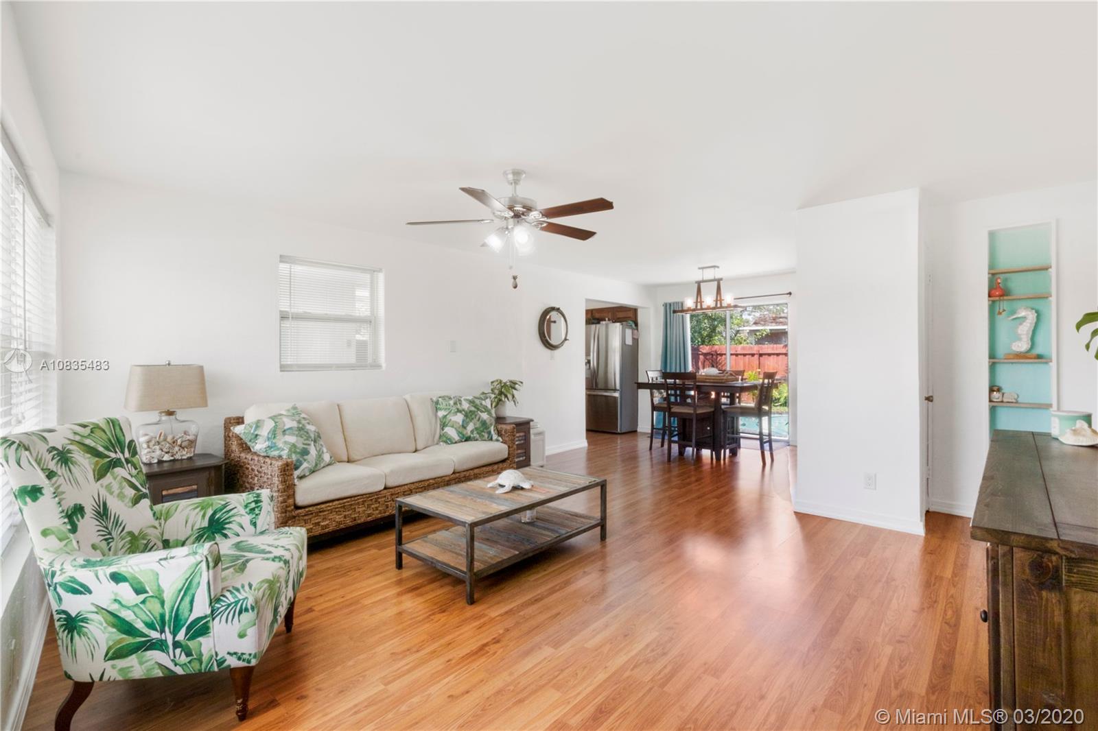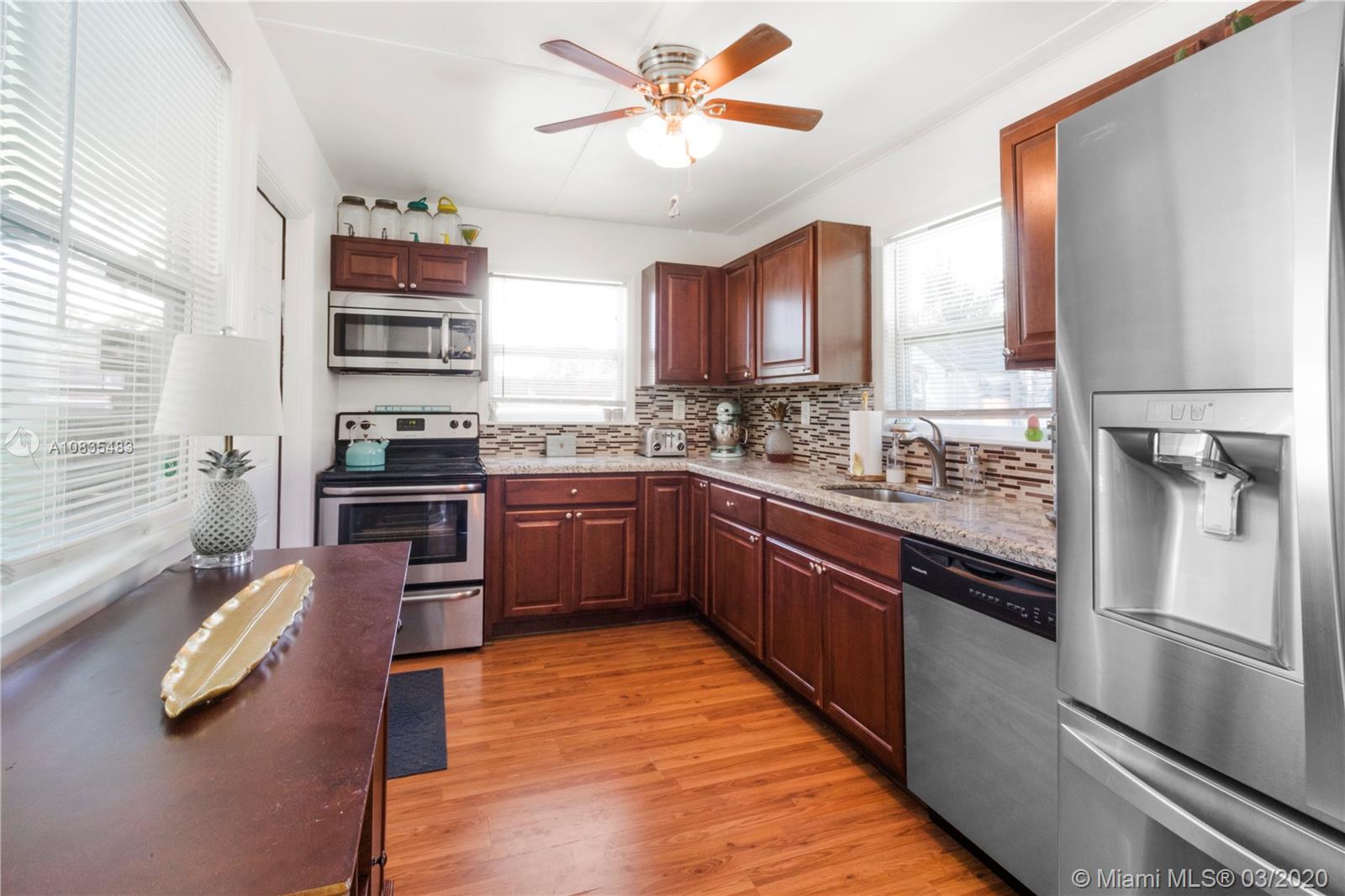 Priced below Appraised Value! Turnkey 2 bedrooms, 1 bathroom home featuring elegant wood laminate floors throughout the home, with ample and bright open spaces and plenty of natural light entering through the hurricane impact windows. The updated kitchen offers dark wood cabinetry with granite countertops, designer backsplash, and stainless steel appliances. Retreat to your bedroom and relax or choose to exit the sliding glass doors to your exclusive swimming pool and backyard hosting tropical plants, space to set up your gourmet outdoor grill plus have enough space to build your kids a swing set, park your boat or RV or simply have extra space to host your favorite celebrations. Carport with extra storage and one storage shed in the backyard plus a newer roof and plumbing on a corner lot.