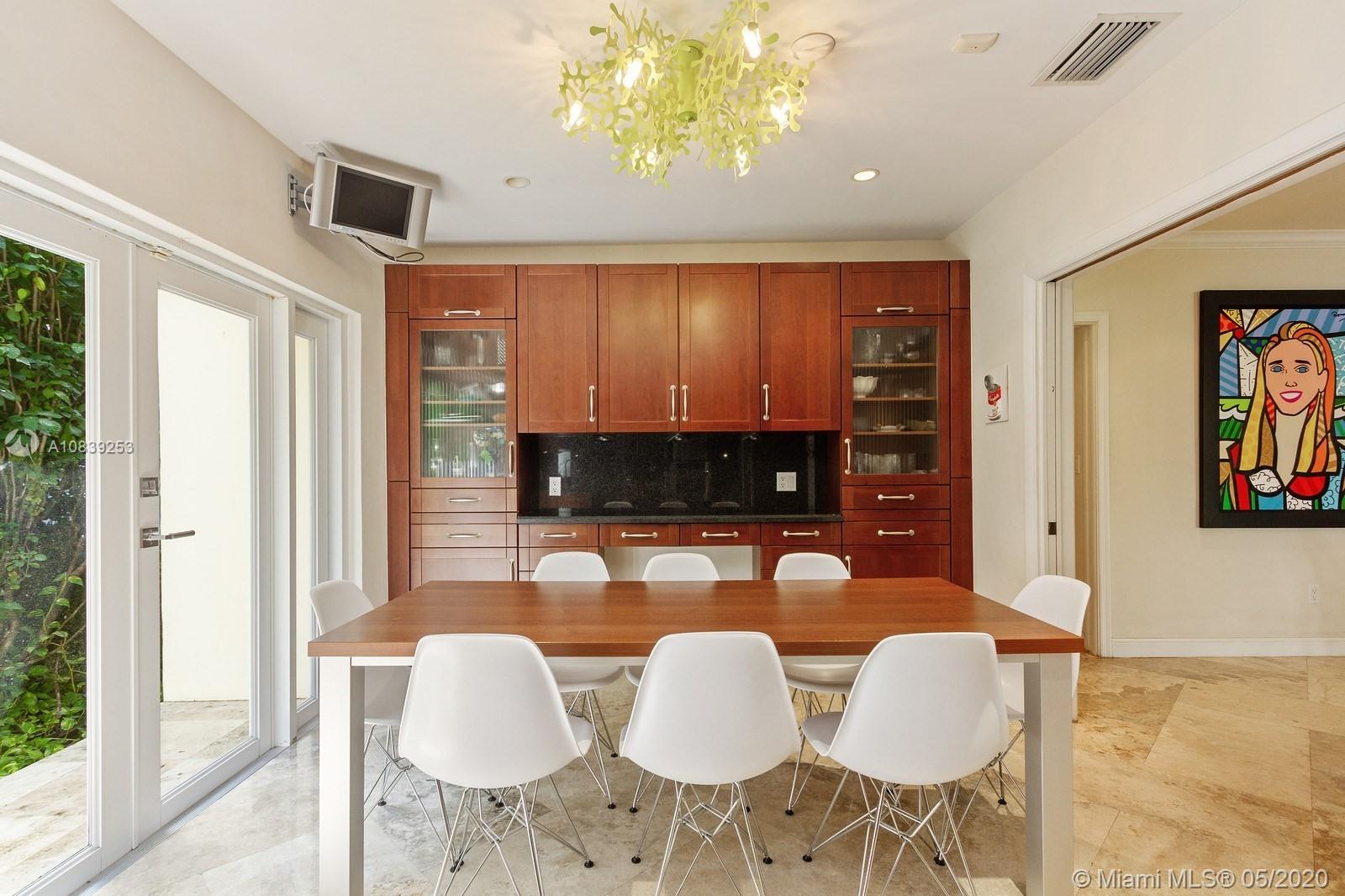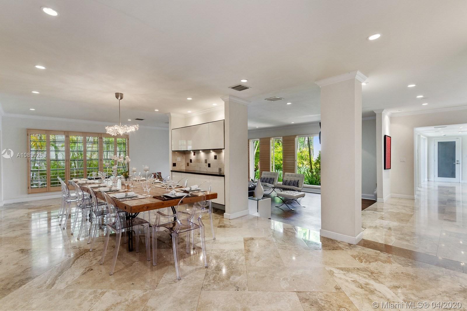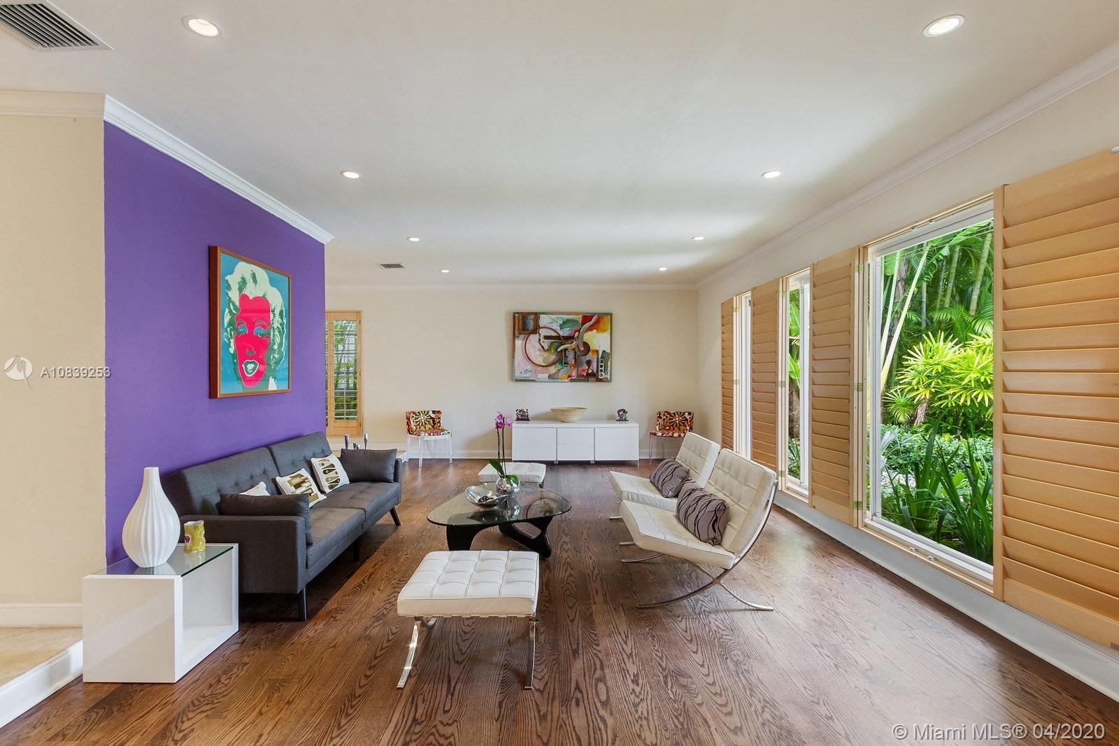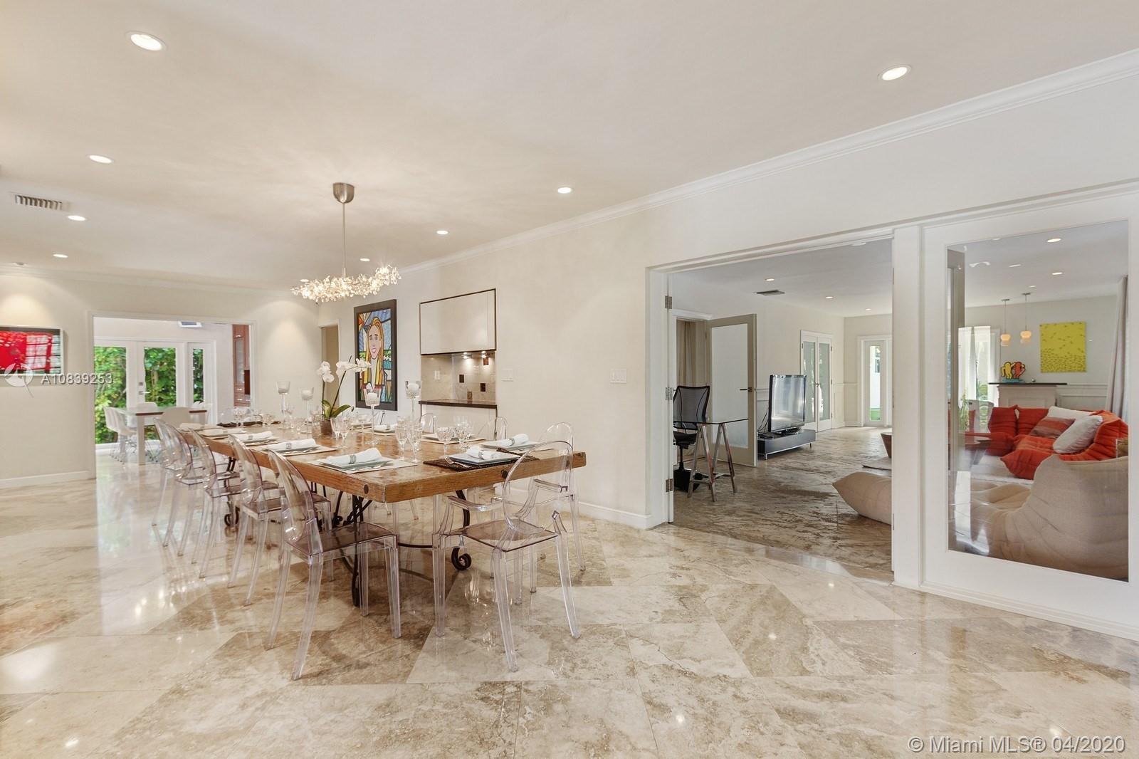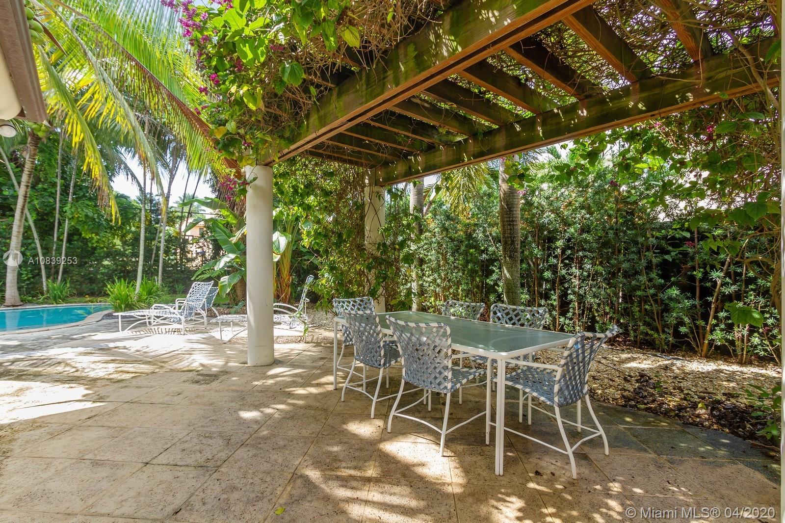 Beautiful Mid-Century modern house on the prestigious North Bay road featuring front walled courtyard for the additional privacy. This house has 5 bedrooms and 4 full bathrooms, marble and wood floors, extra large kitchen with high end appliances. Large and open living/dining and family/entertainment areas that would serve well a big family or a big gathering. Family/entertainment room has a wet bar and the double doors leading to the very private backyard with the dining area under the pergola and the pool surrounded by the lavish mature greenery.