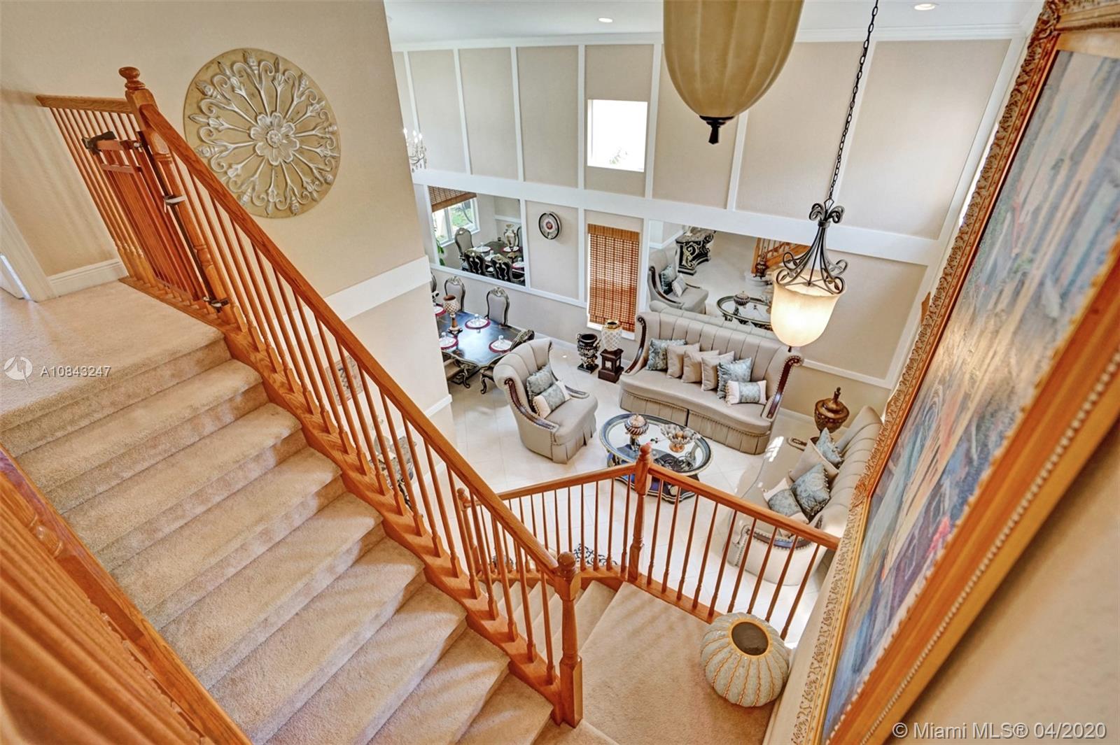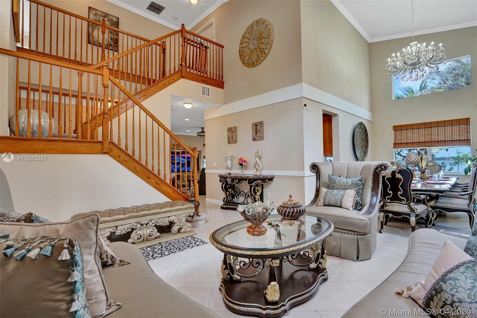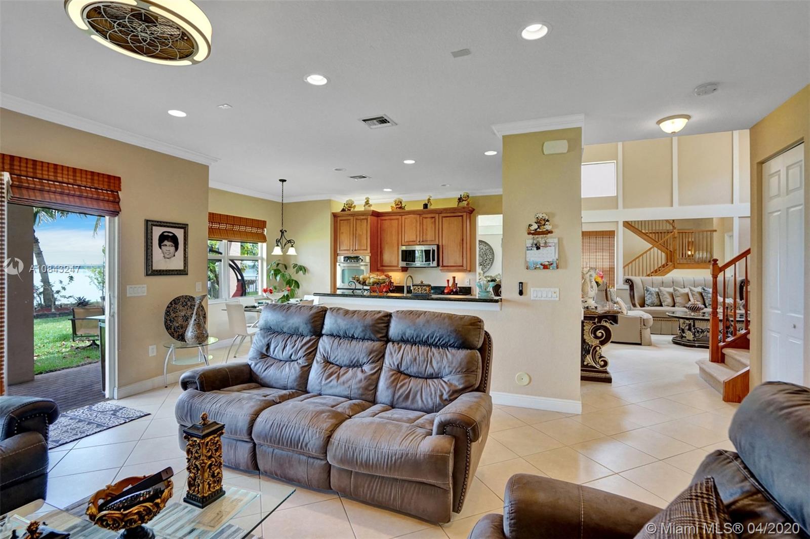 BACK ON THE MARKET Gorgeous 2 story home w/Premium lakefront lot in highly sought after Sunset Falls Community. It features breathtaking panoramic Lakefront views over a mile long. Open floor plan encompasses 5 spacious bedrooms with 3 full updated bathrooms & kitchen. Bedroom & full bathroom downstairs. The vaulted ceilings add to the expansive elegant feel. Balcony off the Master Bdrm great to enjoy entrancing sunsets and sunrises unique to this premium oversize lot. Patio ideal for entertainment or evening dinning al fresco. This home has been meticulously cared for. High tech security system. Smart a/c thermostat. New a/c handler and a/c unit. Crown molding and baseboard throughout, Mirrors and wall décor Victorian style. Formal D.R. Chandelier & Refrigerator are NOT included in Sale.
