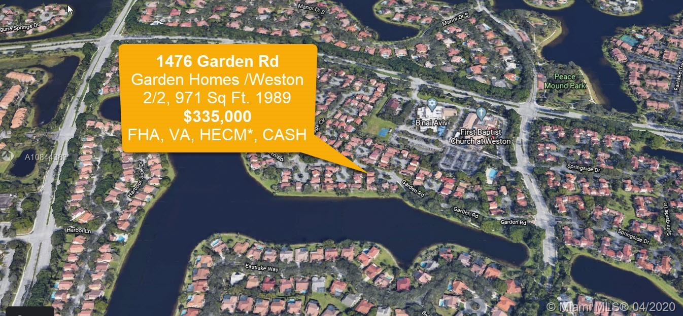PRICE REDUCED: $320,000--Just off the edge of Bonaventure lies Weston's Garden Homes, a Quiet Zero Lot Line community. This very rare two bedroom/2 Bath corner not is now available. Accordion Windows Surround you; the kitchen was re-done with all the modern amenities; the roof was renewed in 2012, the HVAC replaced in 2016. Walk to Country Isles Elementary or Sage. Walk to Church, Synagogue, restaurants and downtown Weston. Whether you are beginning your family or stepping out of the empty nest to retire. See virtual Open House 24/7 as well.