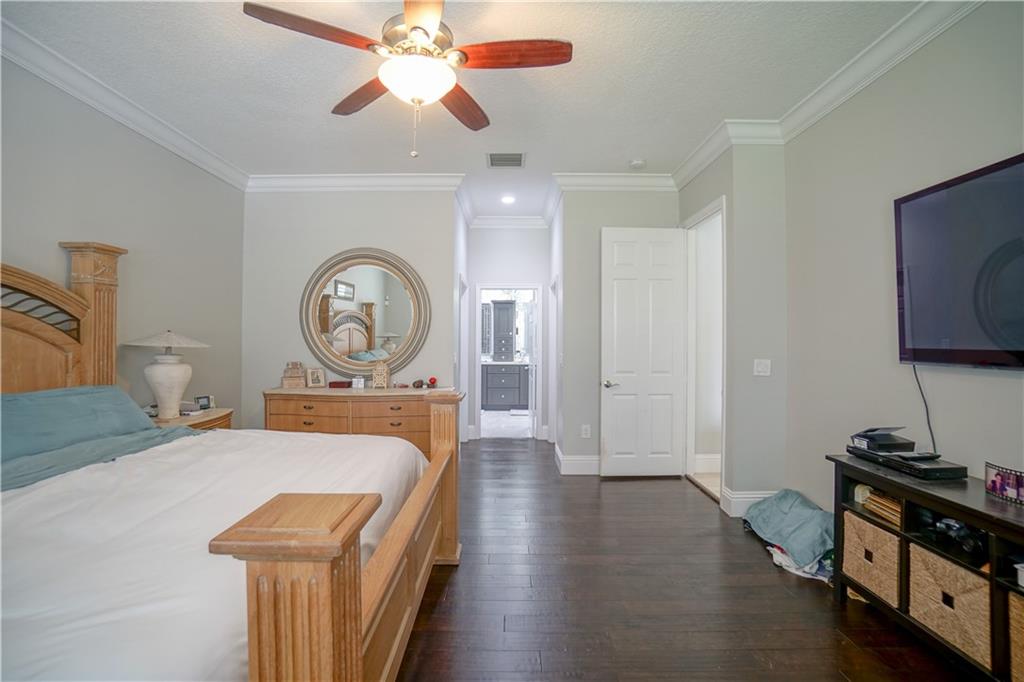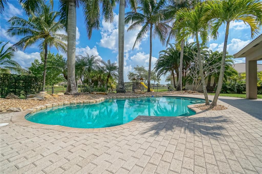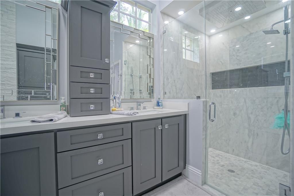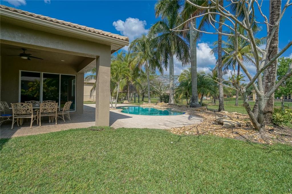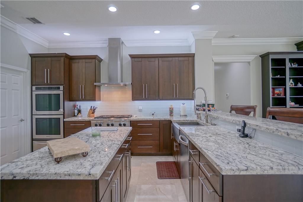 This home is upgraded to the max! MARBLE & WOOD floors throughout. EXPANDED KITCHEN has deep SHAKER OMEGA CABINETS, GRANITE COUNTERS, SUBWAY GLASS back-splash, under cabinet LED LIGHTING, STAINLESS STEEL appliances, a DOUBLE OVEN & a SIX BURNER GAS stove. Dream master bath has a 2'x2' RAIN SHOWER with DESIGNER TUB & upgraded cabinets w/ MARBLE COUNTERS. Designer built-in entertainment center in family room w/ SURROUND SOUND. Large open pool area w/ TIKI HUT. Pool has LED LIGHTING - see pics. CALIFORNIA CLOSETS throughout. Maintenance is paid quarterly.**SEE BROKER'S REMARKS**