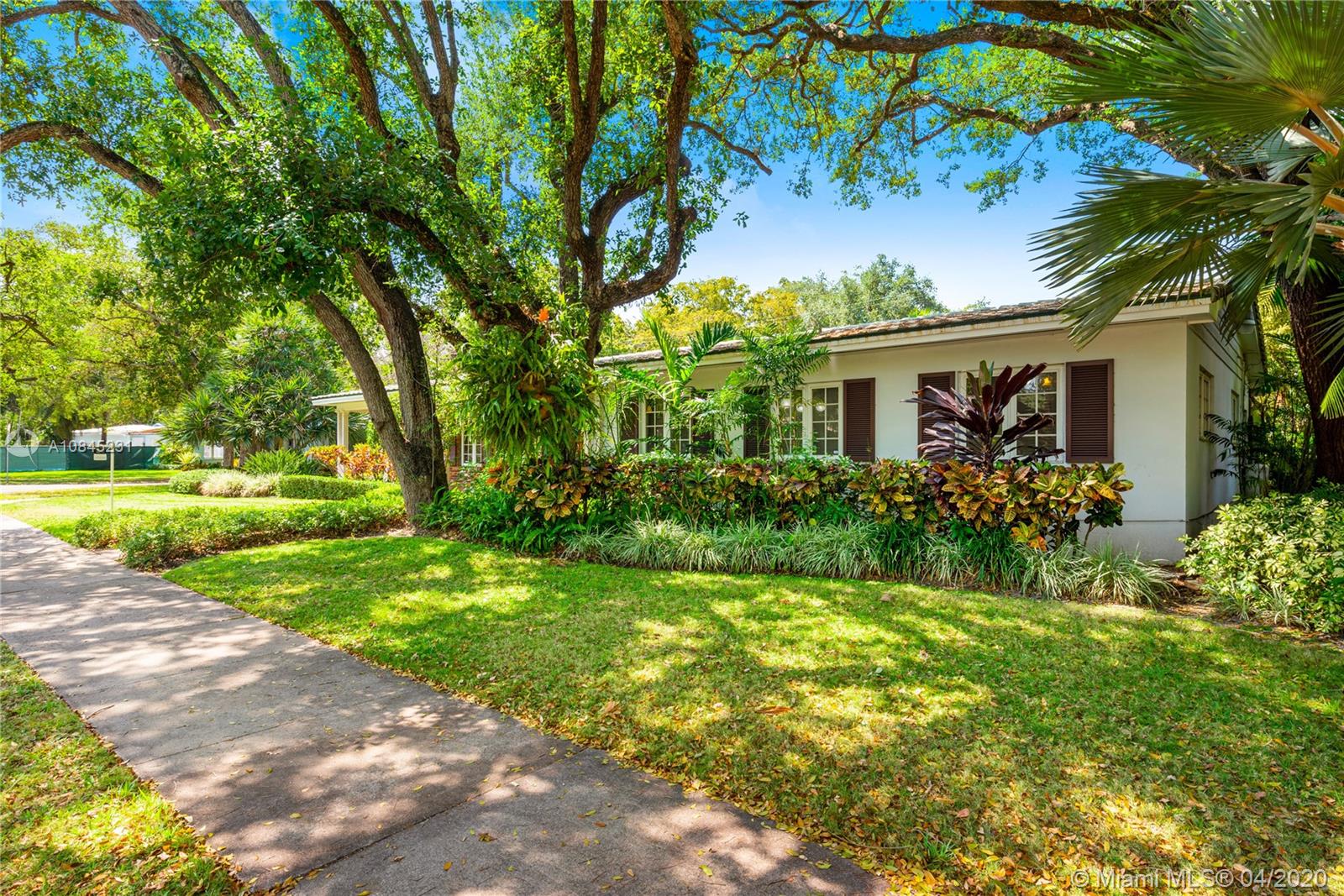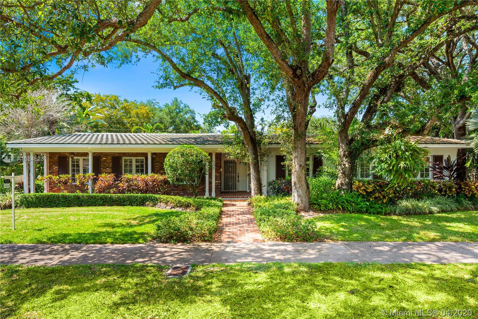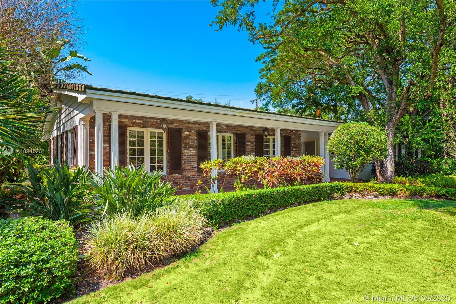 Elegant 1-story home situated on a prime corner lot on one of Coral Gables most picturesque streets. This charming residence exudes graceful elegance & offers a warm, inviting refuge for relaxation, entertaining & enjoying all the fine things Coral Gables has to offer. Impressively updated with impact windows & a standby generator, this prime offering eagerly awaits your personalized touches. With a greatroom-centric layout, there's a feeling of ample openness. Living areas boast sun-drenched vistas of the glorious gardens surrounding all sides. The 2 car garage, coupled with it's corner position, provides ample parking for guests. Just a short walk or bicycle ride to great brunch, lunch & dinner spots, flower shops, boutiques & live music venues. An envy-worthy address in every sense.