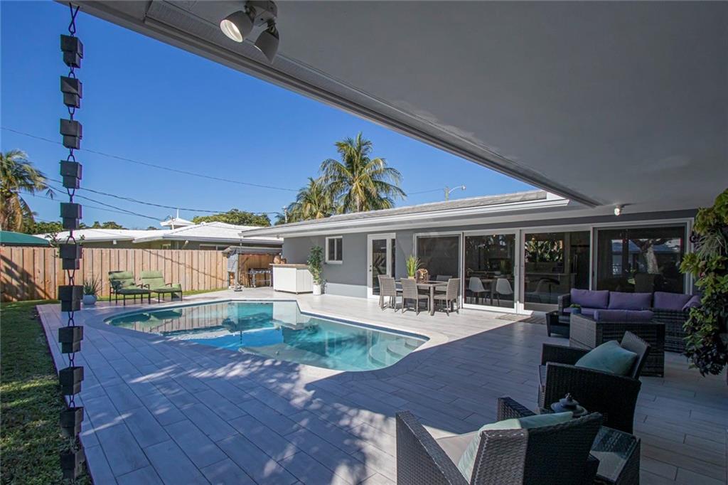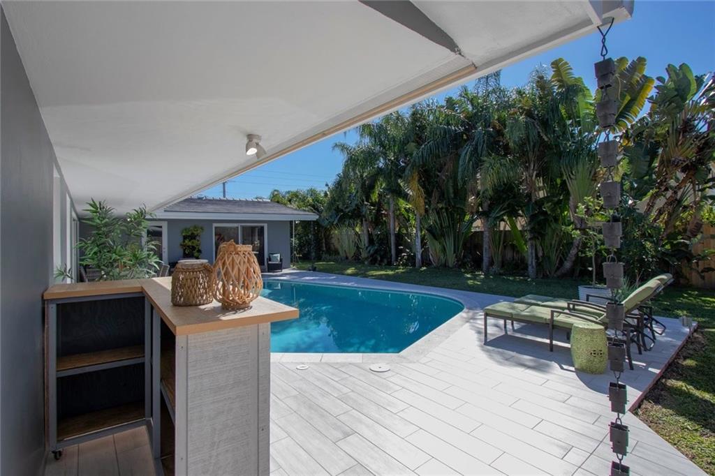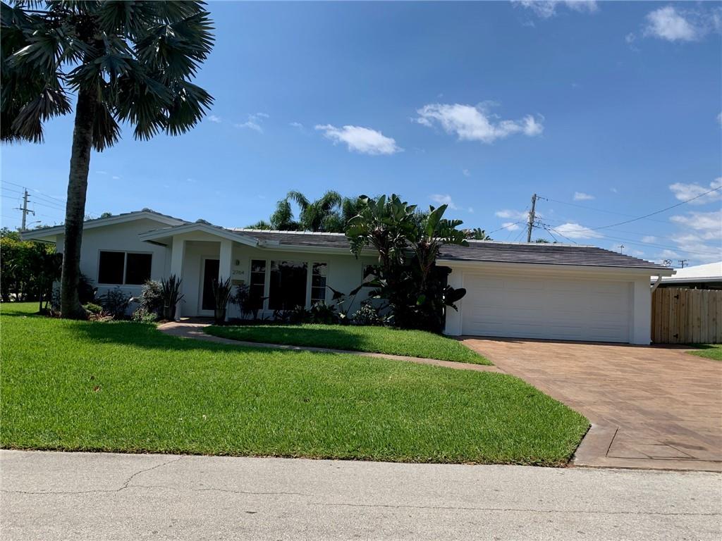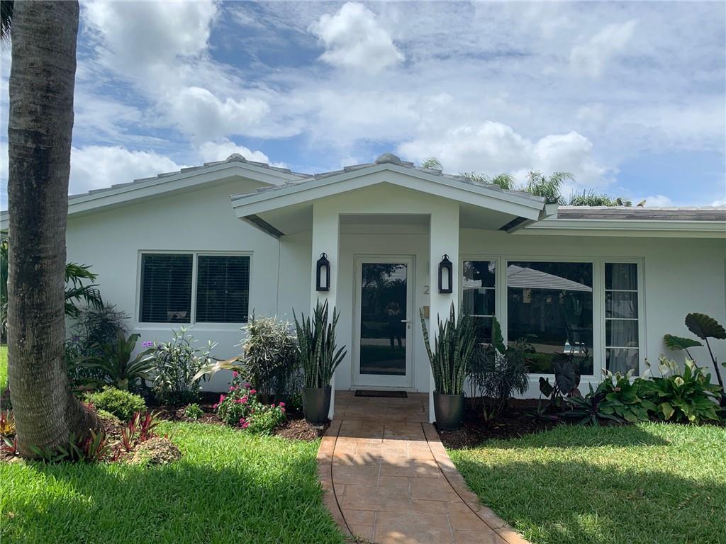 Stunning renovated home in the highly sought after Coral Ridge Country Club. Walk to the beach and restaurants. This Mid-Century home was beautifully updated and boasts all impact window's and doors, new roof with straps, mission style painted kitchen cabinets with Quartz, large open living/ dining area with 10' ceilings, restored terrazzo floors and large double sliders that bring the outdoors in. The master has a large soaking tub, marble tile, walk in closet and opens onto the patio. Bonus room for an office or guest room as well as 3 additional bedrooms. The custom pool has a beautiful tiled patio and is surrounded with palms that create a tranquil private area for enjoying the pool. Excellent location close to public beach, park, and more.