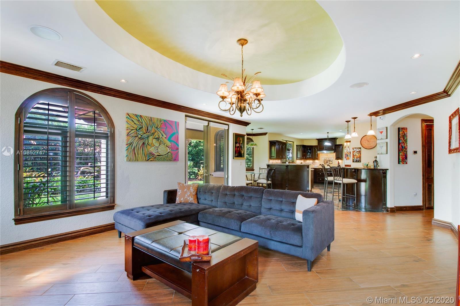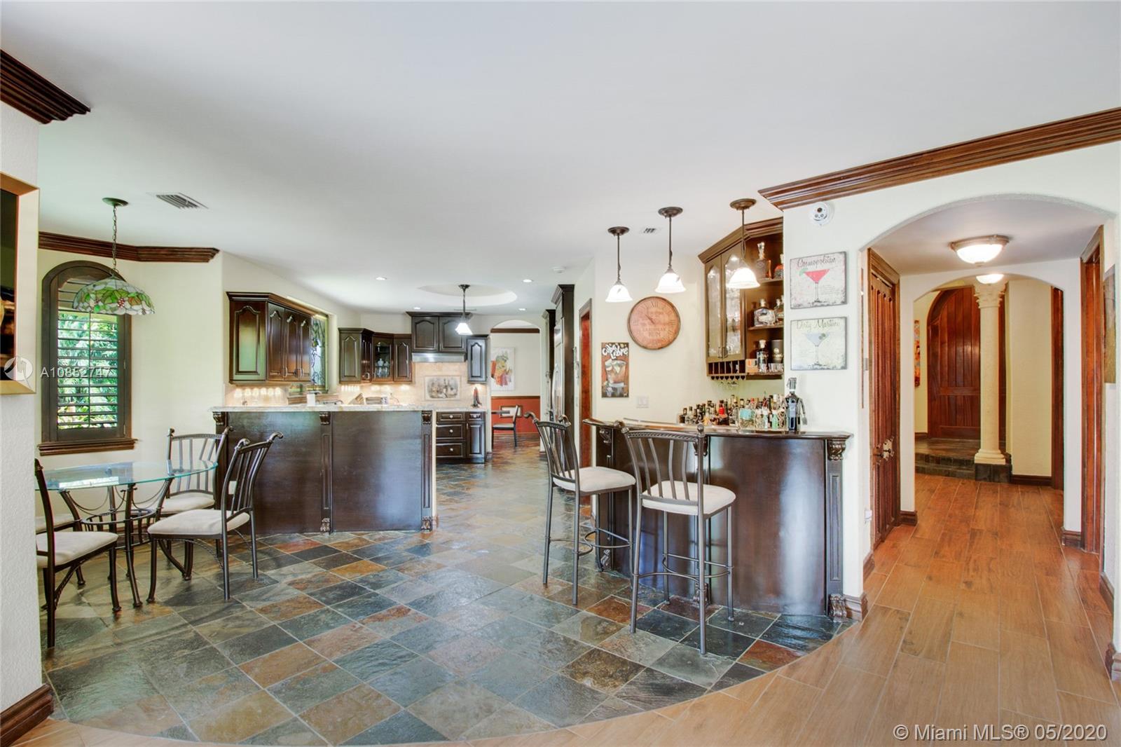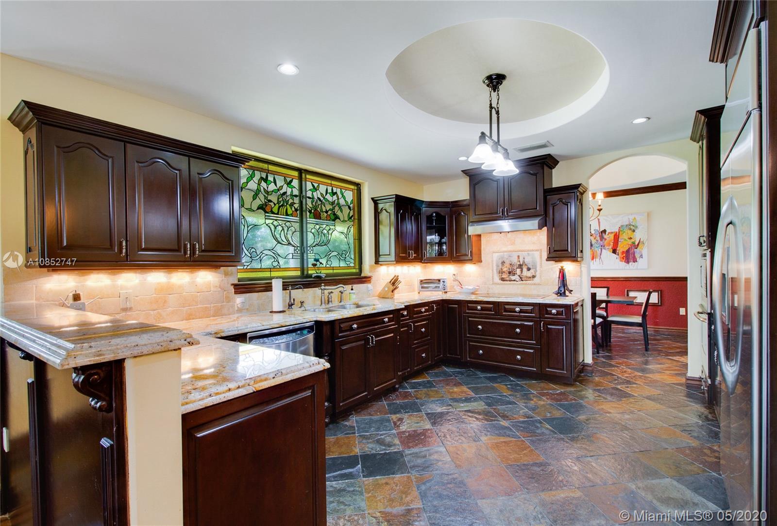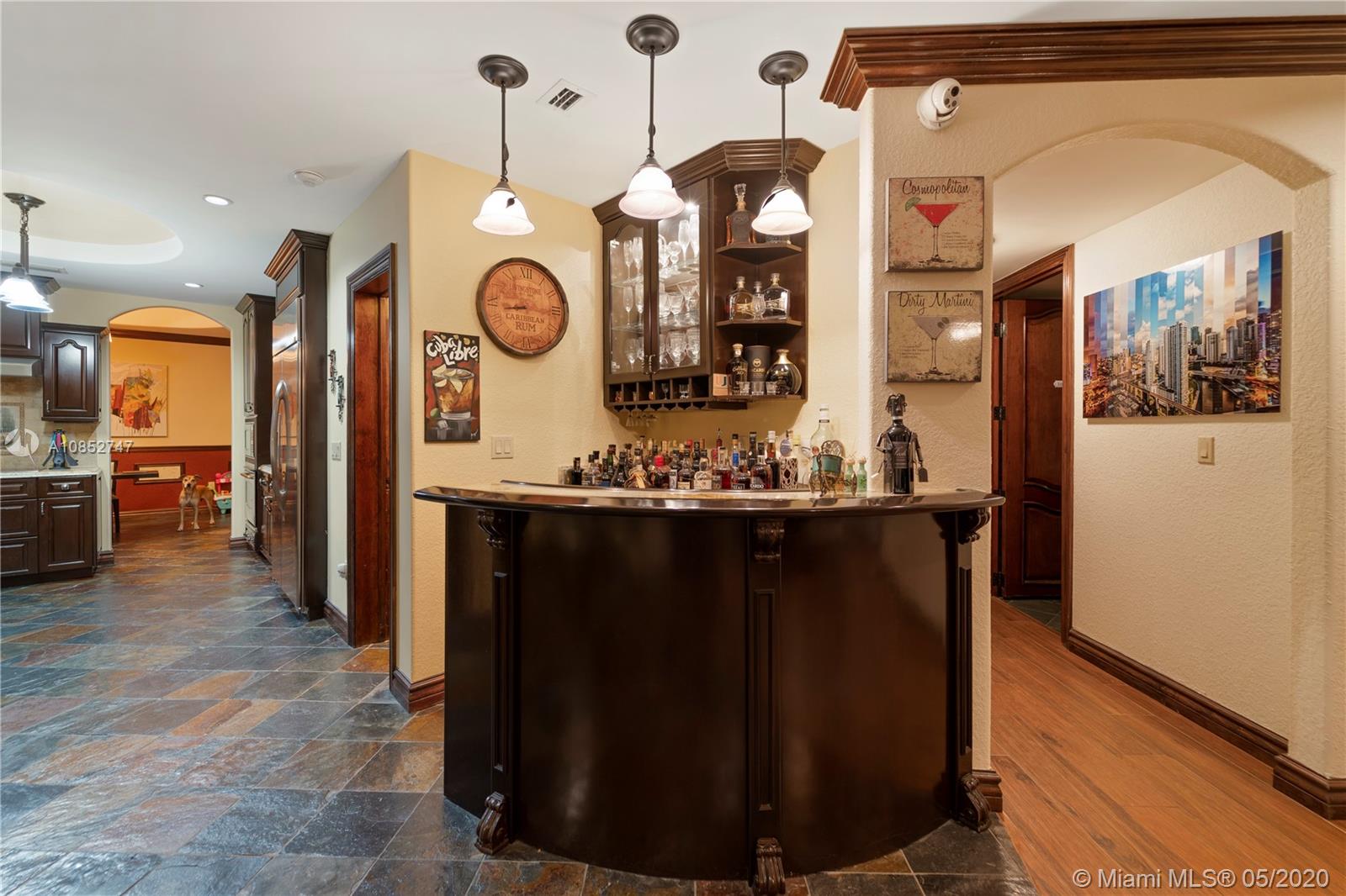 Beautiful, highly upgraded and move-in ready home in sought after Vanderbilt Park-High ceilings-crown molding, custom 10’ solid Mahogany arched doors in picturesque entranceway with stone columns- iron railing spiral staircase.Chef’s kitchen- granite countertops-custom backsplash-high end appliances-huge walk-in pantry, and vibrant stained glass windows/doors.Built-in wet bar-TV entertainment center with indoor/outdoor sound system. All bathrooms upgraded with tile mosaic on walls and natural stone floors. Large walk-in closets with built-ins.All Impact/hurricane doors and windows. Indoor/outdoor security cameras. Wi-Fi enabled alarm system, ACs, entrance swing gate-3 car garage-Architectural landscaping with lighting. Every detail of this house was carefully selected and quality crafted.