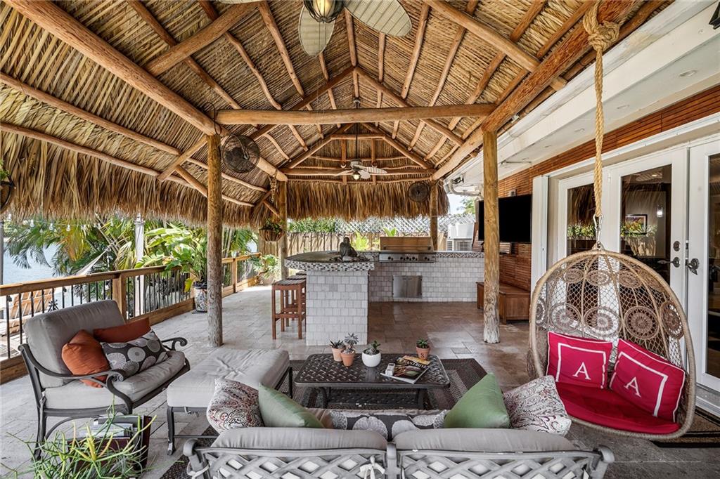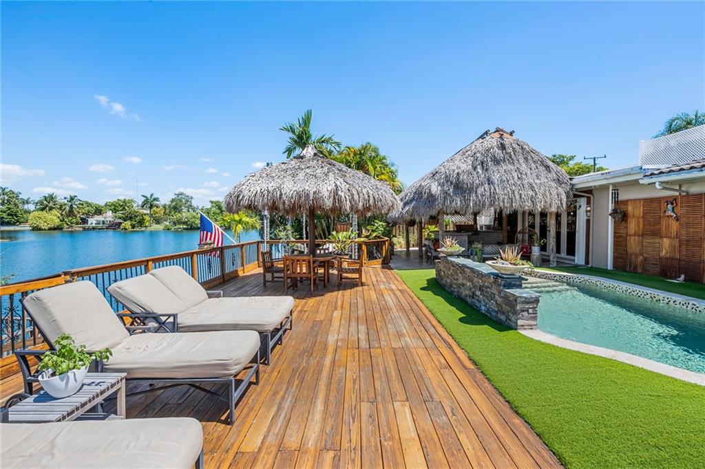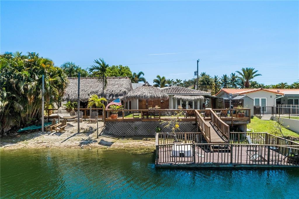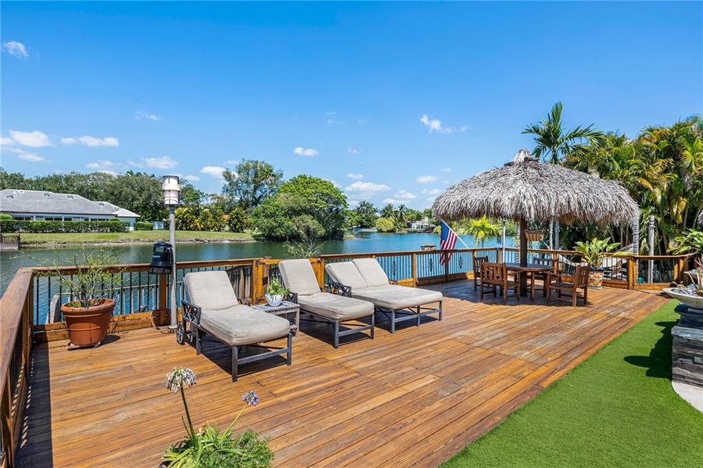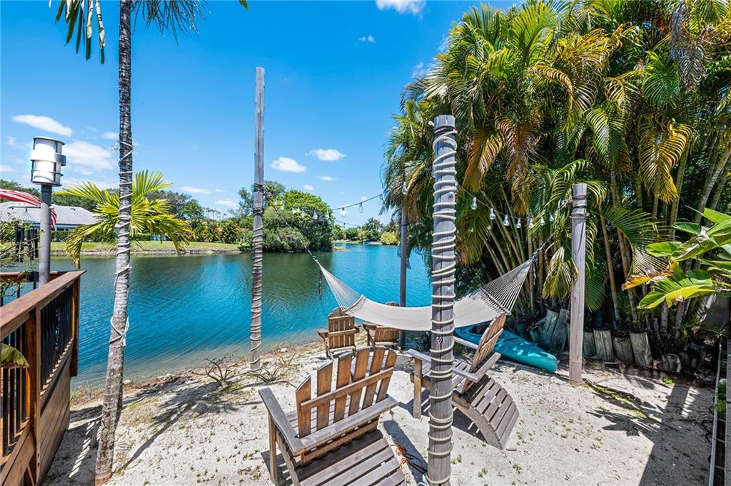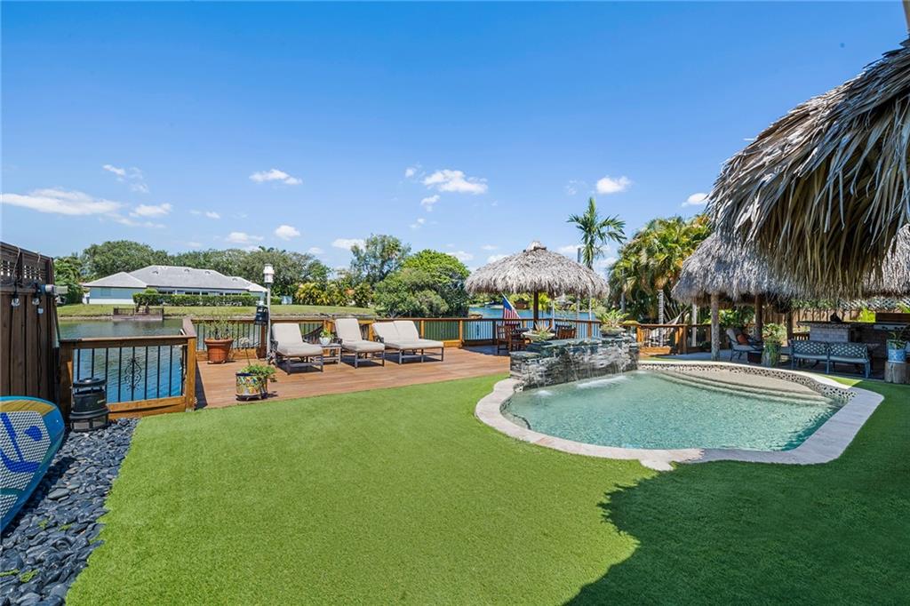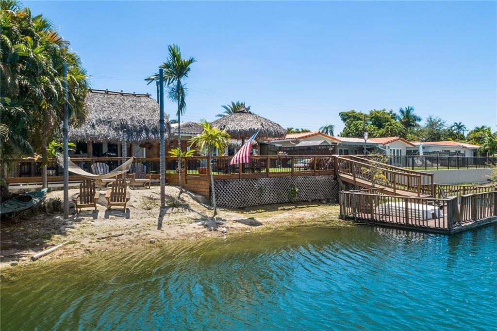 Imagine drinking your coffee under the tiki hut with electric fans, listening to a waterfall and looking at the lake. This home has a vibe you can't afford to miss. Four bedrooms and 3 bathrooms, 24x24 marble floors except wood floors in office. All impact glass windows and front doors. French doors in back have accordion shutters. Outdoor kitchen with teak wood table and chairs, TV and teak walls with deck, floating dock, and sand beach entry to the lake. You can paddle board and fish off your own dock. Updated master bath and kitchen with stainless appliances. Circular driveway. Storage shed on side of house with bamboo decor. Lush landscaping. Top rated schools and walk to houses of worship.
