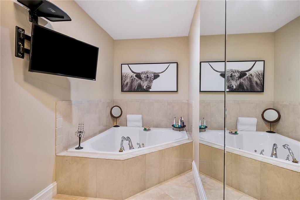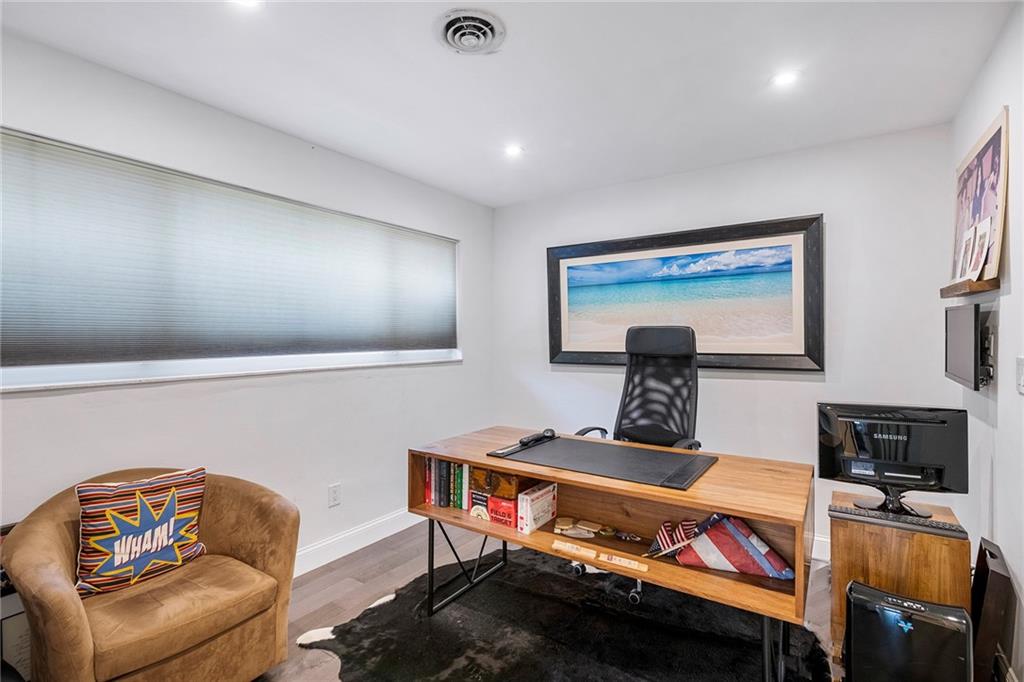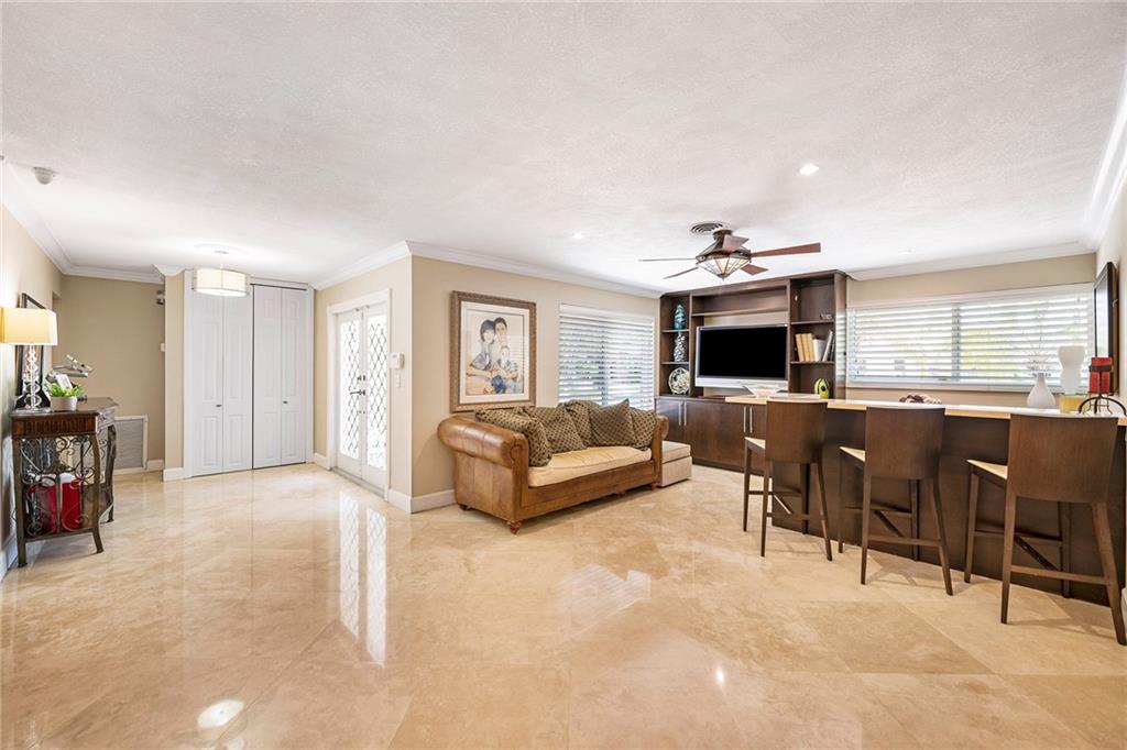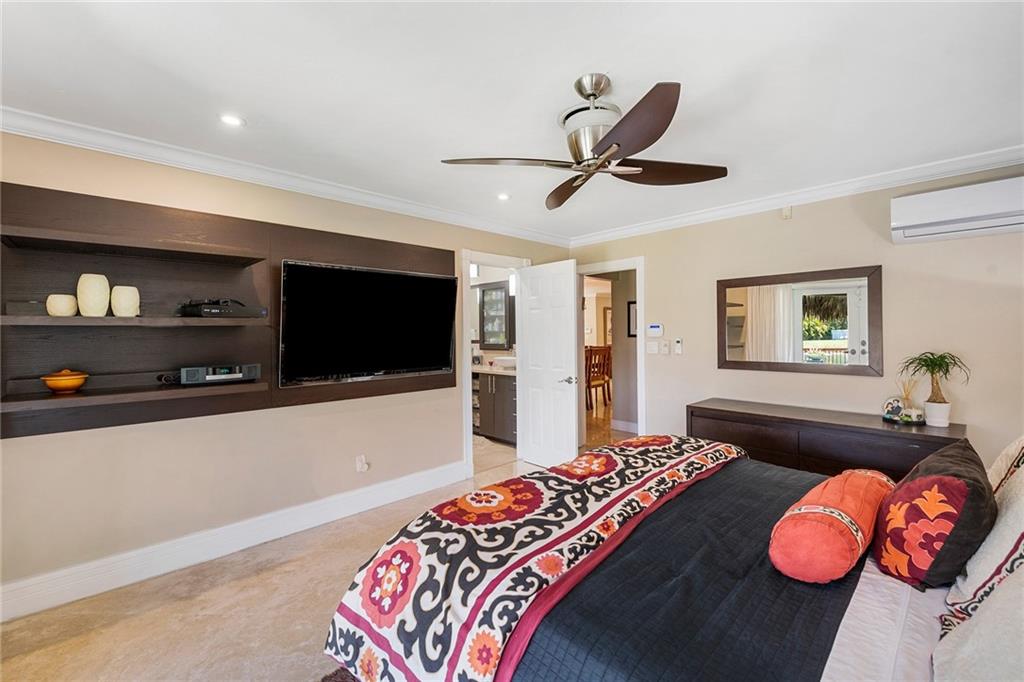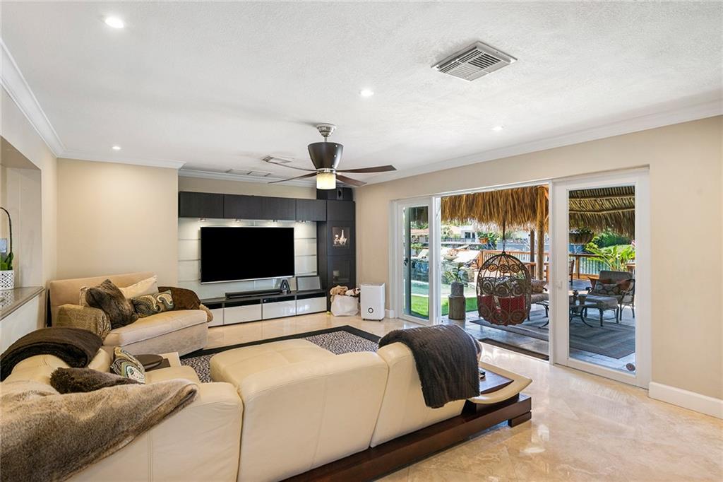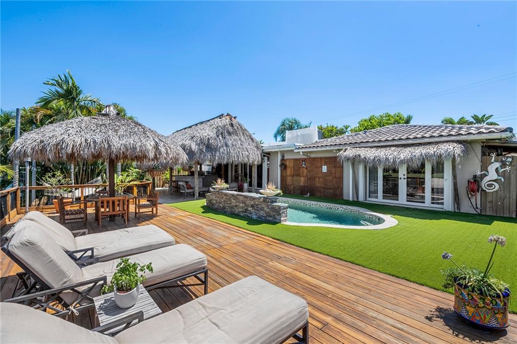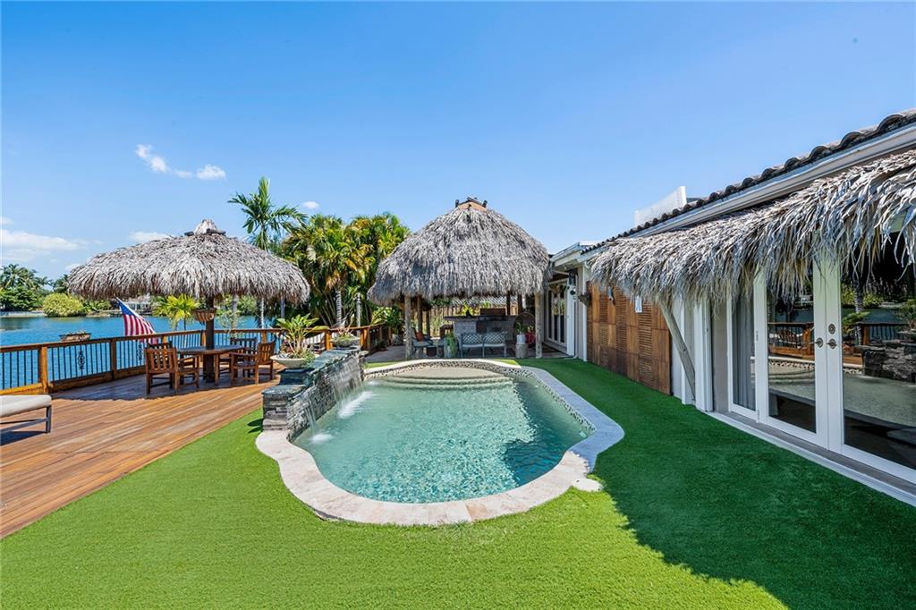 Imagine drinking your coffee under the tiki hut with electric fans, listening to a waterfall and looking at the lake. This home has a vibe you can't afford to miss. Four bedrooms and 3 bathrooms, 24x24 marble floors except wood floors in office. All impact glass windows and front doors. French doors in back have accordion shutters. Outdoor kitchen with teak wood table and chairs, TV and teak walls with deck, floating dock, and sand beach entry to the lake. You can paddle board and fish off your own dock. Updated master bath and kitchen with stainless appliances. Circular driveway. Storage shed on side of house with bamboo decor. Lush landscaping. Top rated schools and walk to houses of worship.