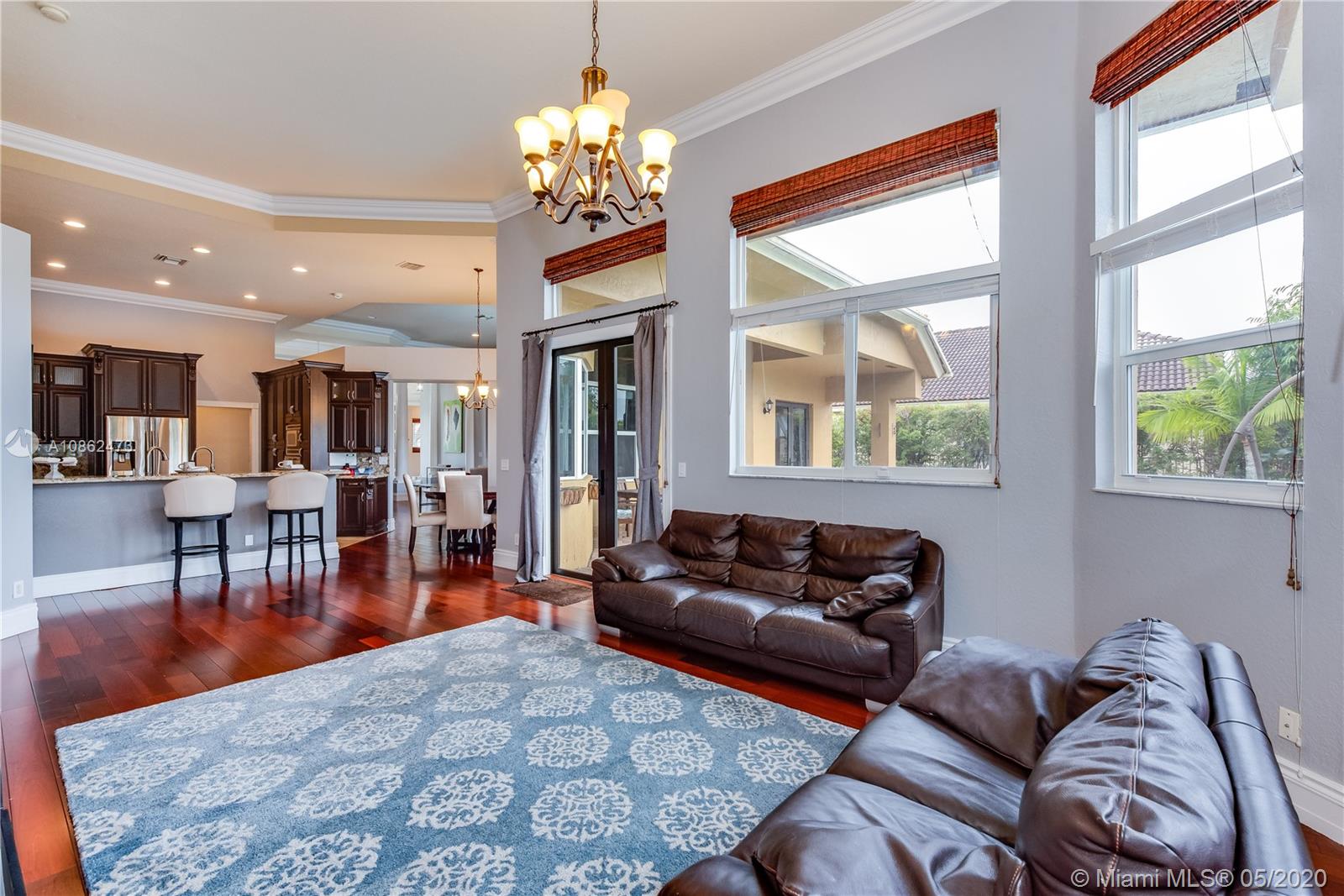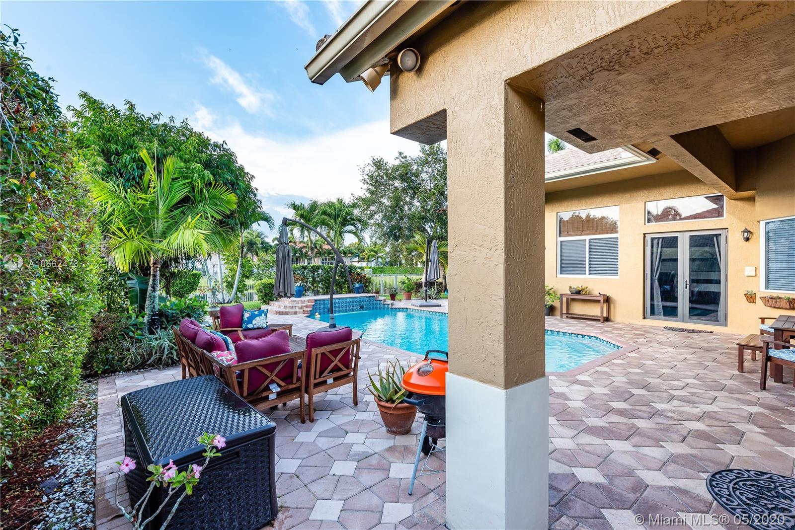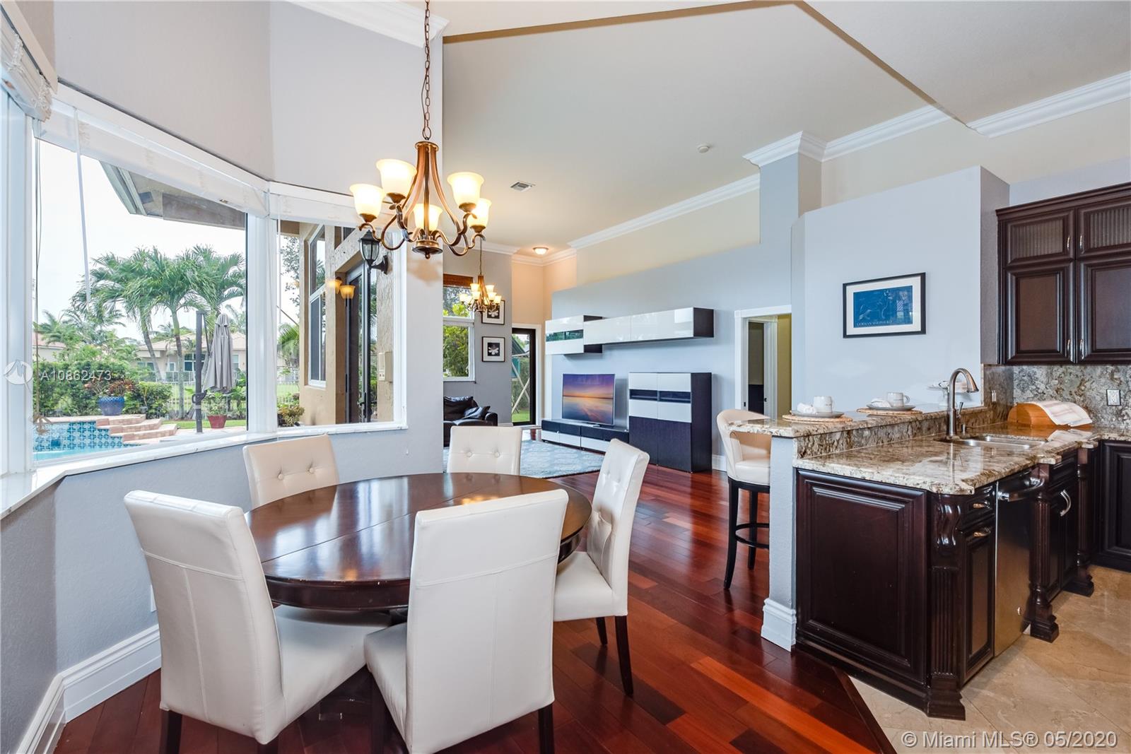 WOW! FULLY UPGRADED, contemporary 5 true bedrooms ~ 3000 sf under air with an open flowing floor plan, high ceilings & lots of natural light. Kitchen is a true chef's dream w/ upgraded custom wood cabinetry, gorgeous granite & high-end stainless package. Elegant foyer leads to triple split bedroom plan w/ 4 updated full baths. Beautiful marble, hardwoods, crown moldings, central vac & built in cabinetry including a contemporary backlit bar area. Step outside to a true Florida paradise with 11,471 sf BIG lot, covered patio, sparkling pool, fruit trees, breezy water AND lush green golf course views. Terrific hurricane protection and insurance discounts with full IMPACT WINDOWS & DOORS including garage. Wonderful gated community w/ an excellent central Davie location. BEST SCHOOLS!