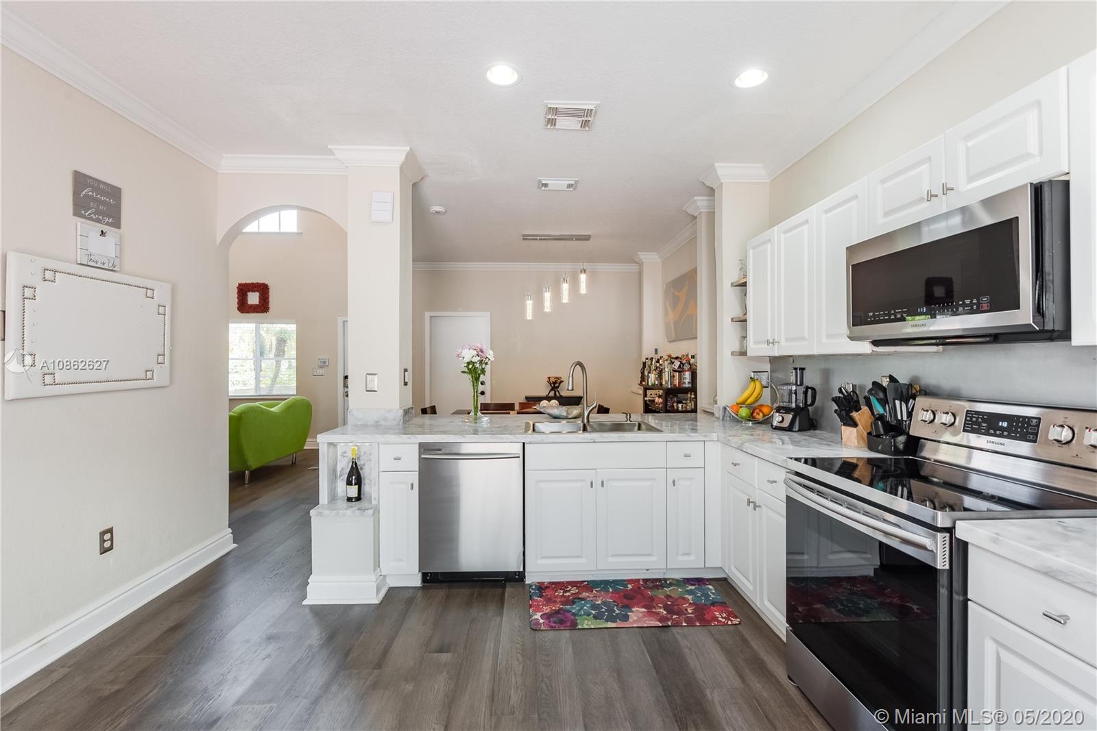 Hurry, hurry, hurry. This one is fully upgraded AND ready to SELL! Perfect open concept with GORGEOUS newly remodeled and modern white kitchen with lots of cabinets and counter space. Appliances just a year old. GORGEOUS water resistant vinyl wood floors in JUST the right color. One bedroom and bath on first floor. Big master retreat with redone bath. HUGE patio with green view and plenty of room to entertain and relax. Hurricane shutters and rated garage door. Gated community with pool and recreation. Plenty of guest parking available. Great location close to charter school and Vizcaya park.