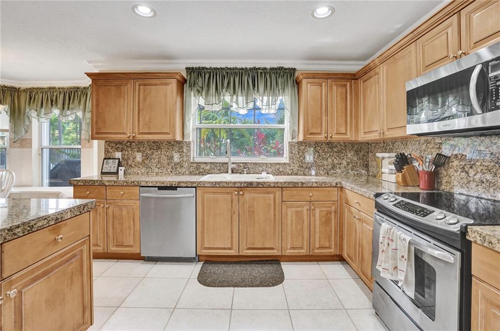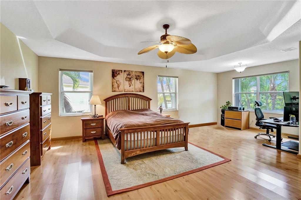 Gorgeous 5 bedroom + Loft/3 bath/3 Car Garage home located in a quiet cul-de-sac with extensive lot (over a quarter acre! One of the largest lots in the community) in desirable guard-gated community of Silver Shores, excellent location with "A" rated schools screened in patio and separate fenced in Pool! Lots of fruit plants & trees in this huge yard, even has a basketball court!. This spacious home boasts 3417 Living Square feet and features soaring ceilings, lots of natural light, accordion hurricane shutters, stainless steel appliances, granite countertops, wood cabinets, tile & wood laminate floors throughout (no carpet), 1 bedroom & full bathroom downstairs, spacious Master bedroom with elegant tray ceiling + 3 other bedrooms + loft upstairs, crown molding, near everything
