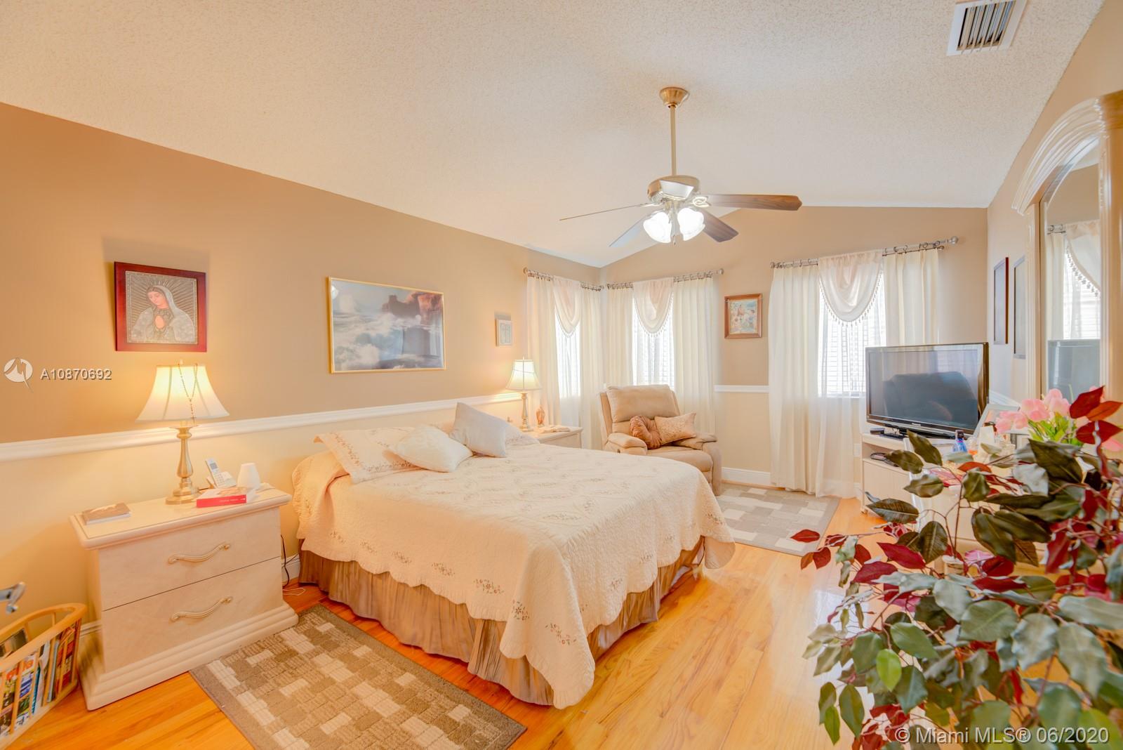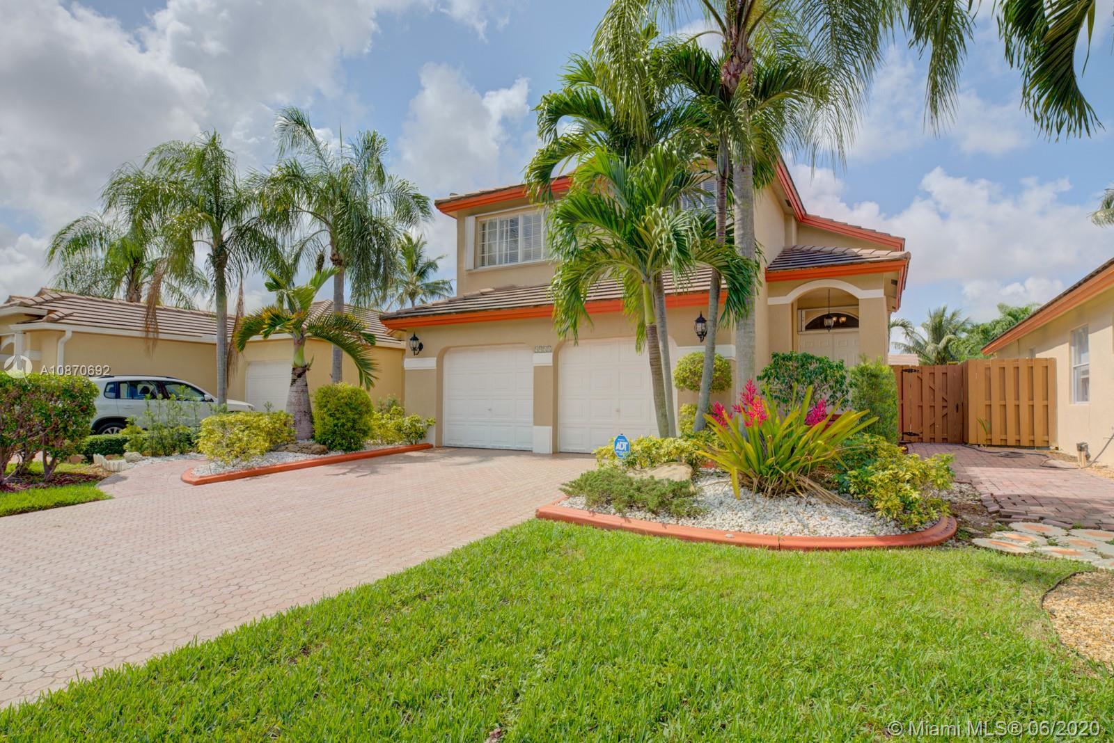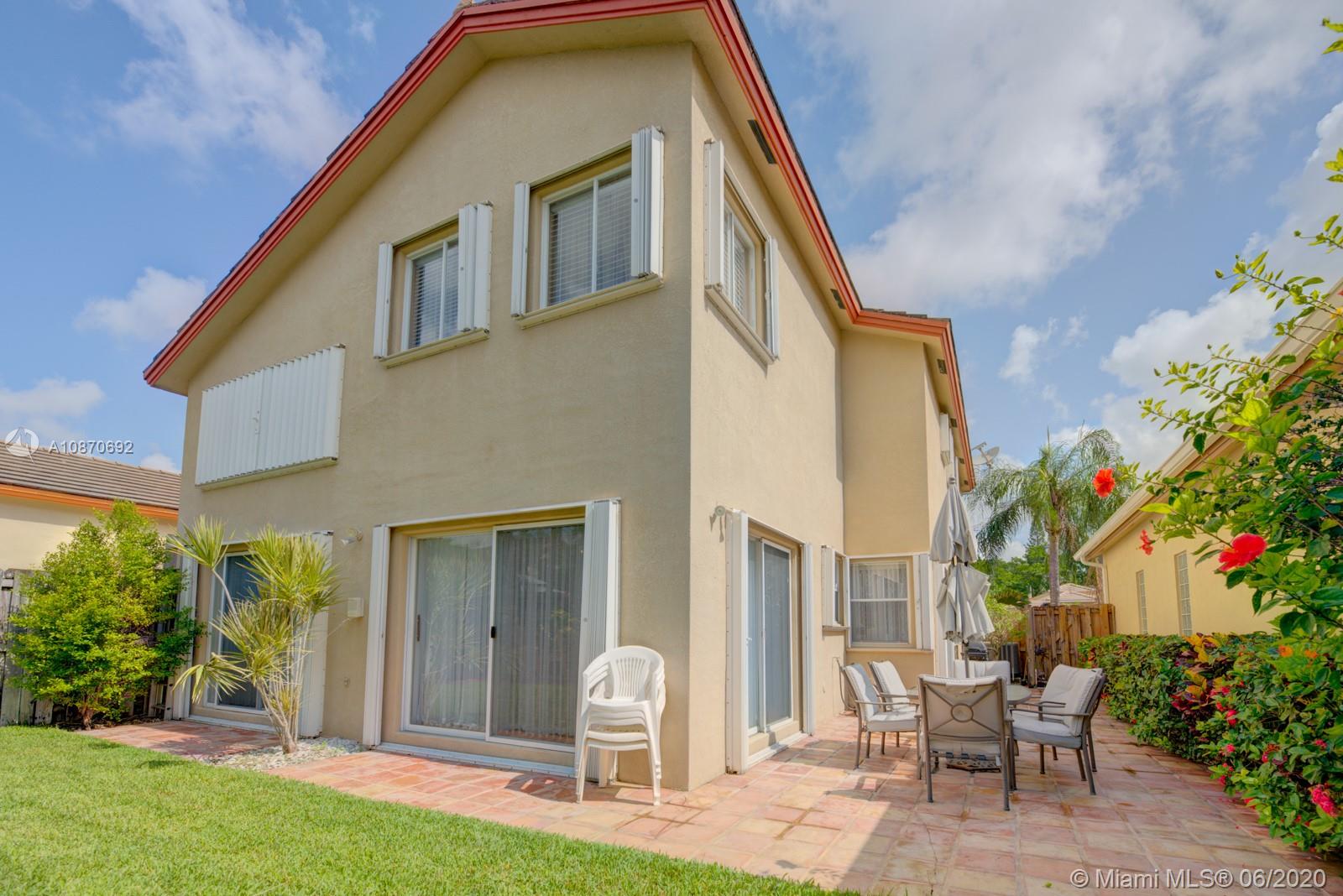 Beautiful 3 bedroom, 2.5 baths + family room home with 2 car garage, located in the highly desirable family friendly community of Costa Verde in Doral. This property has a new A/C unit. Spacious kitchen with quartz countertops. Handmade Saltillo/terra cotta tile downstairs and hardwood floors in the stairways and second floor level. Large master bedroom with double door entry and cathedral ceiling with large walk-in his & hers closet. Master bathroom with roman tub & shower. Hurricane accordion shutters throughout. Impeccably manicured backyard. Property located near Publix, Dolphin and International Malls, great restaurants & shopping areas. Low HOA fee, $219 per month includes 24 hr security, pool and children's playground. Your New Home Awaits! OWNER IS VERY FLEXIBLE WITH SHOWING TIMES