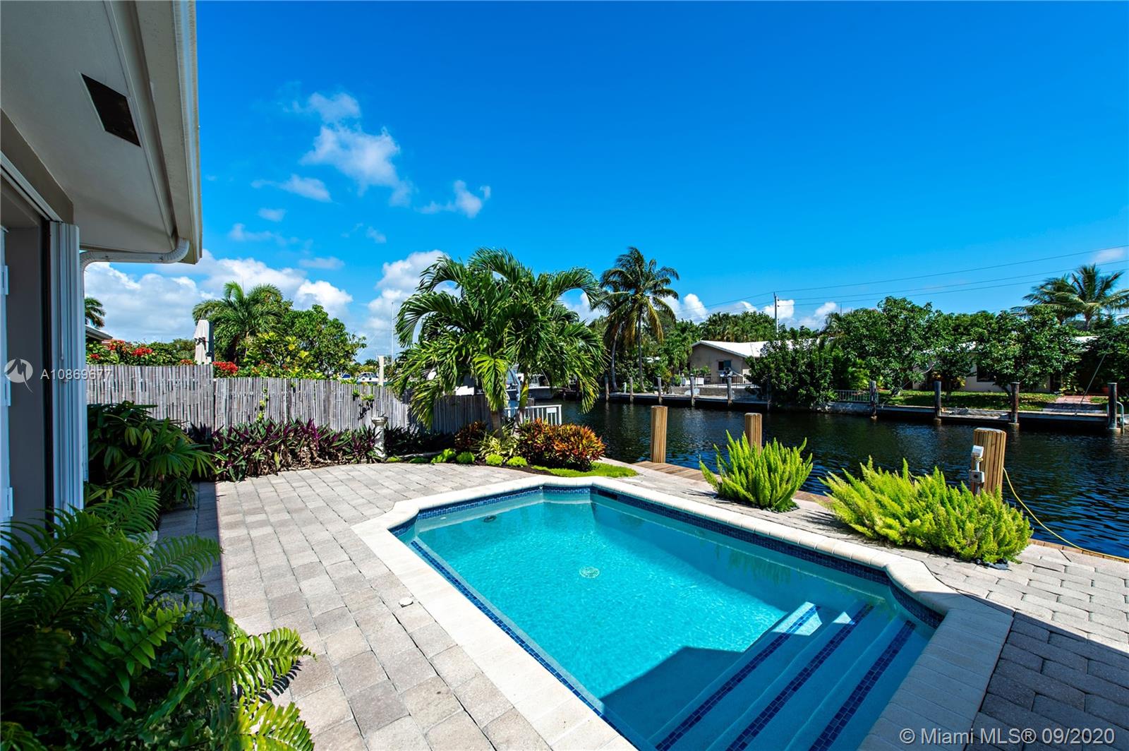 Charming, updated, Pompano Isles 3 B/R, 3 Bath, waterfront Home. Very social neighborhood! Deep water Dock, 350 yards to Intracoastal, no fixed bridges! Split Floor Plan. Views of Pool & Water from almost every room! Chefs Kitchen, bar seating, lots of glass, Entertainers dream! Expanded cabinetry, 2 under counter wine coolers. Large Master Suite with laundry room, twin shower & walk in closet with built in drawers, shelves and hanger system. Updated Tikki Hut used as outside room for entertaining, dinner parties and watching sports. New dock, boat lift, garage, bi fold hurricane shutters. You can easily walk to restaurants and shopping.
