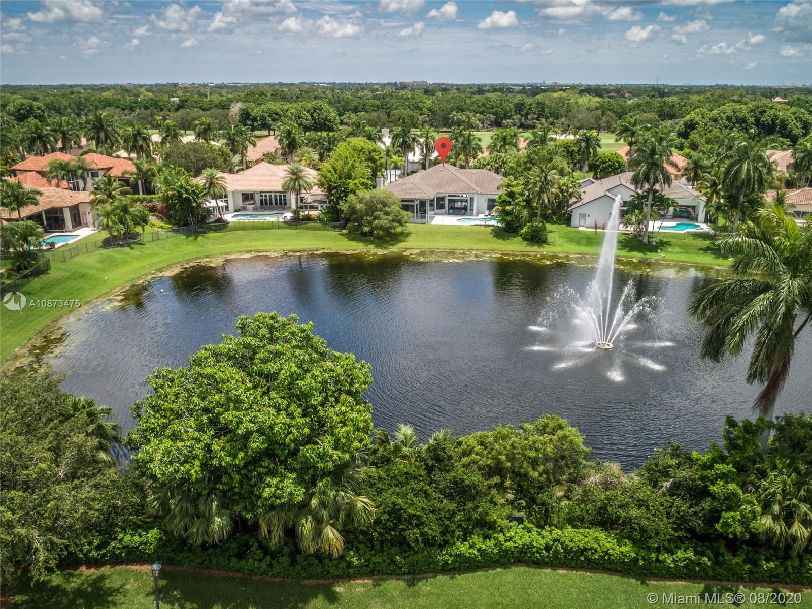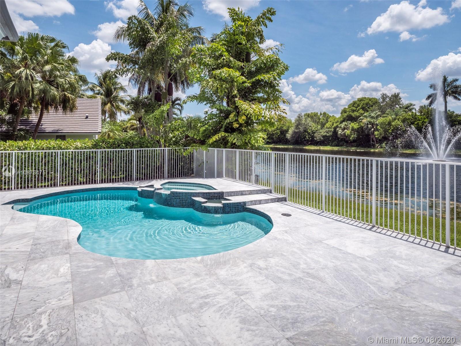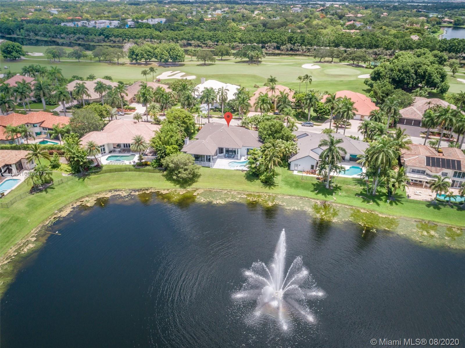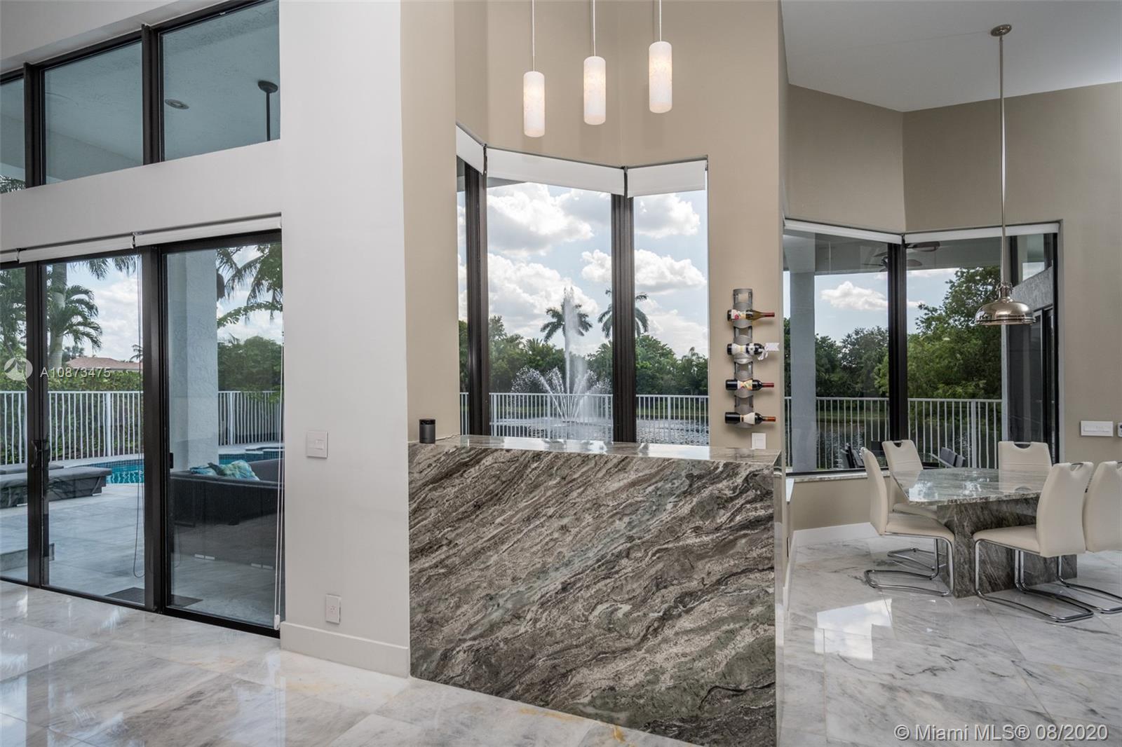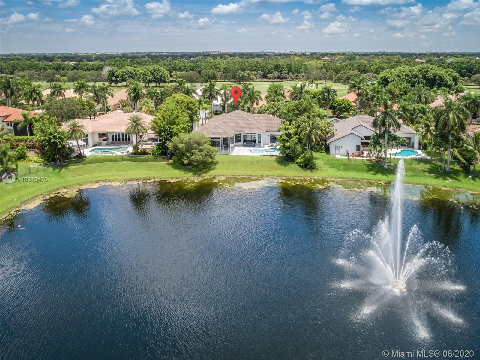 Views Views Views Backing to your own private lake with no neighbors behind with views of the fountain. This custom 4 bedroom home plus office has been transformed. Total Renovations from top to bottom. Brand new Roof and full impact windows. Top of the line Marble flooring throughout the home. Open floorplan concept with wonderful living and entertainment space. European kitchen featuring Stainless steel appliances, Jenn Air -5 burners, grand waterfall center island, convection oven, wall oven, warming drawer. Custom bar in the living room. All baths renovated in marble. Enjoy 3 bedroom ensuites plus office. Freeform heated pool renovated with marble patio, fully fenced private yard with lush landscaping. Marble master bath with his/her toilets, free-standing vessel tub.