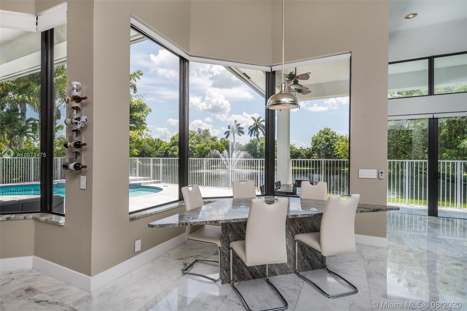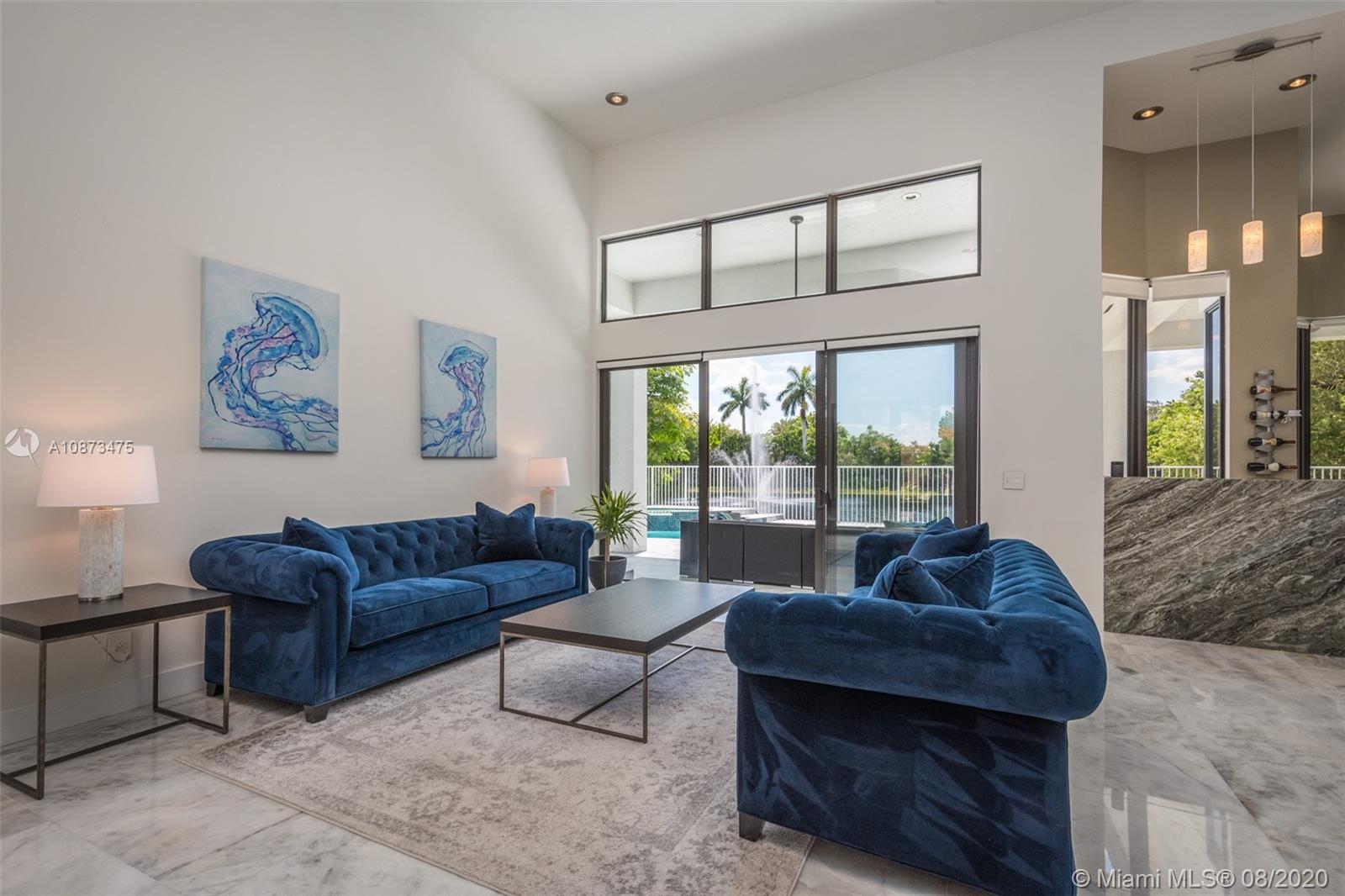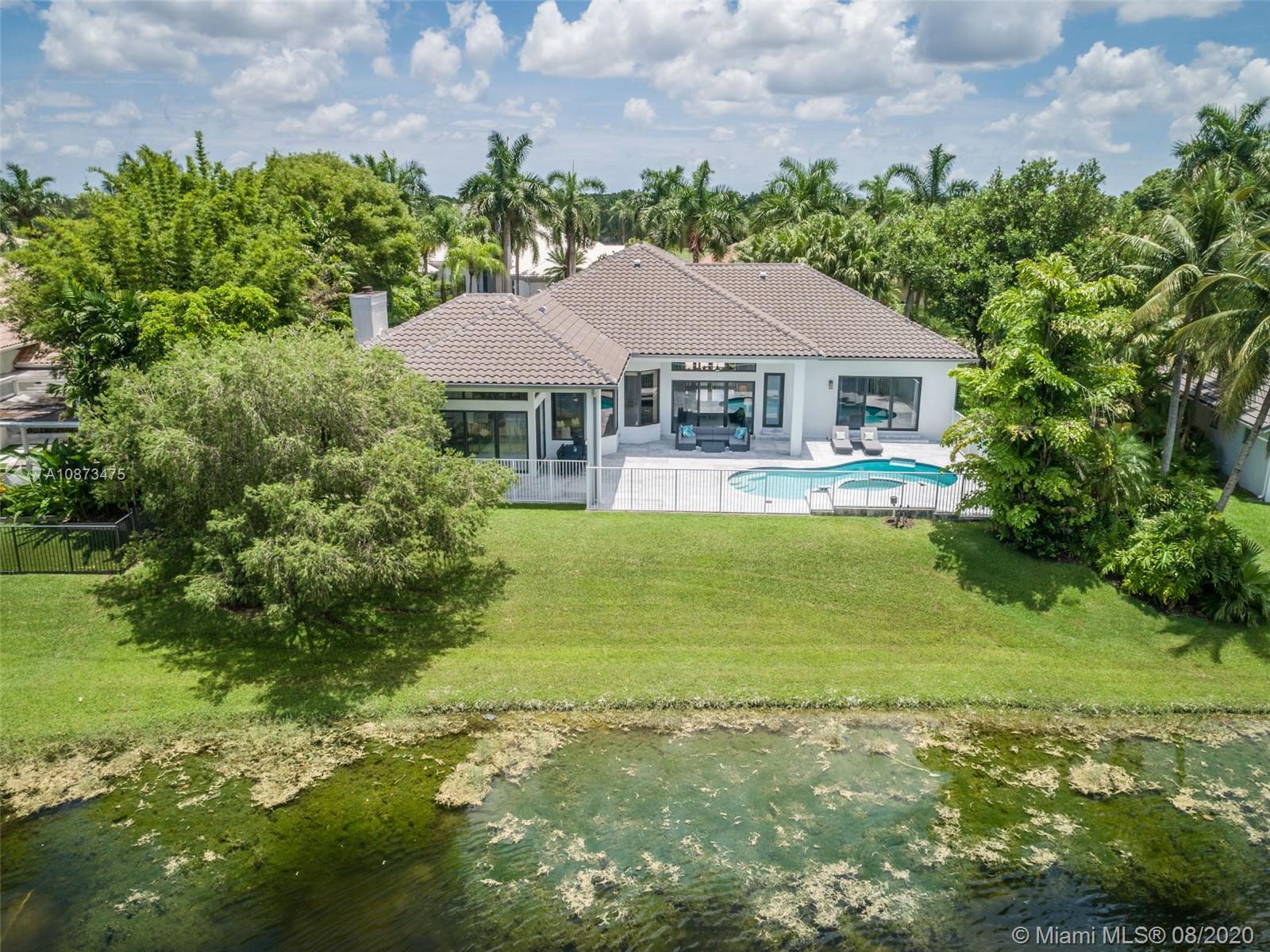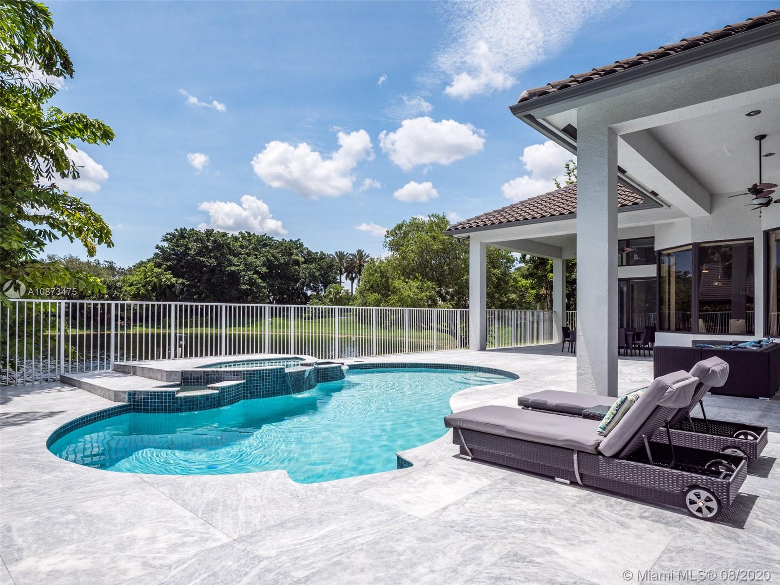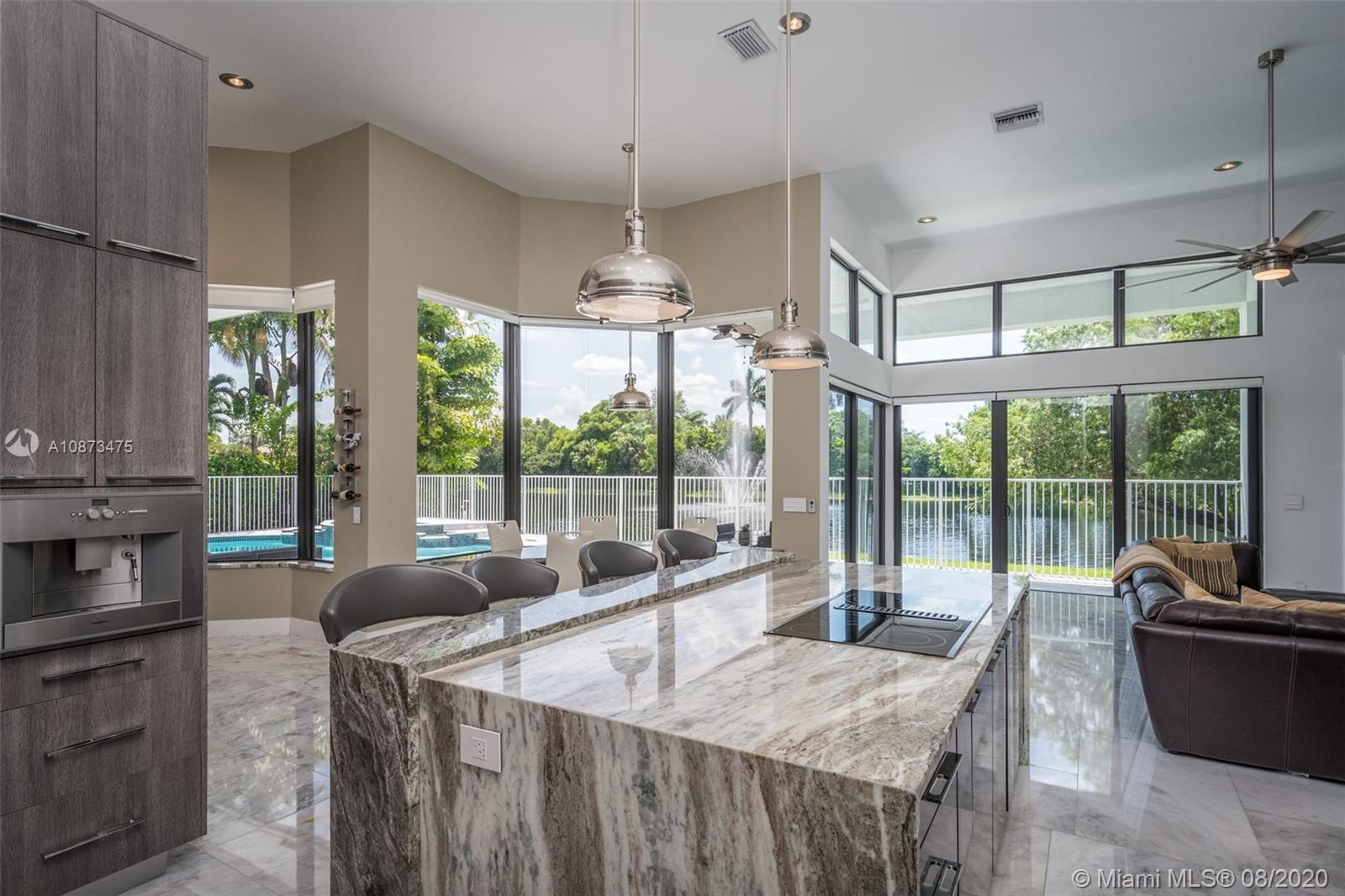 Views Views Views Backing to your own private lake with no neighbors behind with views of the fountain. This custom 4 bedroom home plus office has been transformed. Total Renovations from top to bottom. Brand new Roof and full impact windows. Top of the line Marble flooring throughout the home. Open floorplan concept with wonderful living and entertainment space. European kitchen featuring Stainless steel appliances, Jenn Air -5 burners, grand waterfall center island, convection oven, wall oven, warming drawer. Custom bar in the living room. All baths renovated in marble. Enjoy 3 bedroom ensuites plus office. Freeform heated pool renovated with marble patio, fully fenced private yard with lush landscaping. Marble master bath with his/her toilets, free-standing vessel tub.