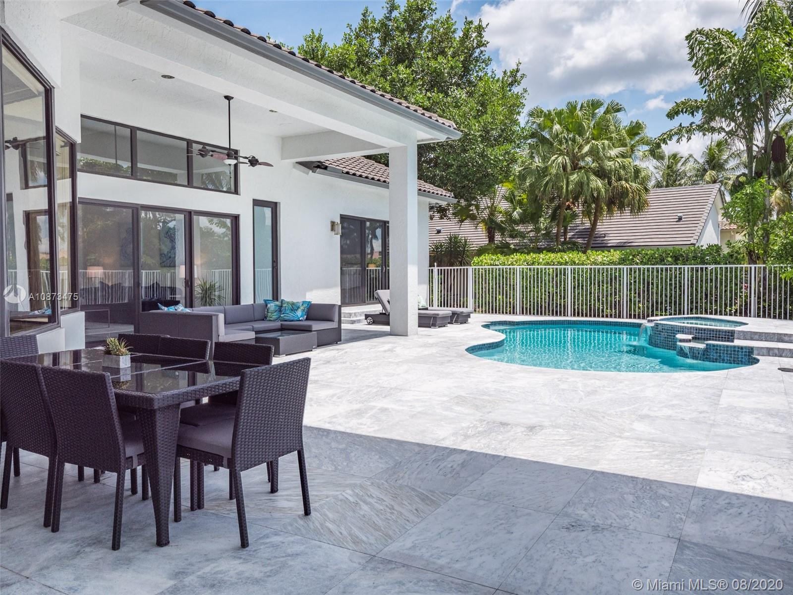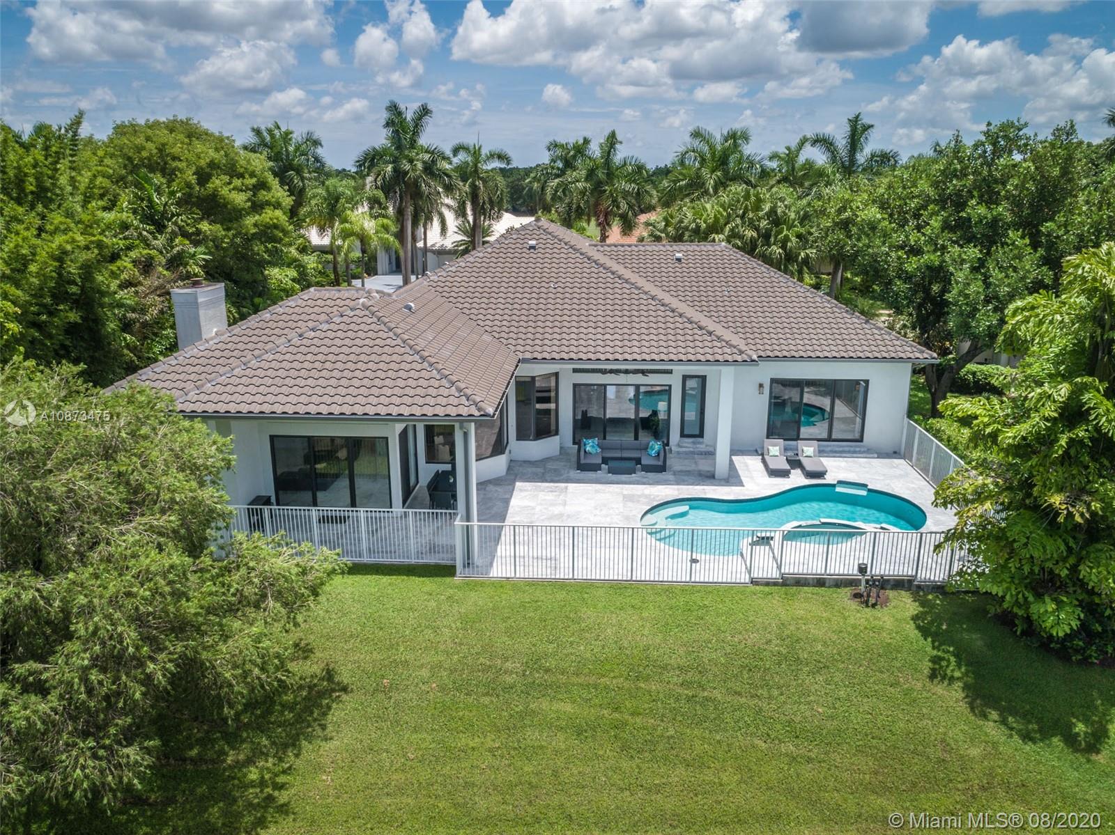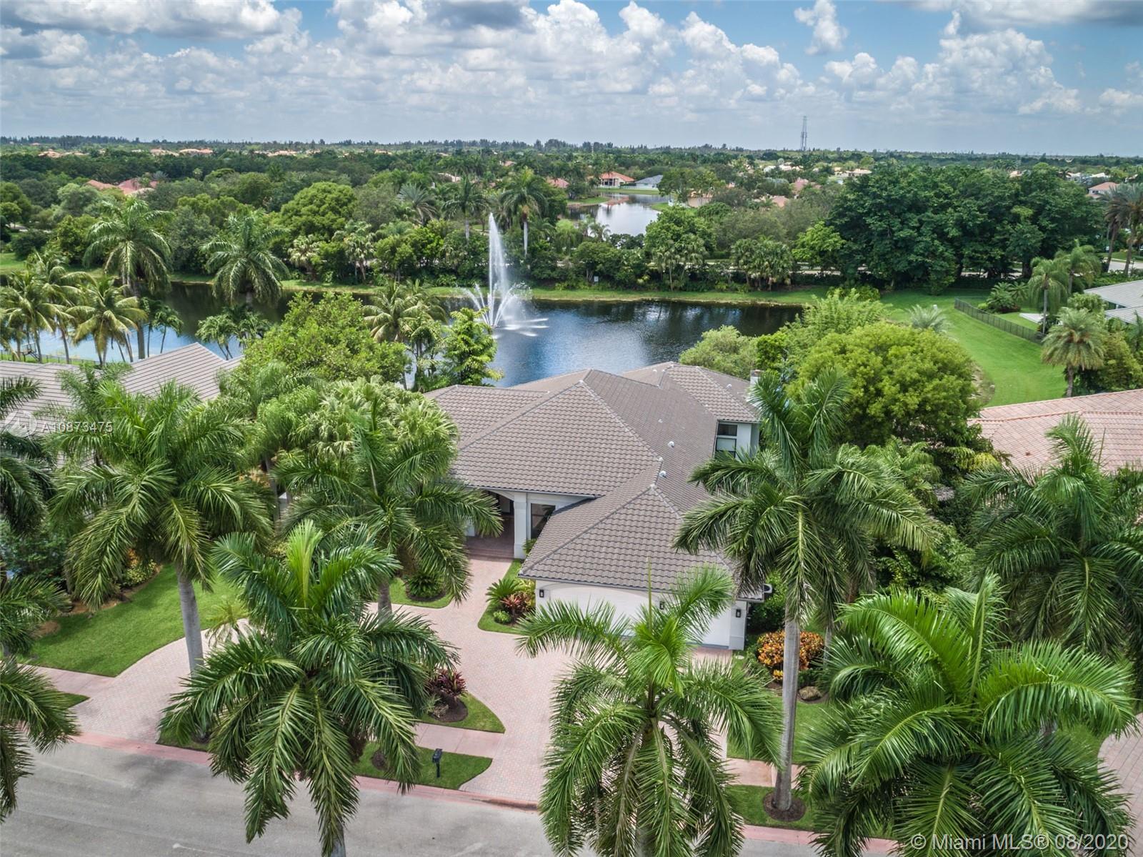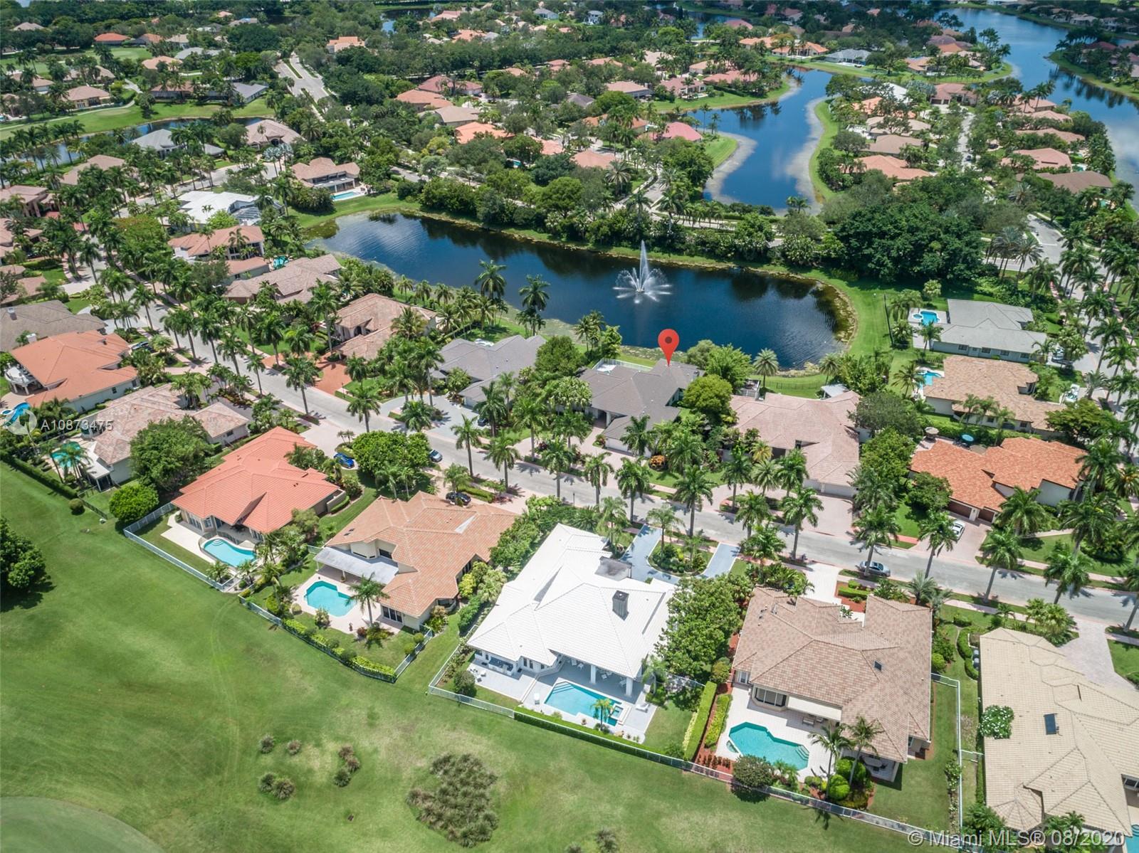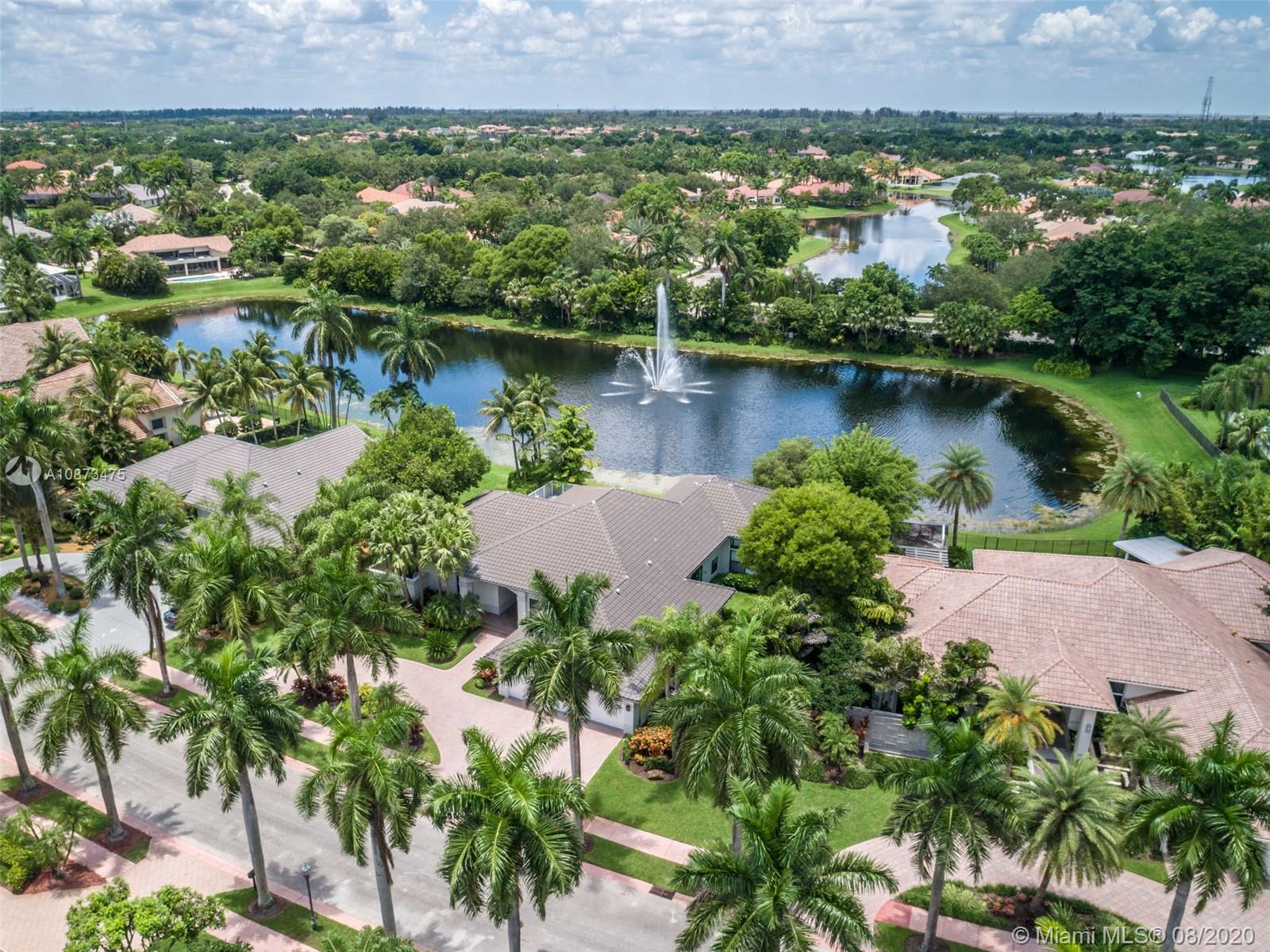 Views Views Views Backing to your own private lake with no neighbors behind with views of the fountain. This custom 4 bedroom home plus office has been transformed. Total Renovations from top to bottom. Brand new Roof and full impact windows. Top of the line Marble flooring throughout the home. Open floorplan concept with wonderful living and entertainment space. European kitchen featuring Stainless steel appliances, Jenn Air -5 burners, grand waterfall center island, convection oven, wall oven, warming drawer. Custom bar in the living room. All baths renovated in marble. Enjoy 3 bedroom ensuites plus office. Freeform heated pool renovated with marble patio, fully fenced private yard with lush landscaping. Marble master bath with his/her toilets, free-standing vessel tub.