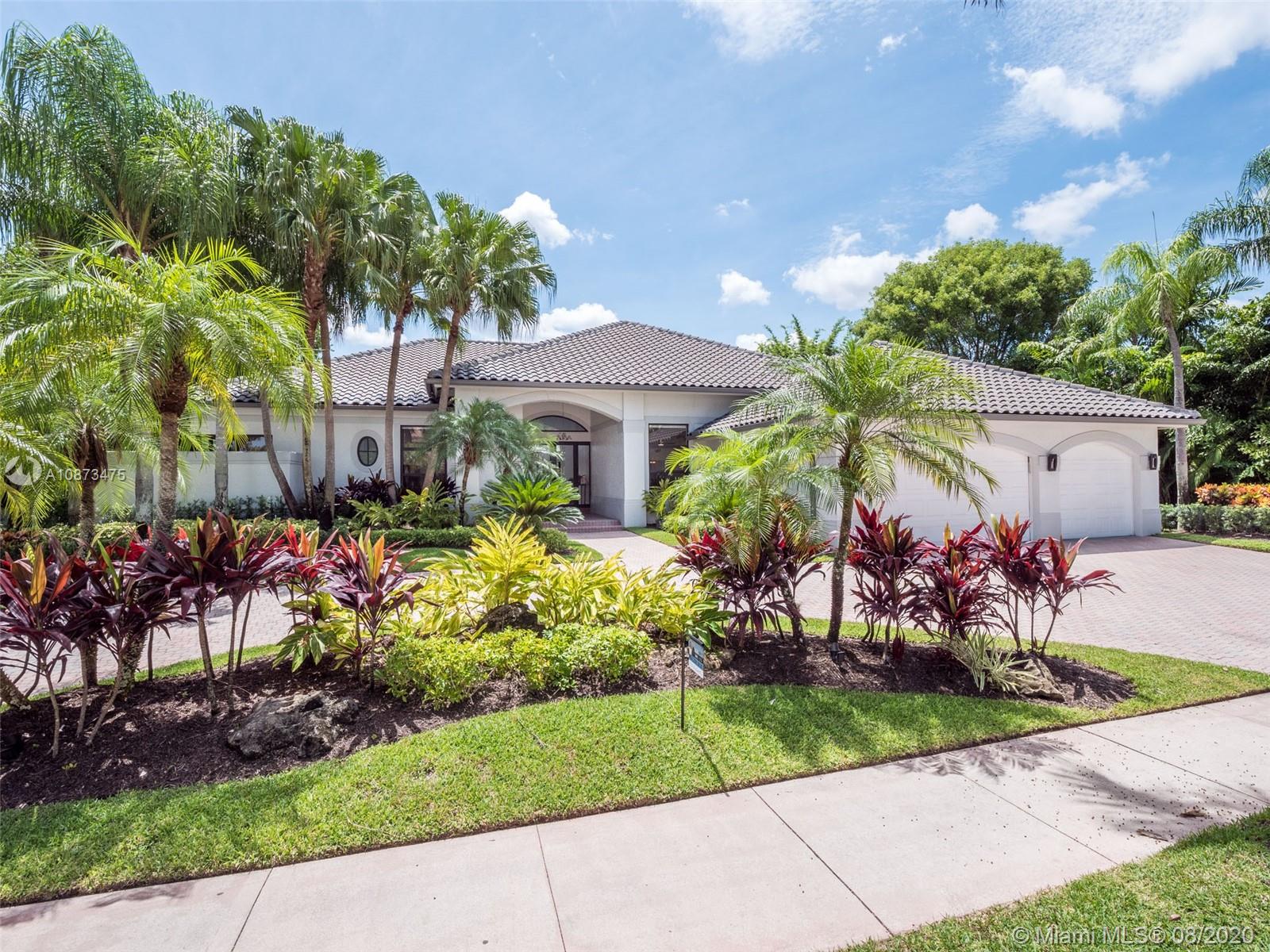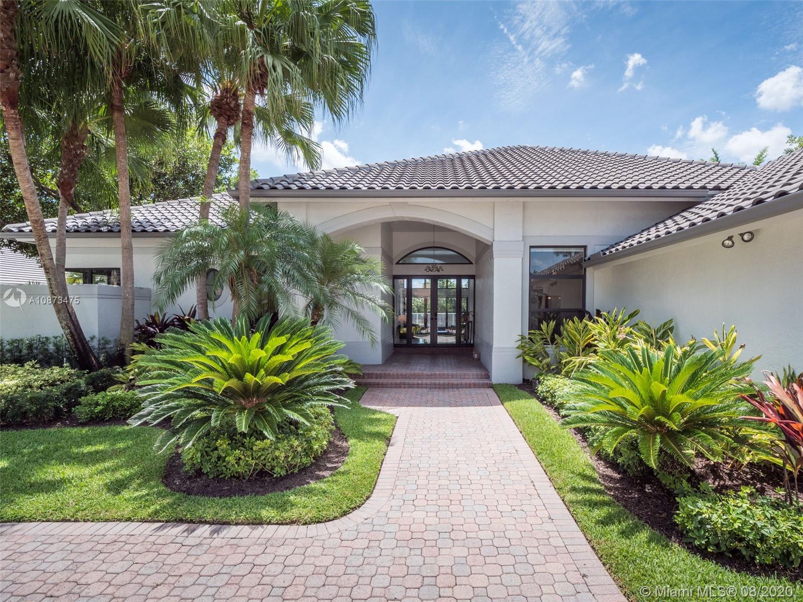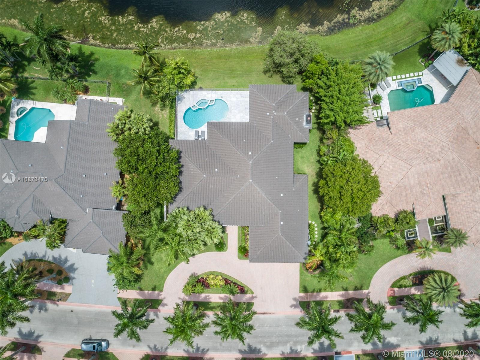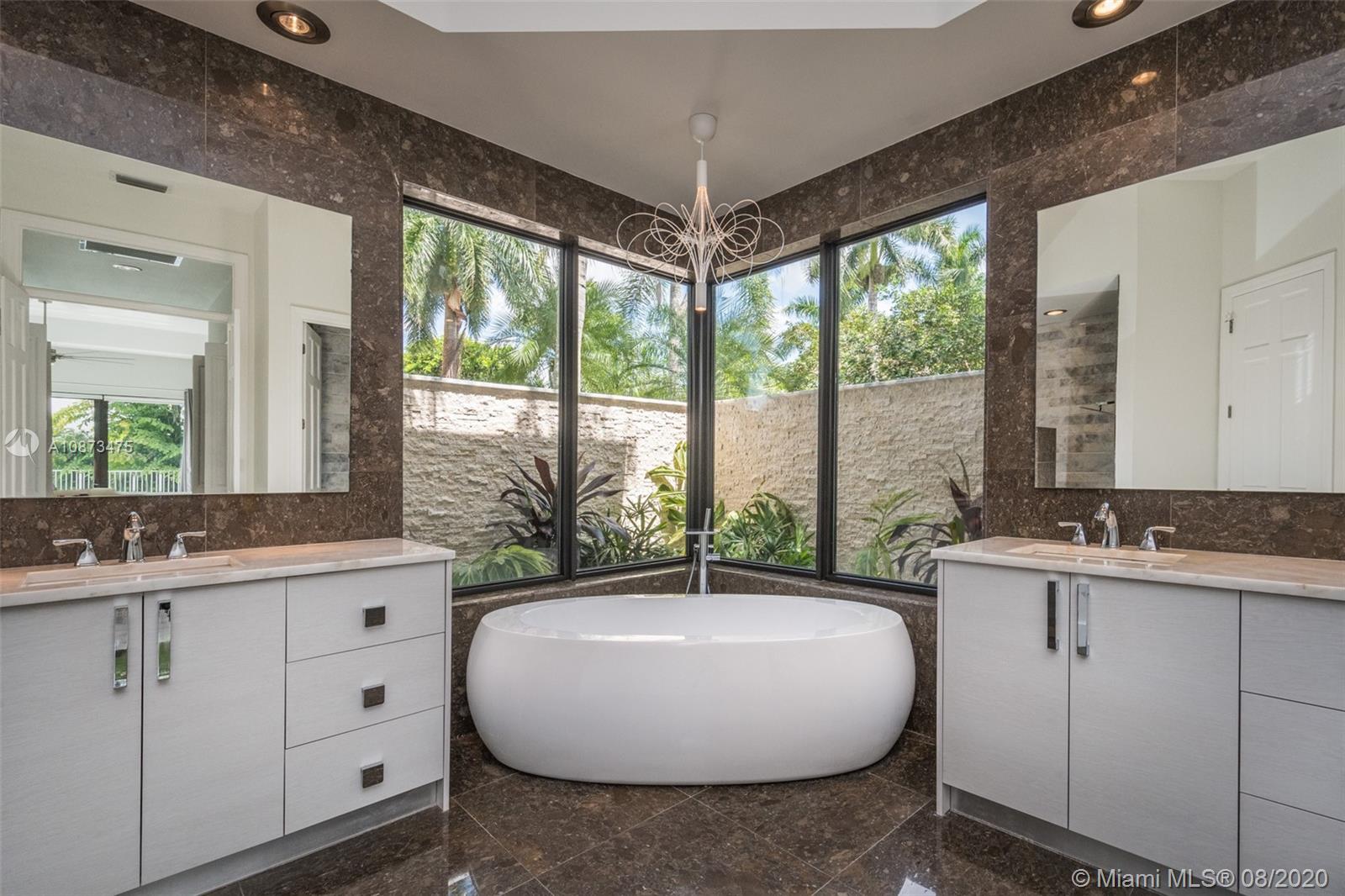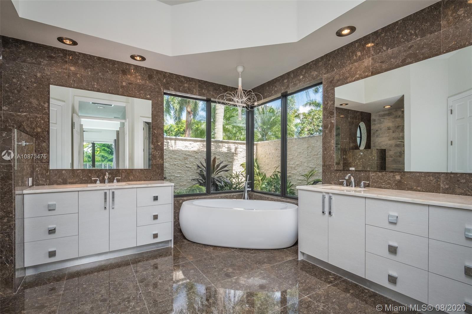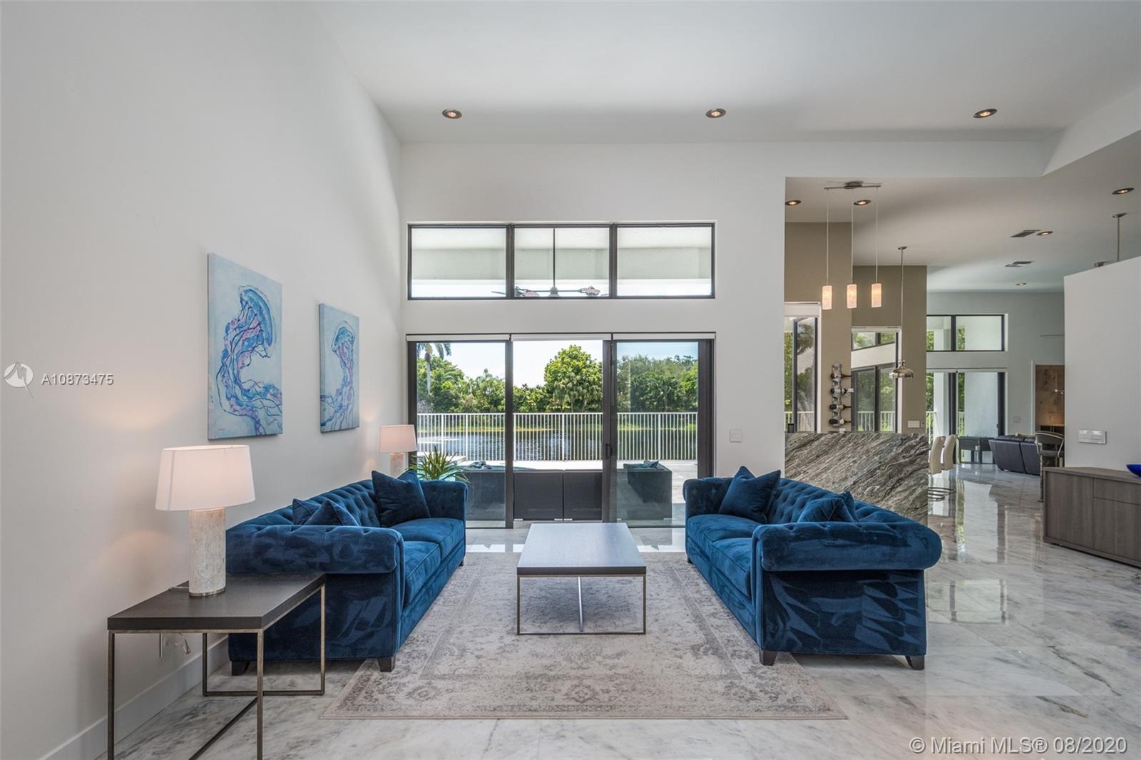 Views Views Views Backing to your own private lake with no neighbors behind with views of the fountain. This custom 4 bedroom home plus office has been transformed. Total Renovations from top to bottom. Brand new Roof and full impact windows. Top of the line Marble flooring throughout the home. Open floorplan concept with wonderful living and entertainment space. European kitchen featuring Stainless steel appliances, Jenn Air -5 burners, grand waterfall center island, convection oven, wall oven, warming drawer. Custom bar in the living room. All baths renovated in marble. Enjoy 3 bedroom ensuites plus office. Freeform heated pool renovated with marble patio, fully fenced private yard with lush landscaping. Marble master bath with his/her toilets, free-standing vessel tub.
